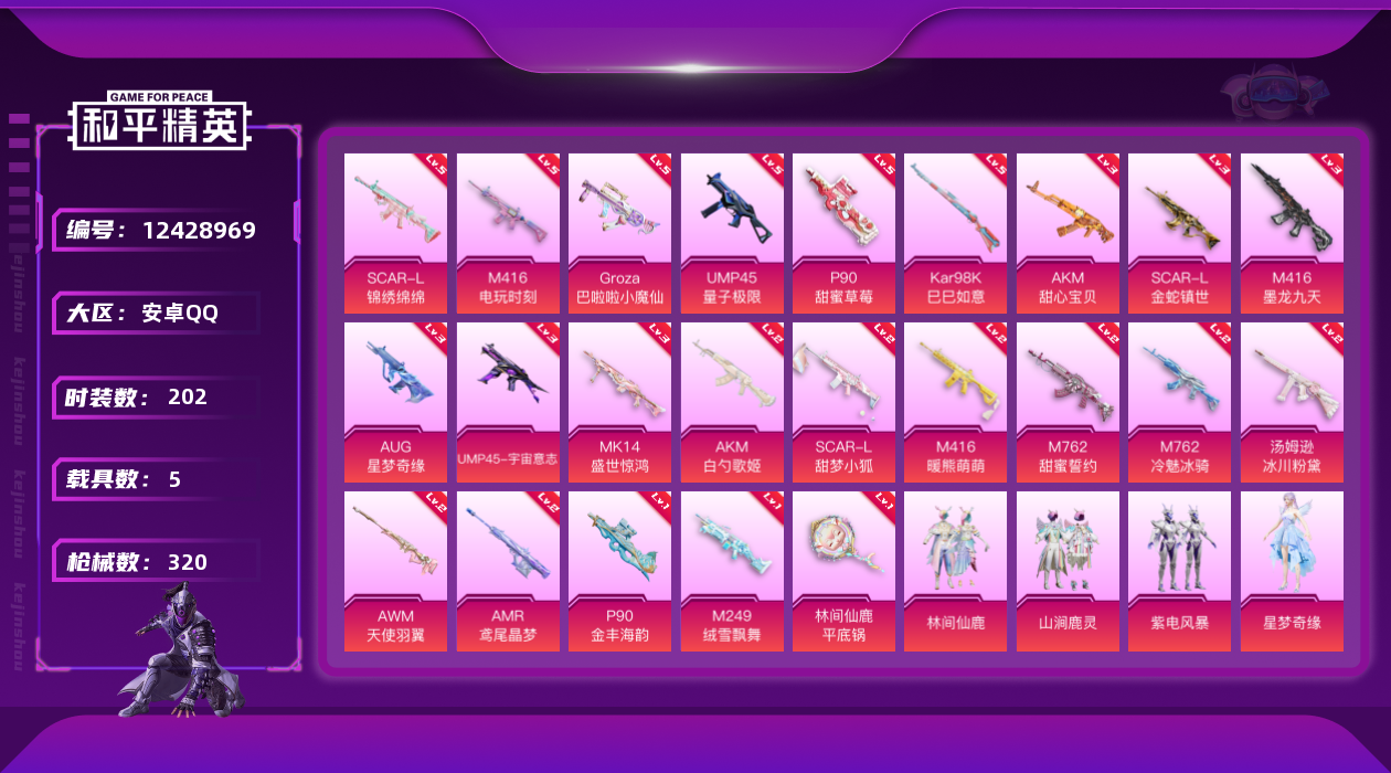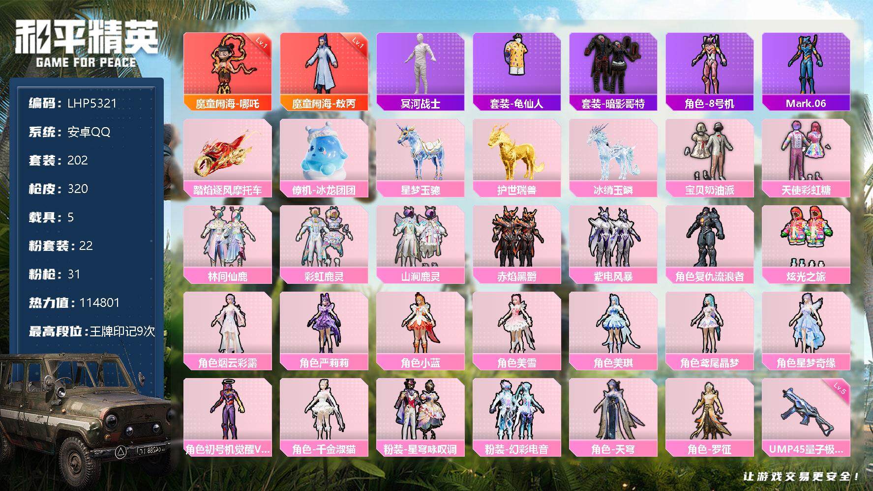 [12428969]素材身法号/老木乃伊/地铁满天赋【特价急出/详情看图】:安卓 手Q-2神装-22粉装-31特效枪-5载具-17粉色飞行器-11.4w热力值-9王牌印记-202套装-320枪皮【红色神装等级】:魔童闹海-敖丙(一级),魔童闹海-哪吒(一级)【热门品类】:套装-冥河战士,套装-龟仙人,套装-暗影哥特,角色-8号机,角色-Mark.06【粉色载具】:踏焰逐风摩托车,僚机-冰龙团团,星梦玉骢,护世瑞兽,冰绡玉鳞【粉色套装】:粉装-宝贝奶油派,粉装-天使彩虹糖,粉装-林间仙鹿,粉装-彩虹鹿灵,粉装-山涧鹿灵,粉装-赤焰黑爵,粉装-紫电风暴,角色-复仇流浪者,粉装-炫光之旅,角色-烟云彩露,角色-严莉莉,角色-小蓝,角色-美雪,角色-美琪,角色-鸢尾晶梦,角色-星梦奇缘,角色-初号机 觉醒Ver.,角色-千金淑猫,粉装-星穹咏叹调,粉装-幻彩电音,角色-天穹,角色-罗征【粉色枪皮等级】:AKM-甜心宝贝(三级),AKM-白勺歌姬(二级),SCAR-L-甜梦小狐(二级),SCAR-L-锦绣绵绵(五级),SCAR-L-金蛇镇世(三级),SCAR-L-魔童闹海 哪吒(三级),M416-暖熊萌萌(二级),M416-电玩时刻(五级),M416-墨龙九天(三级),GROZA-巴啦啦小魔仙(五级),AUG-星梦奇缘(三级),M762-甜蜜誓约(二级),M762-冷魅冰骑(二级),ARX-无垠阁(三级),UMP45-量子极限(五级),UMP45-宇宙意志(三级),汤姆逊-冰川粉黛(二级),AKS-74U-星穹咏叹调(四级),JS9-奇迹舞步(四级),P90-甜蜜草莓(五级),P90-金丰海韵(一级),P90-魔童闹海 敖丙(二级),Kar98K-巳巳如意(五级),AWM-天使羽翼(二级),Mk14-盛世惊鸿(三级),AMR-鸢尾晶梦(二级),M249-绒雪飘舞(一级),DP-28-豹影疾电(五级),MG-36-幻彩电音(四级),MG-36-沧焰双生(五级),平底锅-林间仙鹿(一级)【粉色飞行器】:酣梦熊熊飞行器,圣光天使飞行器,甜蜜草莓飞行器,沙丘之主天马,镜域双华-灵镜之阶,巴啦啦小魔仙飞行器,龙翔九天飞行器,鸢尾晶梦飞行器,星梦奇缘飞行器,深渊漩涡飞行器,凤舞九天飞行器,万象金身飞行器,雀灵庇佑飞行器,飞天猪飞行器,灵珠游龙飞行器