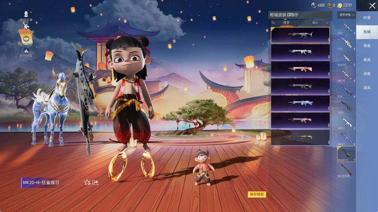 AKM-甜心宝贝,AKM-白勺歌姬,SCAR-L-甜梦小狐,SCAR-L-金蛇镇世,M416-暖熊萌萌,M416-电玩时刻,M416-墨龙九天,GROZA-巴啦啦小魔仙,AUG-星梦奇缘,M762-甜蜜誓约,M762-冷魅冰骑,UMP45-量子极限,UMP45-宇宙意志,汤姆逊-冰川粉黛,P90-甜蜜草莓,P90-金丰海韵,Kar98K-巳巳如意,AWM-天使羽翼,Mk14-盛世惊鸿,AMR-鸢尾晶梦,M249-绒雪飘舞,平底锅-林间仙鹿