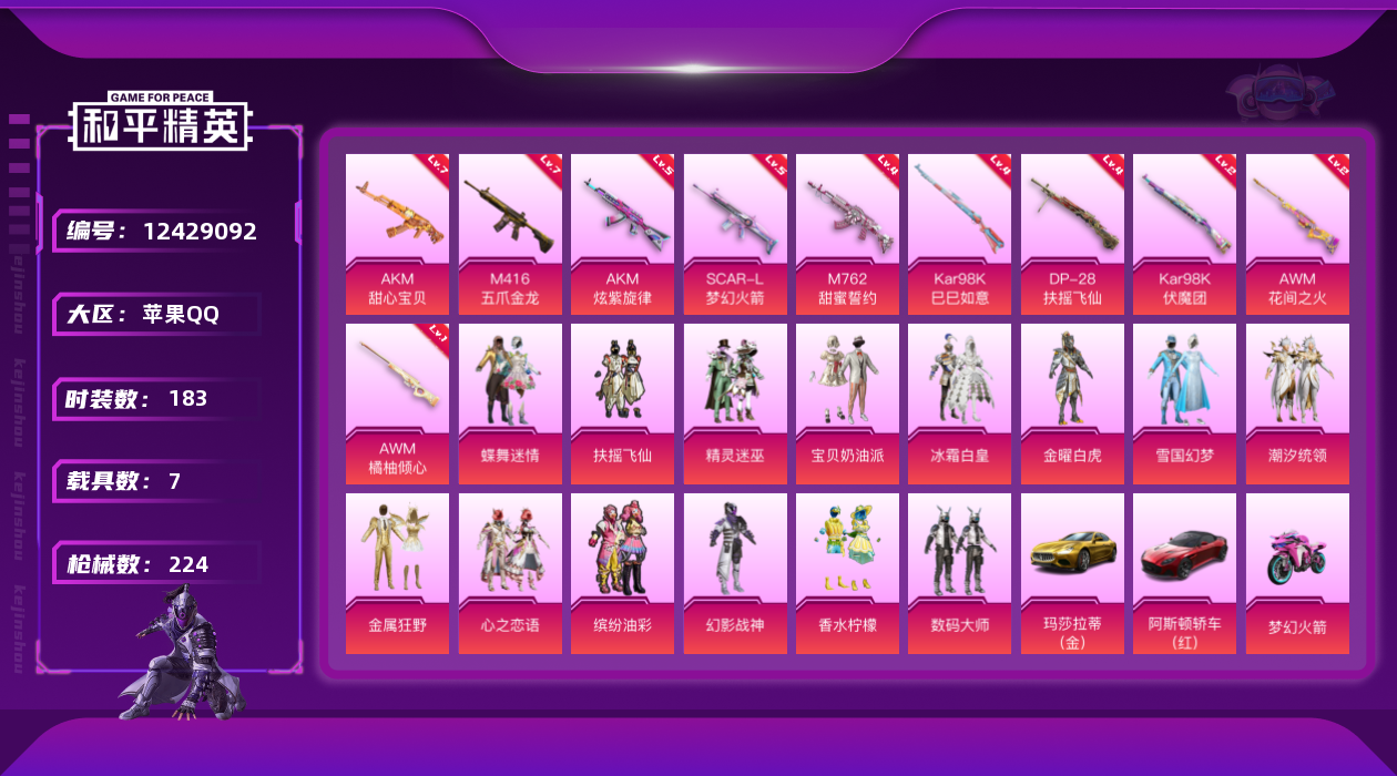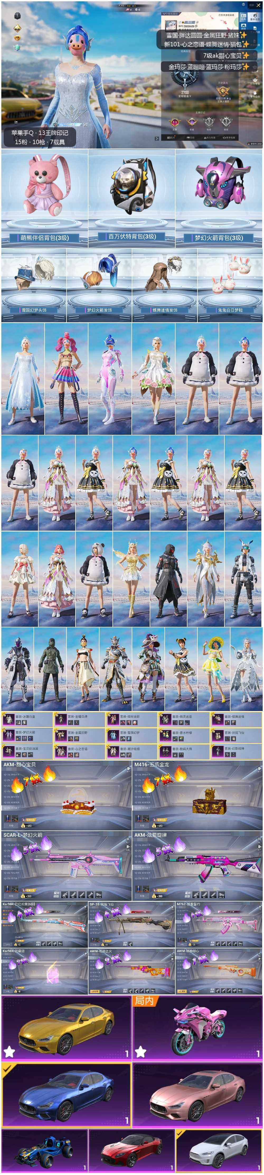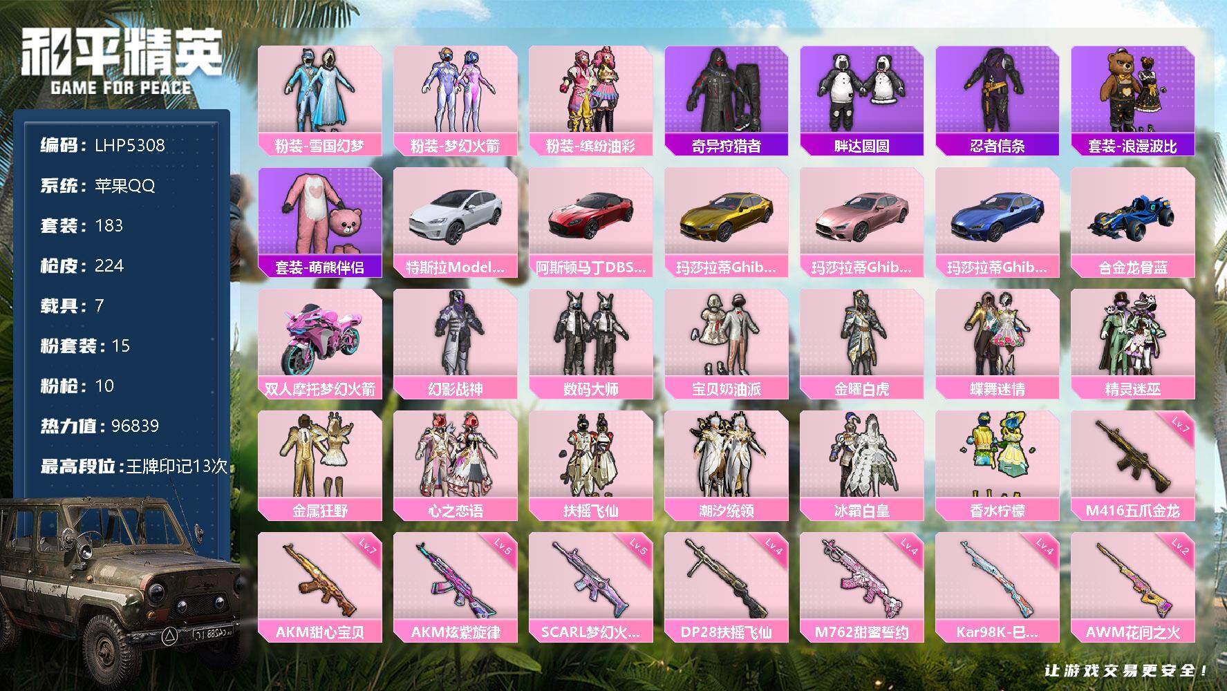 [12429092]素材身法号【特价急出/详情看图】:苹果 手Q-15粉装-10特效枪-7载具-4粉色飞行器-9.6w热力值-13王牌印记-183套装-224枪皮【热门品类】:粉装-雪国幻梦,粉装-梦幻火箭,粉装-缤纷油彩,套装-奇异狩猎者,套装-胖达圆圆,套装-忍者信条,套装-浪漫波比,套装-萌熊伴侣【粉色载具】:特斯拉Model X(珍珠白),阿斯顿马丁DBS(红),玛莎拉蒂Ghibli(金),玛莎拉蒂Ghibli(粉),玛莎拉蒂Ghibli(蓝),合金龙骨(蓝),双人摩托-梦幻火箭【粉色套装】:粉装-幻影战神,粉装-数码大师,粉装-宝贝奶油派,粉装-金曜白虎,粉装-雪国幻梦,粉装-蝶舞迷情,粉装-精灵迷巫,粉装-梦幻火箭,粉装-金属狂野,粉装-缤纷油彩,粉装-心之恋语,粉装-扶摇飞仙,粉装-潮汐统领,粉装-冰霜白皇,粉装-香水柠檬【粉色枪皮等级】:AKM-甜心宝贝(七级),AKM-炫紫旋律(五级),SCAR-L-梦幻火箭(五级),M416-五爪金龙(七级),M762-甜蜜誓约(四级),Kar98K-伏魔团(二级),Kar98K-巳巳如意(四级),AWM-花间之火(二级),AWM-橘柚倾心(一级),DP-28-扶摇飞仙(四级)【粉色飞行器】:春暖花开飞行器,精灵迷巫飞行器,梦幻火箭飞行器,潮汐统领飞行器