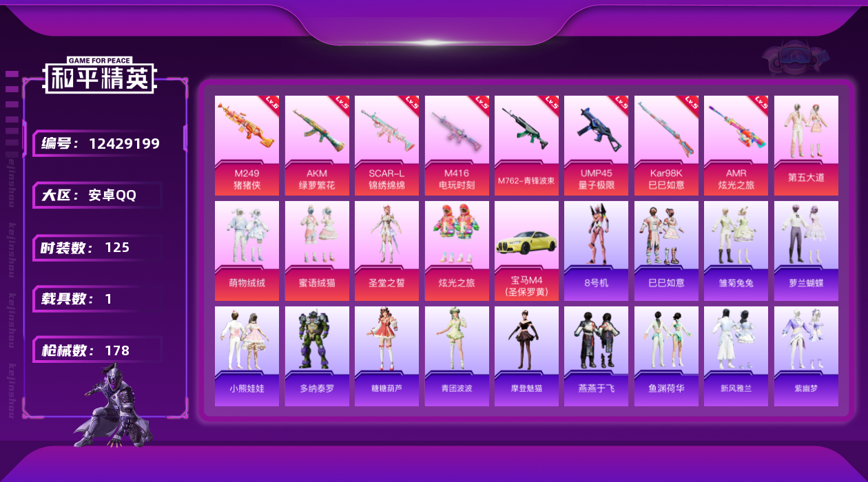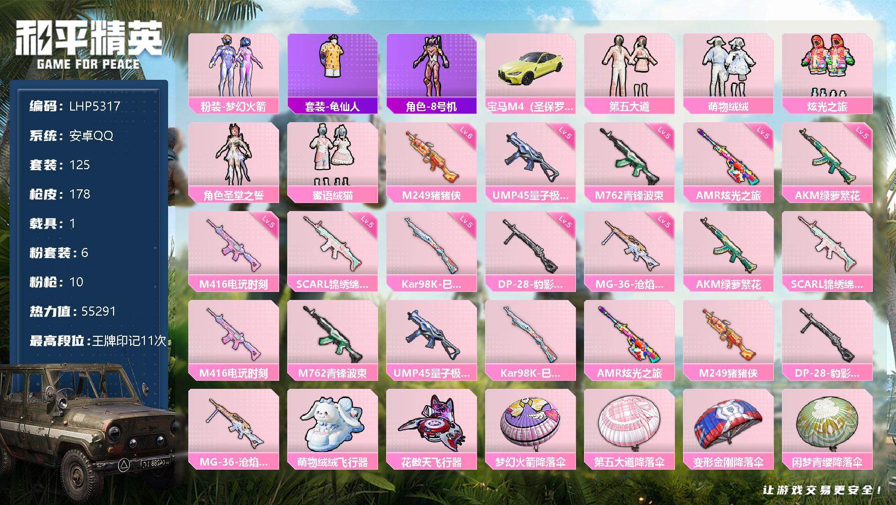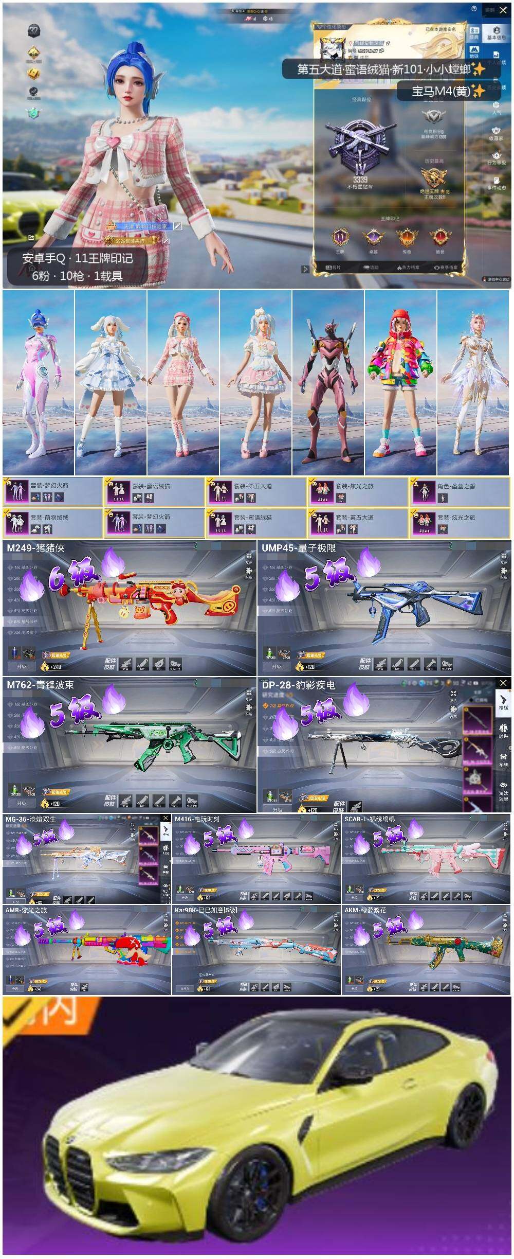 [12429199]素材身法号/绝世印记1/地铁满天赋【特价急出/详情看图】:安卓 手Q-6粉装-10特效枪-1载具-4粉色飞行器-5.5w热力值-11王牌印记-125套装-178枪皮【热门品类】:粉装-梦幻火箭,套装-龟仙人,角色-8号机【粉色载具】:宝马M4(圣保罗黄)【粉色套装】:粉装-梦幻火箭,粉装-第五大道,粉装-萌物绒绒,粉装-炫光之旅,角色-圣堂之誓,粉装-蜜语绒猫【粉色枪皮等级】:AKM-绿萝繁花(五级),SCAR-L-锦绣绵绵(五级),M416-电玩时刻(五级),M762-青锋波束(五级),UMP45-量子极限(五级),Kar98K-巳巳如意(五级),AMR-炫光之旅(五级),M249-猪猪侠(六级),DP-28-豹影疾电(五级),MG-36-沧焰双生(五级)【粉色飞行器】:萌物绒绒飞行器,花傲天飞行器