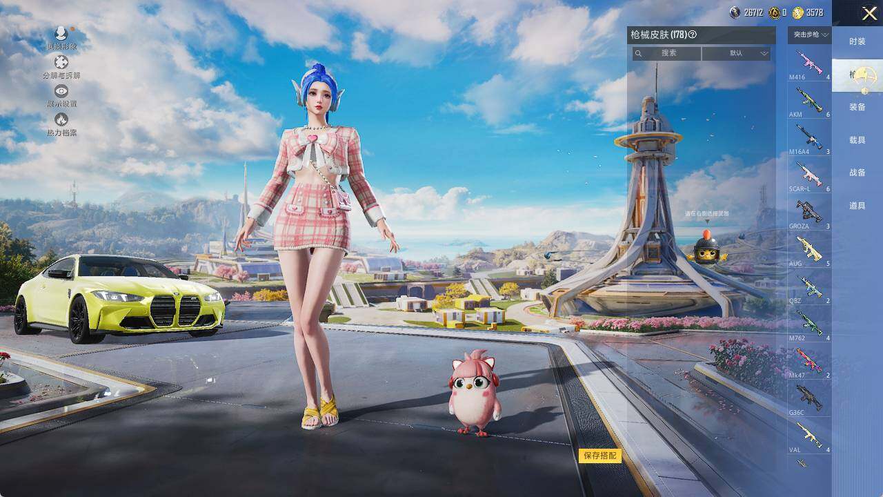 AKM-绿萝繁花,M416-电玩时刻,M762-青锋波束,UMP45-量子极限,Kar98K-巳巳如意,AMR-炫光之旅,M249-猪猪侠