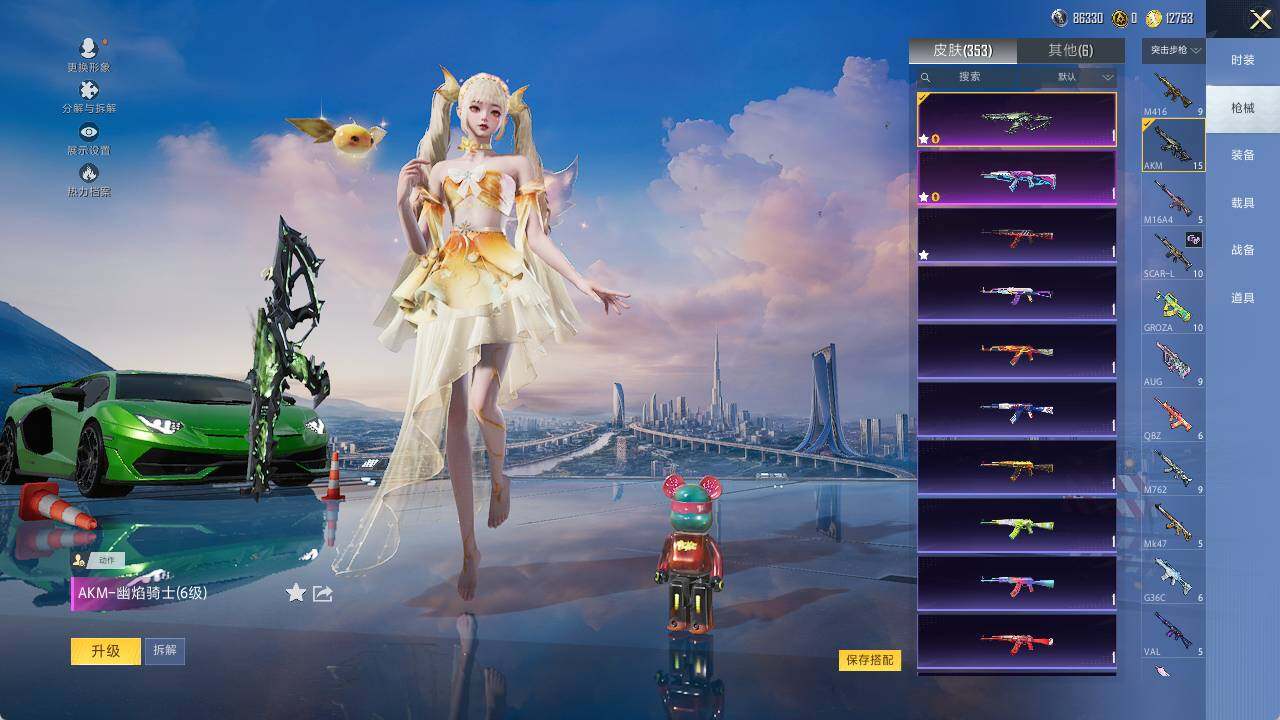 AKM-梦之光华,AKM-幽焰骑士,M416-五爪金龙,M416-风花雪月,GROZA-香水柠檬,GROZA-精灵之光,AUG-超新星,M762-激战未来,Kar98K-巳巳如意,M249-蓝莓炮弹