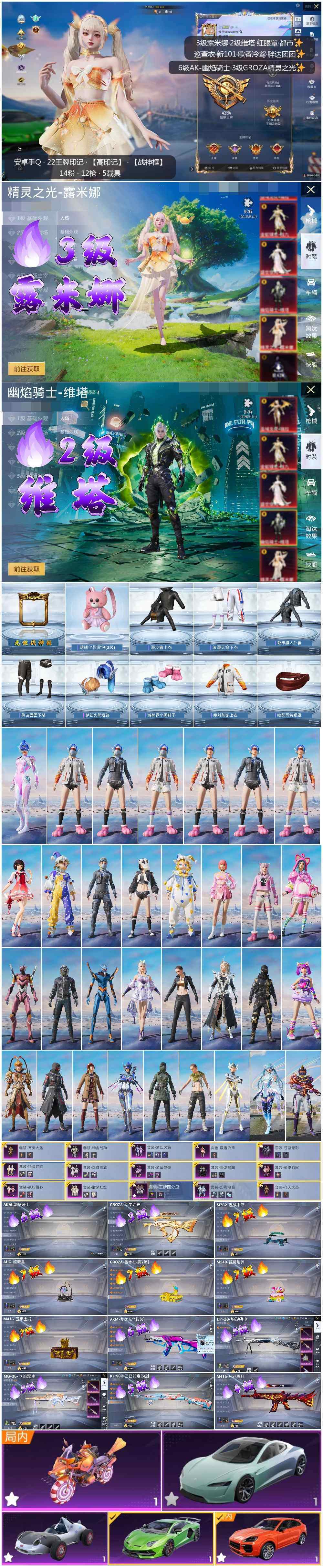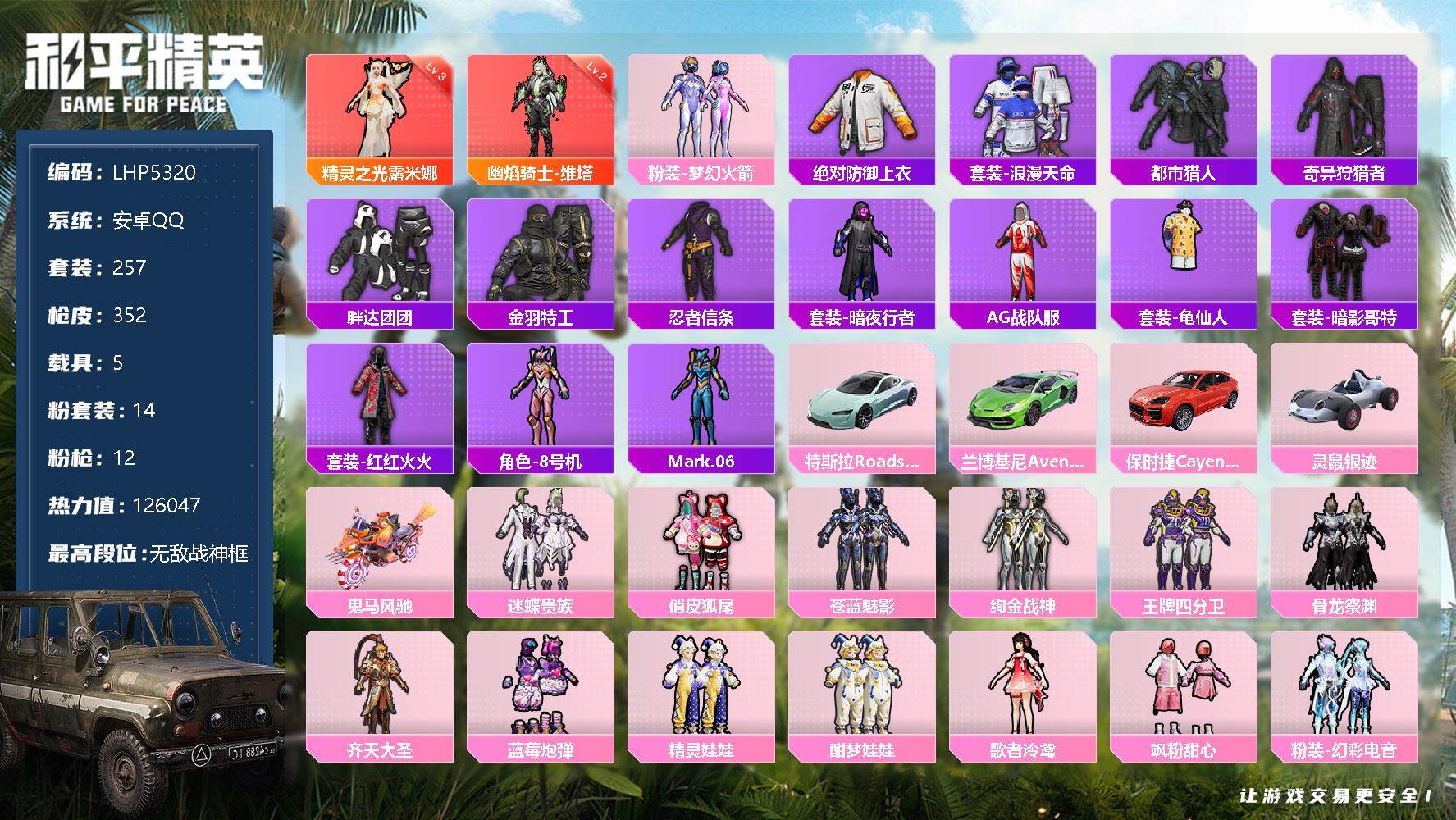 [12429192]素材身法号/无敌战神框1/绝世印记1/扭蛋碎片1126/地铁满天赋【特价急出/详情看图】:安卓 手Q-无敌战神框-2神装-14粉装-12特效枪-5载具-6粉色飞行器-12.6w热力值-22王牌印记-257套装-352枪皮【红色神装等级】:幽焰骑士-维塔(二级),精灵之光-露米娜(三级)【热门品类】:粉装-梦幻火箭,绝对防御上衣,套装-浪漫天命,套装-都市猎人,套装-奇异狩猎者,套装-胖达团团,套装-金羽特工,套装-忍者信条,套装-暗夜行者,套装-AG战队服,套装-龟仙人,套装-暗影哥特,套装-红红火火,角色-8号机,角色-Mark.06【粉色载具】:特斯拉Roadster(水滴蓝),兰博基尼Aventador SVJ(翡翠绿),保时捷Cayenne(激情红),灵鼠银迹,鬼马风驰【粉色套装】:粉装-梦幻火箭,粉装-迷蝶贵族,粉装-俏皮狐尾,粉装-苍蓝魅影,粉装-绚金战神,粉装-王牌四分卫,粉装-骨龙祭渊,粉装-齐天大圣,粉装-蓝莓炮弹,粉装-精灵娃娃,粉装-酣梦娃娃,角色-歌者泠鸢,粉装-飒粉甜心,粉装-幻彩电音【粉色枪皮等级】:AKM-梦之光华(六级),AKM-幽焰骑士(六级),M416-五爪金龙(七级),M416-风花雪月(四级),GROZA-香水柠檬(七级),GROZA-精灵之光(三级),AUG-超新星(七级),M762-激战未来(七级),Kar98K-巳巳如意(五级),M249-蓝莓炮弹(七级),DP-28-豹影疾电(五级),MG-36-沧焰双生(五级)【粉色飞行器】:齐天大圣飞行器,绿意幻情飞行器,天之羽翼飞行器,深渊漩涡飞行器,曦光华影飞行器,幽焰列车飞行器