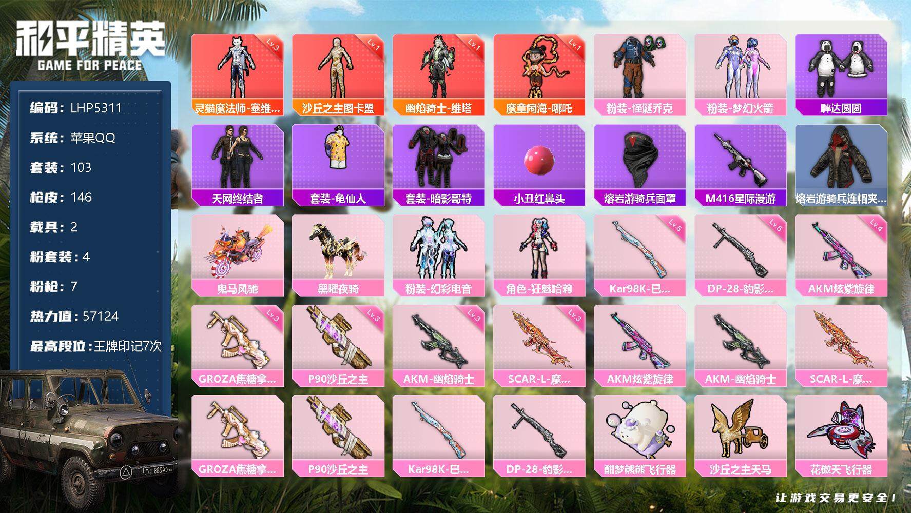 [12429318]素材身法号/地铁满天赋【特价急出/详情看图】:苹果 手Q-4神装-4粉装-7特效枪-2载具-12粉色飞行器-5.7w热力值-7王牌印记-103套装-146枪皮【红色神装等级】:魔童闹海-哪吒(一级),灵猫魔法师-塞维尔(三级),幽焰骑士-维塔(一级),沙丘之主-图卡盟(一级)【热门品类】:粉装-怪诞乔克,粉装-梦幻火箭,套装-胖达圆圆,套装-天网终结者,套装-龟仙人,套装-暗影哥特,小丑红鼻头,熔岩游骑兵面罩,M416-星际漫游,熔岩游骑兵连帽夹克【粉色载具】:鬼马风驰,黑曜夜骑【粉色套装】:粉装-怪诞乔克,粉装-梦幻火箭,粉装-幻彩电音,角色-狂魅哈莉【粉色枪皮等级】:AKM-炫紫旋律(四级),AKM-幽焰骑士(三级),SCAR-L-魔童闹海 哪吒(三级),GROZA-焦糖拿铁(三级),P90-沙丘之主(三级),Kar98K-巳巳如意(五级),DP-28-豹影疾电(五级)【粉色飞行器】:酣梦熊熊飞行器,沙丘之主天马,花傲天飞行器,镜域双华-灵镜之阶,龙翔九天飞行器,深渊漩涡飞行器,幽焰列车飞行器,动力核心飞行器,万象金身飞行器,灵猫魔法师飞行器,飞天猪飞行器