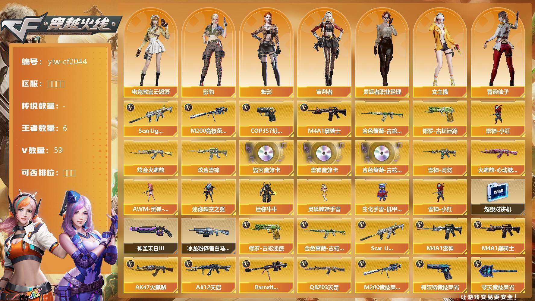[12429416]【商品标题】:上海一区-59V-6王者-2炫金 【热门武器】:Scar Light-白虎,金色蔷薇-古蛇迷踪,修罗-古蛇迷踪,M200-竞技荣光,M4A1-黑骑士,雷神-小红,COP 357-幻灵*3 【王者炫金武器】:炫金火麒麟,炫金雷神 【音效卡】:金色蔷薇-古蛇迷踪音效卡,M4A1-雷神音效卡,Barrett-毁灭音效卡 【稀有皮肤】:雷神-虎将,火麒麟-心动糖果 【角色】:灵狐者-职业经理,电竞教官-云悠悠,影豹,魅影,审判者,女主播,青霞仙子 【人偶武器】:雷神-小红,AWM-灵狐-15周年嘉年华*2,迷你裂空之翼,迷你牛牛,灵狐娃娃手雷*2,生化手雷-机甲核心 【暴走生化】:超级对讲机 【挑战大师】:神圣爆裂者-末日III,冰龙粉碎者-白马银枪 【英雄级武器】:M200-竞技荣光,柯尔特-竞技荣光*2,擎天-竞技荣光,高爆手雷-竞技荣光*2,烟雾弹-竞技荣光*2,闪光弹-竞技荣光*2,M4A1-幻灵,COP 357-幻灵*3,幻灵之锋*2,马来剑-夜魔,斩神刀-雷暴,Scar Light-白虎,金色蔷薇-古蛇迷踪,无影-神兵利器,M4A1-雷神,M4A1-黑骑士,AK47-火麒麟,AK12-天启,Barrett-毁灭,QBZ03-天罚,黑武士-锦绣游龙,M4A1-赤狱骑士,修罗-古蛇迷踪 【特殊枪械】:1白虎,1黑骑士