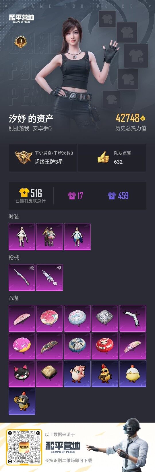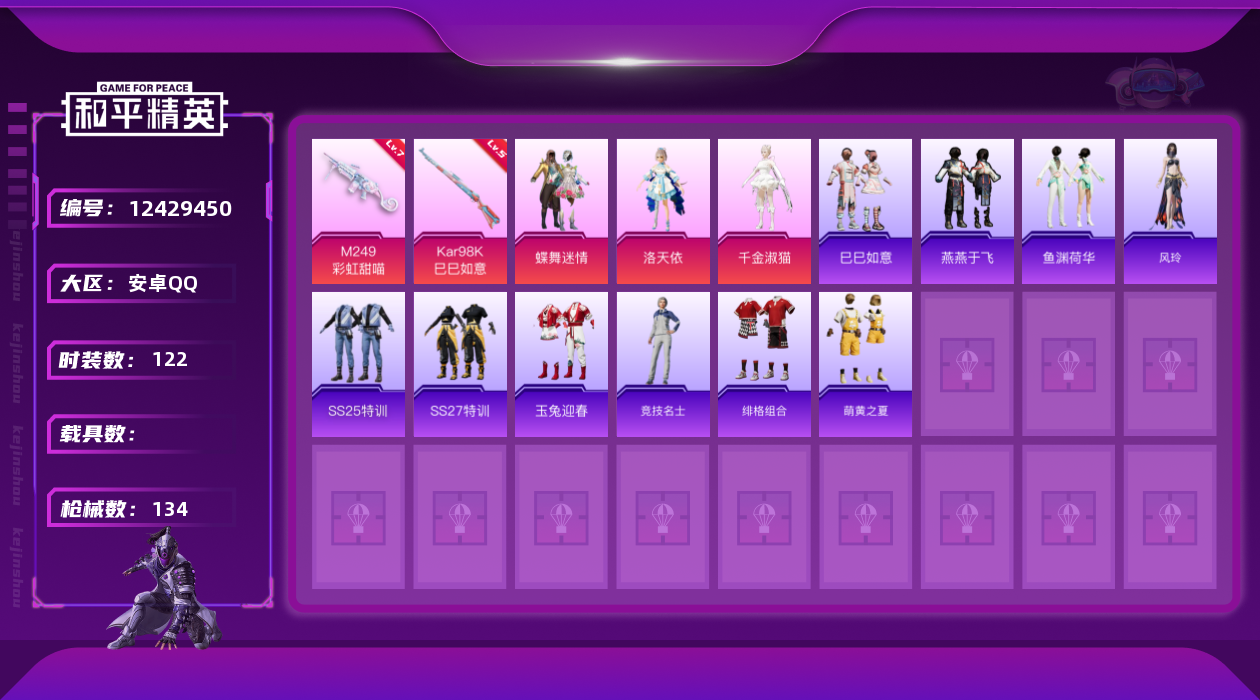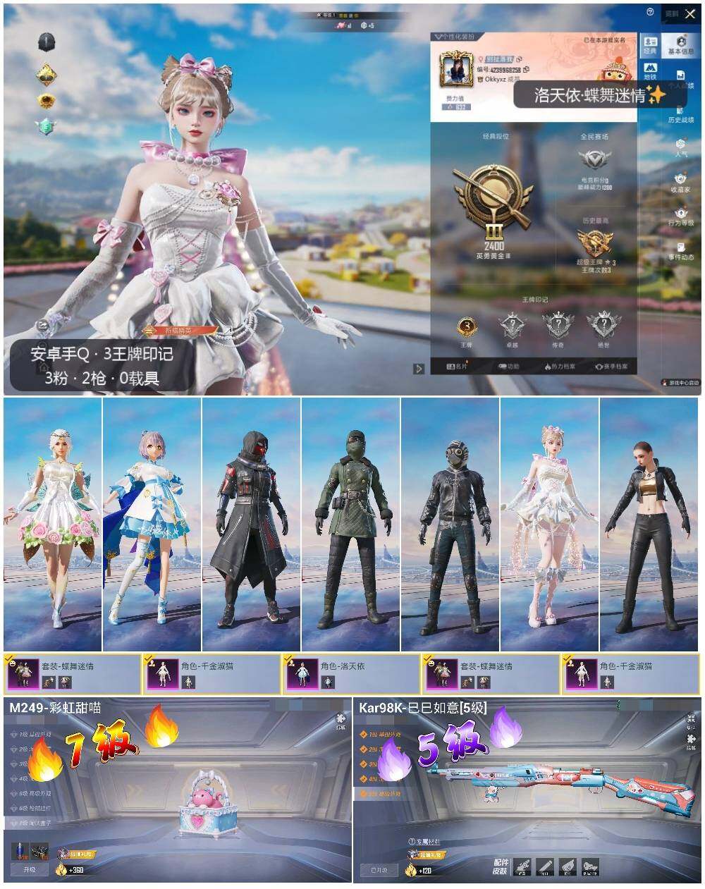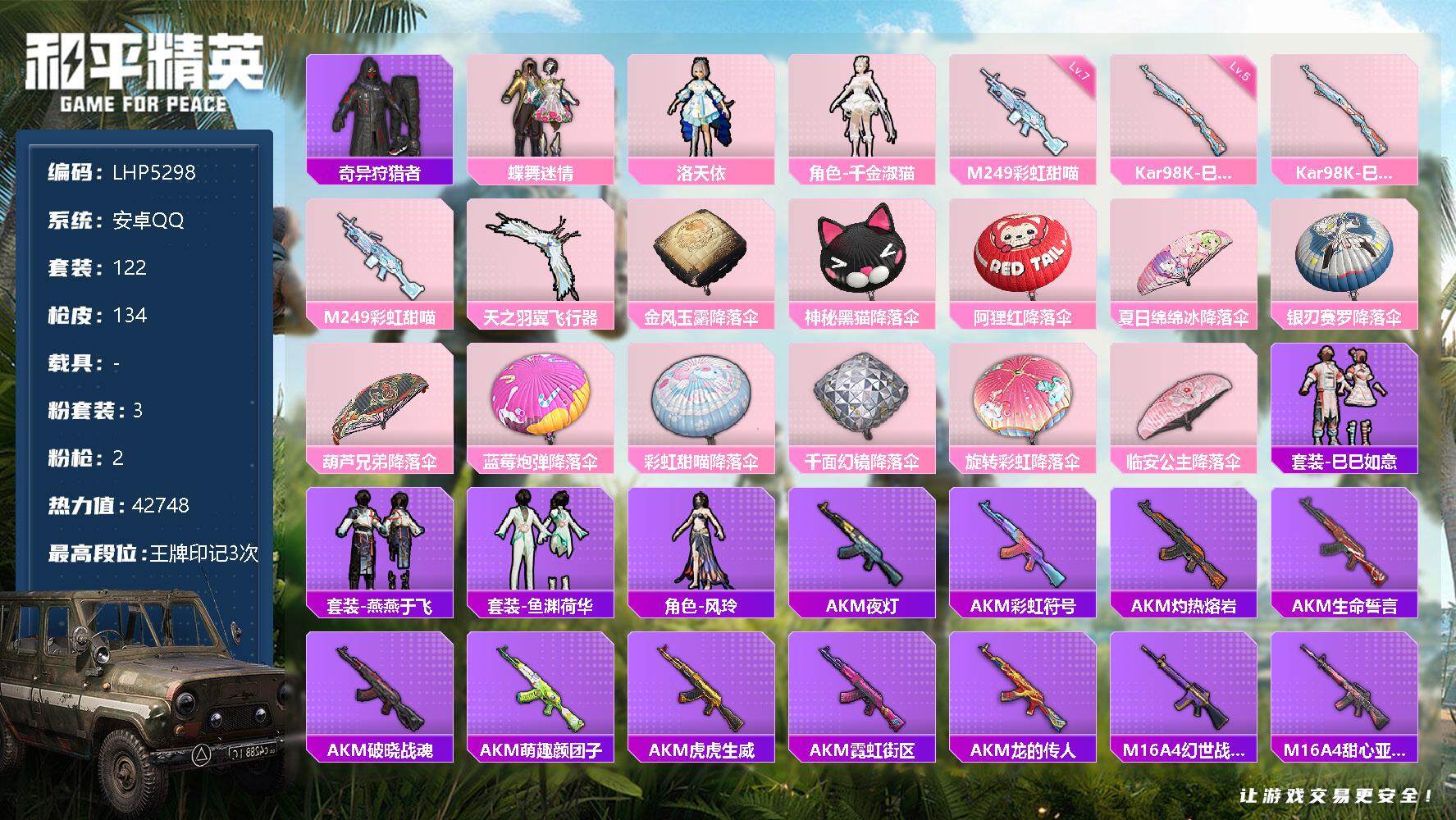 [12429450]【特价急出/详情看图】:安卓 手Q-3粉装-2特效枪-1粉色飞行器-4.2w热力值-3王牌印记-122套装-134枪皮【热门品类】:套装-奇异狩猎者【粉色套装】:粉装-蝶舞迷情,角色-洛天依,角色-千金淑猫【粉色枪皮等级】:Kar98K-巳巳如意(五级),M249-彩虹甜喵(七级)【粉色飞行器】:天之羽翼飞行器