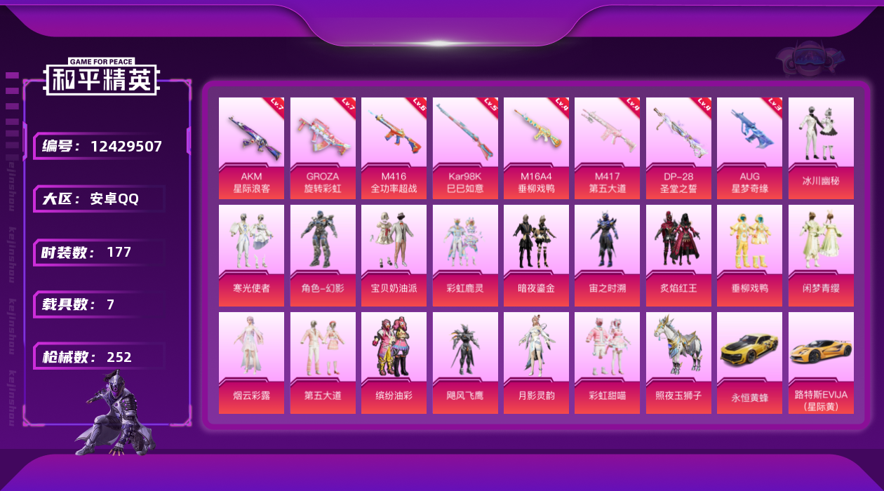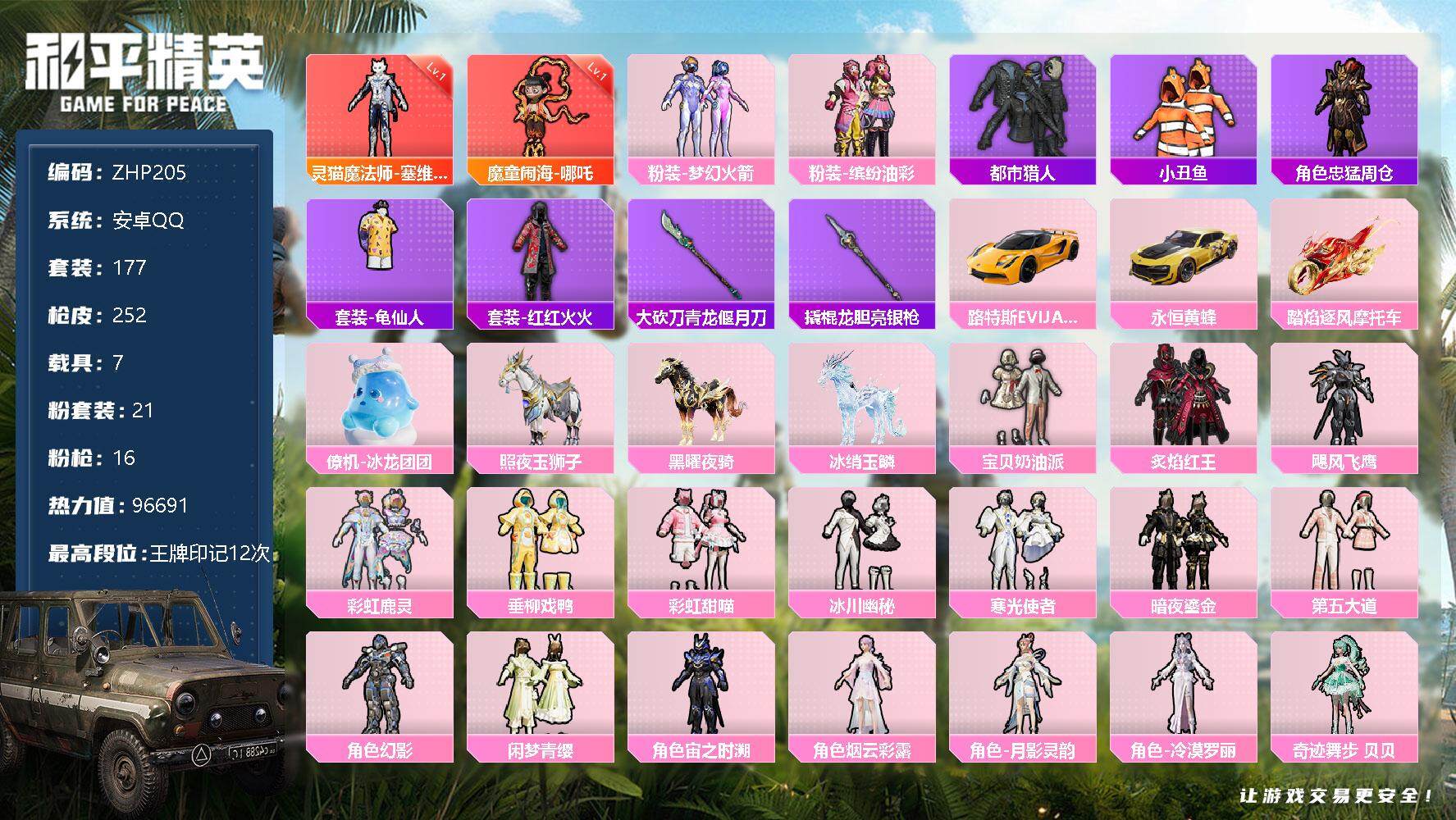 [12429507]素材身法号/地铁满天赋【特价急出/详情看图】:安卓 手Q-2神装-21粉装-16特效枪-7载具-9粉色飞行器-9.6w热力值-12王牌印记-177套装-252枪皮【红色神装等级】:魔童闹海-哪吒(一级),灵猫魔法师-塞维尔(一级)【热门品类】:粉装-梦幻火箭,粉装-缤纷油彩,套装-都市猎人,套装-小丑鱼,角色-忠猛周仓,套装-龟仙人,套装-红红火火,大砍刀-青龙偃月刀,撬棍-龙胆亮银枪【粉色载具】:路特斯EVIJA(星际黄),永恒黄蜂,踏焰逐风摩托车,僚机-冰龙团团,照夜玉狮子,黑曜夜骑,冰绡玉鳞【粉色套装】:粉装-宝贝奶油派,粉装-梦幻火箭,粉装-缤纷油彩,粉装-炙焰红王,粉装-飓风飞鹰,粉装-彩虹鹿灵,粉装-垂柳戏鸭,粉装-彩虹甜喵,粉装-冰川幽秘,粉装-寒光使者,粉装-暗夜鎏金,粉装-第五大道,角色-幻影,粉装-闲梦青缨,角色-宙之时溯,角色-烟云彩露,角色-月影灵韵,角色-冷漠罗丽,角色-奇迹舞步 贝贝,角色-奇迹舞步 美琪,角色-奇迹舞步 美雪【粉色枪皮等级】:AKM-星际浪客(七级),M16A4-垂柳戏鸭(四级),SCAR-L-魔童闹海 哪吒(三级),M416-全功率超战(六级),M416-灵猫魔法师(三级),GROZA-旋转彩虹(七级),AUG-星梦奇缘(三级),Vector-绯穹魔姬(四级),汤姆逊-热量炸弹(五级),P90-魔童闹海 敖丙(三级),Kar98K-巳巳如意(五级),Mk14-甜梦熊击(五级),M417-第五大道(四级),DP-28-圣堂之誓(四级),DP-28-豹影疾电(五级),MG-36-沧焰双生(五级)【粉色飞行器】:千面幻镜飞行器,黄族统领飞行器,萌物绒绒飞行器,镜光幻境飞行翼,夜幕颂歌飞行器,龙翔九天飞行器,灵猫魔法师飞行器,飞天猪飞行器,灵珠游龙飞行器