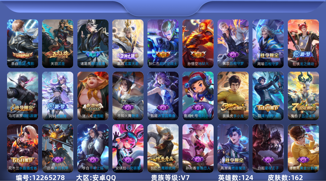 [12265278]V7 1典藏 5传说 124英雄 162皮肤 可修改实名 优质装备:鸣剑·曳影,地狱火,超时空战士-狄仁杰,鹤羽星尊,玄雷天君 珍宝阁皮:蔷薇恋人 限定皮:五谷丰年,武圣,梁祝,李小龙,猪悟能 史诗皮:化蝶舞,龙之律动,茶境仙,百相守梦-周瑜,百相守梦-黄忠,电玩小子(小书包),黄金分割率,特工魅影,千年之狐,江河有灵,高渐离燃音魔法,魅语,冰冠公主,末日机甲-吕布,节奏热浪,水果甜心,绅士熊喵,天才门将,星夜王子,心灵骇客,功夫厨神,暗隐猎兽者,鬼剑武藏,缤纷独角兽,水晶猎龙者,曙光守护者,金属风暴,圣诞狂欢,圣诞恋歌,鹰眼统帅,暗夜贵公子,魅力维加斯,未来纪元-赵云