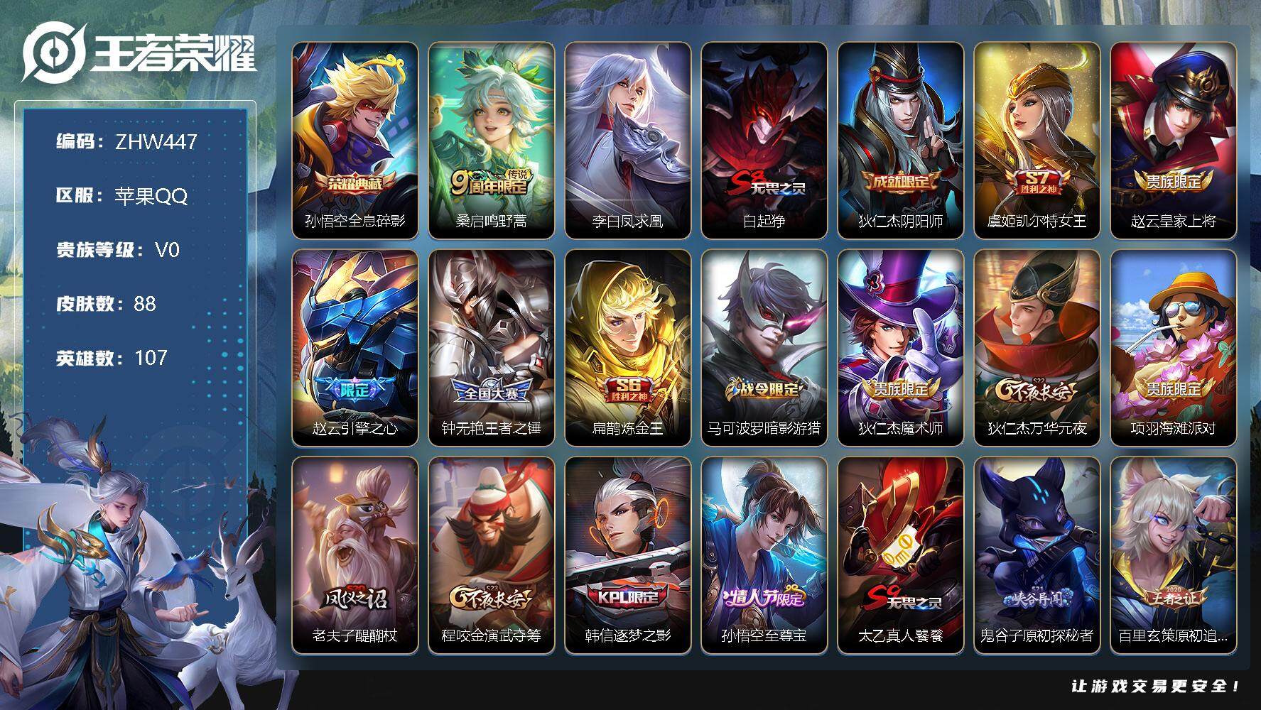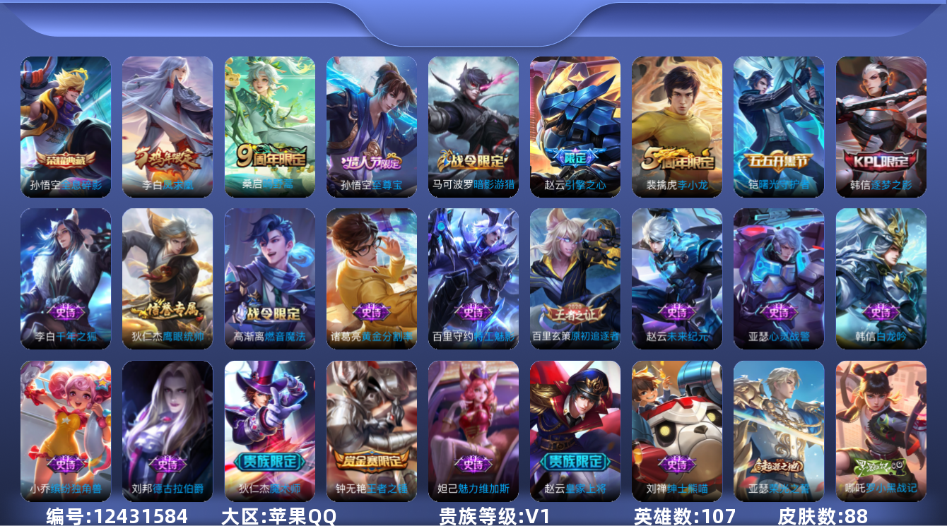 [12431584]【商品标题】:苹果Q-V0-至尊星耀IV段位-107英雄-88皮肤-1典藏-2传说-22史诗