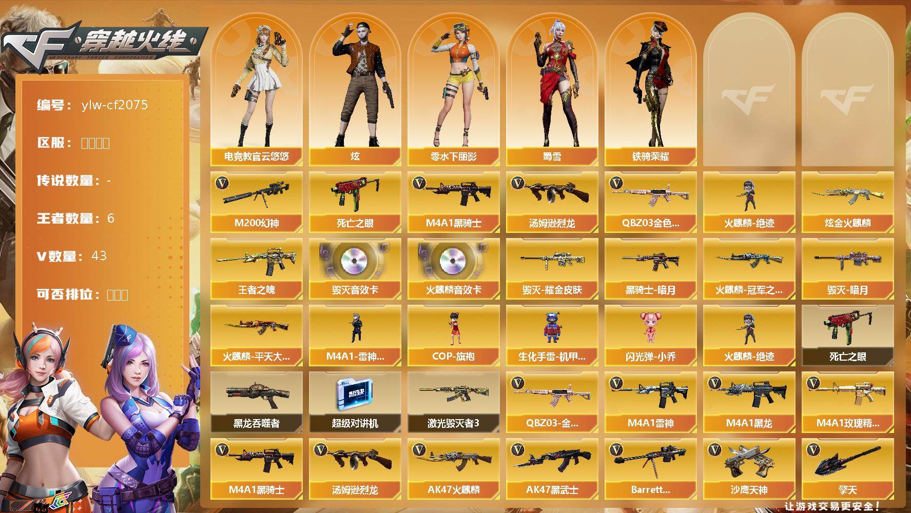 [12431624]【商品标题】:辽宁一区-43V-6王者-1炫金 【热门武器】:QBZ03-金色蔷薇,M200-幻神,死亡之眼,M4A1-黑骑士,汤姆逊-烈龙,火麒麟-绝迹 【王者炫金武器】:炫金火麒麟,王者之魄 【音效卡】:AK47-火麒麟音效卡,Barrett-毁灭音效卡 【稀有皮肤】:火麒麟-冠军之心,火麒麟-平天大圣,黑骑士-暗月,毁灭-暗月,毁灭耀金皮肤 【角色】:零-水下丽影,电竞教官-云悠悠,炫,蜀雪,铁骑荣耀 【人偶武器】:火麒麟-绝迹,M4A1-雷神-精英刀锋,COP-旗袍,生化手雷-机甲核心,闪光弹-小乔 【暴走生化】:死亡之眼,黑龙吞噬者,超级对讲机 【挑战大师】:激光毁灭者III 【英雄级武器】:柯尔特-竞技荣光,高爆手雷-竞技荣光*2,M4A1-武圣,QBZ03-金色蔷薇,M4A1-雷神*2,M4A1-黑龙*4,M4A1-玫瑰精灵,M4A1-黑骑士,汤姆逊-烈龙,AK47-火麒麟*2,AK47-黑武士,Barrett-毁灭*2,AWM-裁决,M4A1-龙血,AA-12-雷霆,M200-幻神,AK47-黑鲨,AK-47-猩红传说*8,AK47-B-战神,沙鹰-天神,麒麟刺,擎天,龙啸,屠龙 【特殊枪械】:1黑骑士,1烈龙