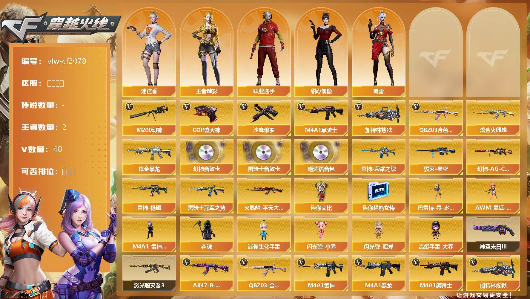 [12432041]【商品标题】:上海一区-48V-2王者-2炫金 【热门武器】:QBZ03-金色蔷薇,M200-幻神,M4A1-黑骑士,加特林-炼狱,COP-堕天神,沙鹰-修罗 【王者炫金武器】:炫金火麒麟,炫金黑龙 【音效卡】:M200-幻神音效卡,M4A1-黑骑士音效卡,绝迹语音包 【稀有皮肤】:幻神-AG-CFPLS17冠军,雷神-荣耀之魄,雷神-杨戬,火麒麟-平天大圣,黑骑士-冠军之势,毁灭-星空 【角色】:王者-魅影,蜀雪,迷迭香,职业选手,甜心偶像 【人偶武器】:巴雷特-零-水下丽影,AWM-灵狐-15周年嘉年华,M4A1-雷神-精英刀锋,迷你艾比,迷你超能女侍,夺魂,迷你生化手雷,闪光弹-小乔,闪光弹-貂蝉,高爆手雷-大乔 【挑战大师】:神圣爆裂者-末日III*2,激光毁灭者III 【英雄级武器】:COP-堕天神,麒麟刺-堕天神*2,龙啸-堕天神*2,QBZ03-金色蔷薇,无影-神兵利器,M4A1-雷神,M4A1-黑龙,M4A1-黑骑士,加特林-炼狱,Barrett-毁灭,M200-幻神,黑武士-锦绣游龙,AK-47-猩红传说,AK47-B-战神,AK47-B-常胜将军*2,M4A1-赤狱骑士,沙鹰-天神,沙鹰-修罗,屠龙*2 【特殊枪械】:1黑骑士,1炼狱