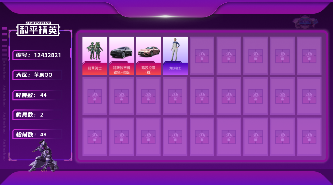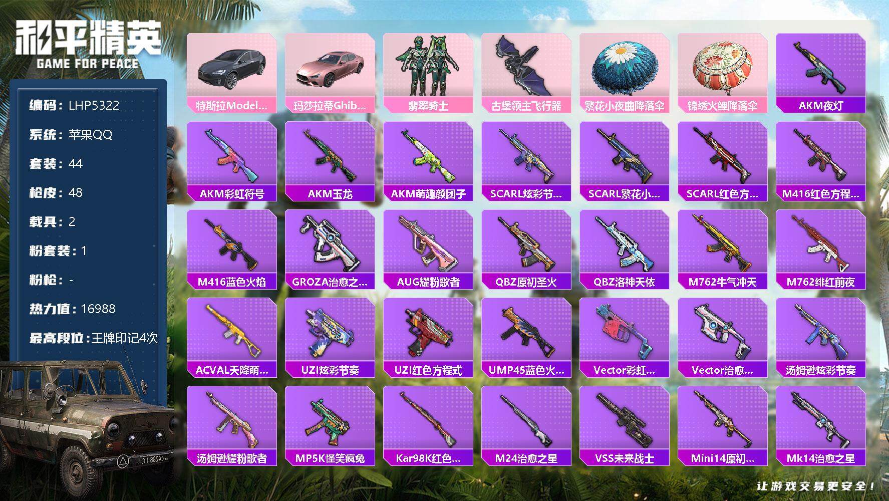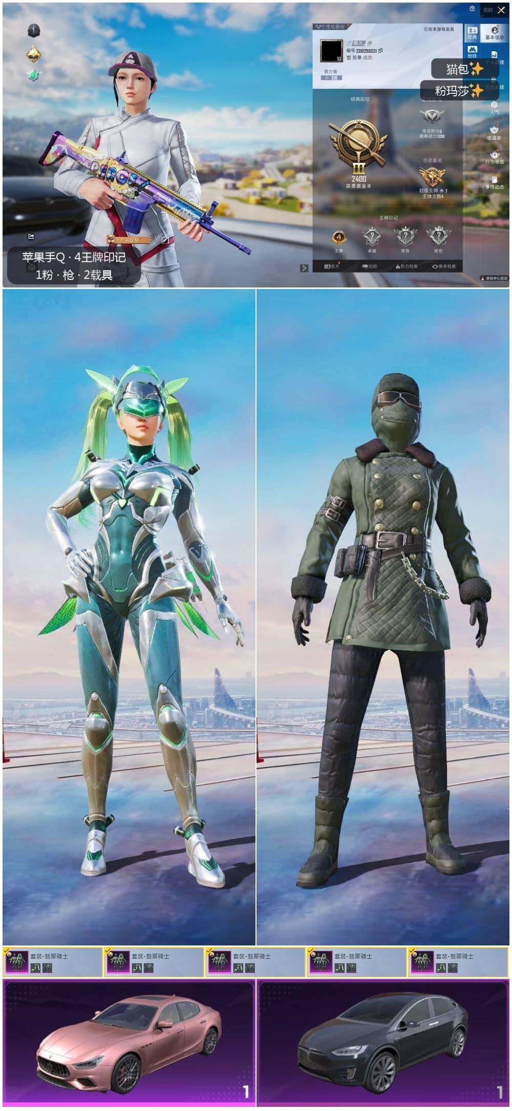 [12432821]【特价急出/详情看图】:苹果 手Q-1粉装-2载具-1粉色飞行器-1.6w热力值-4王牌印记-44套装-48枪皮【粉色载具】:特斯拉Model X(冷光银),玛莎拉蒂Ghibli(粉)【粉色套装】:粉装-翡翠骑士【粉色飞行器】:古堡领主飞行器