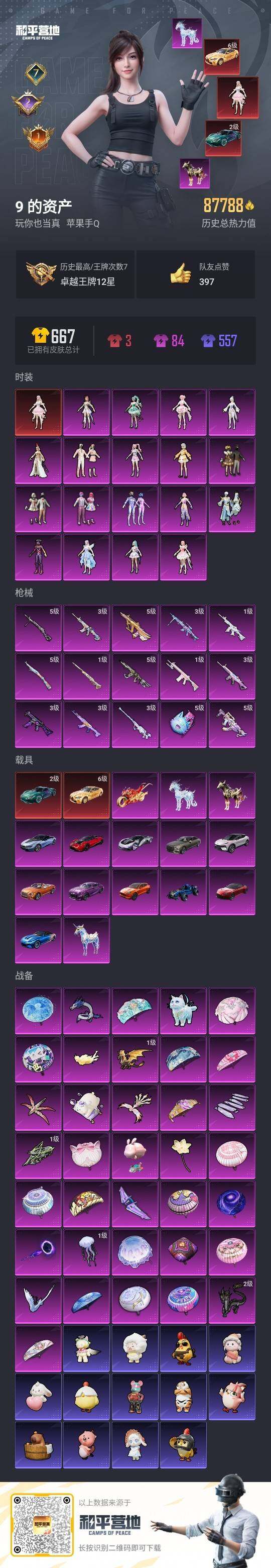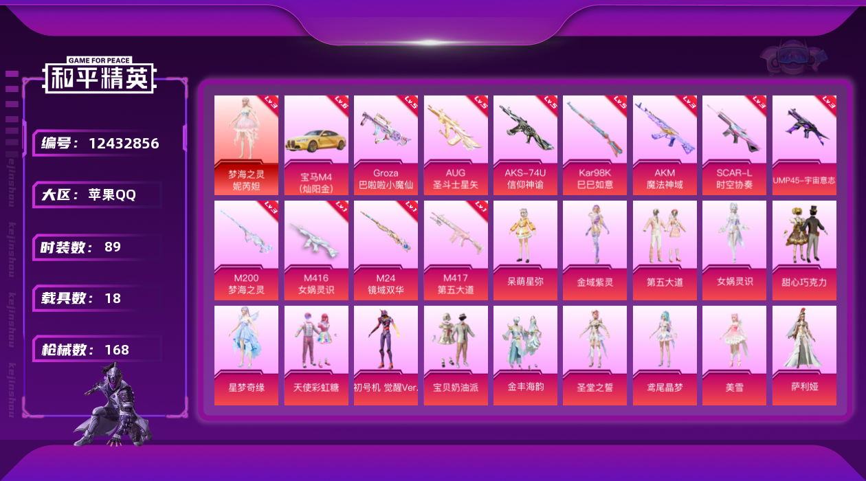 - PX_2100559- 苹果微信-12王牌印记-8粉装-13特效枪-1载具-101079热力值-225套装-320枪皮-2卓越印记-0传奇印记 【8粉装】,宝贝奶油派,天使彩虹糖,雪月幻音,橘柚倾心,炫光之旅,女娲灵识,绚金战神,星之彼岸 【13特效枪】AKM-炫紫旋律-5级 SCAR-L-青春物语-5级 M416-墨龙九天-6级 M416-五爪金龙-7级 M416-风花雪月-1级 AUG-暖羊咩