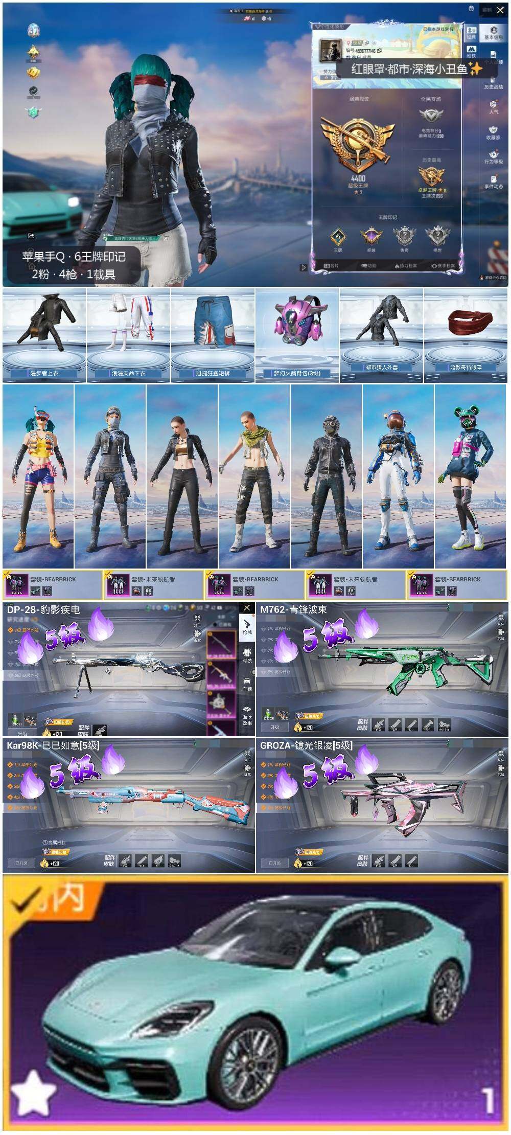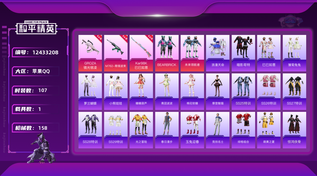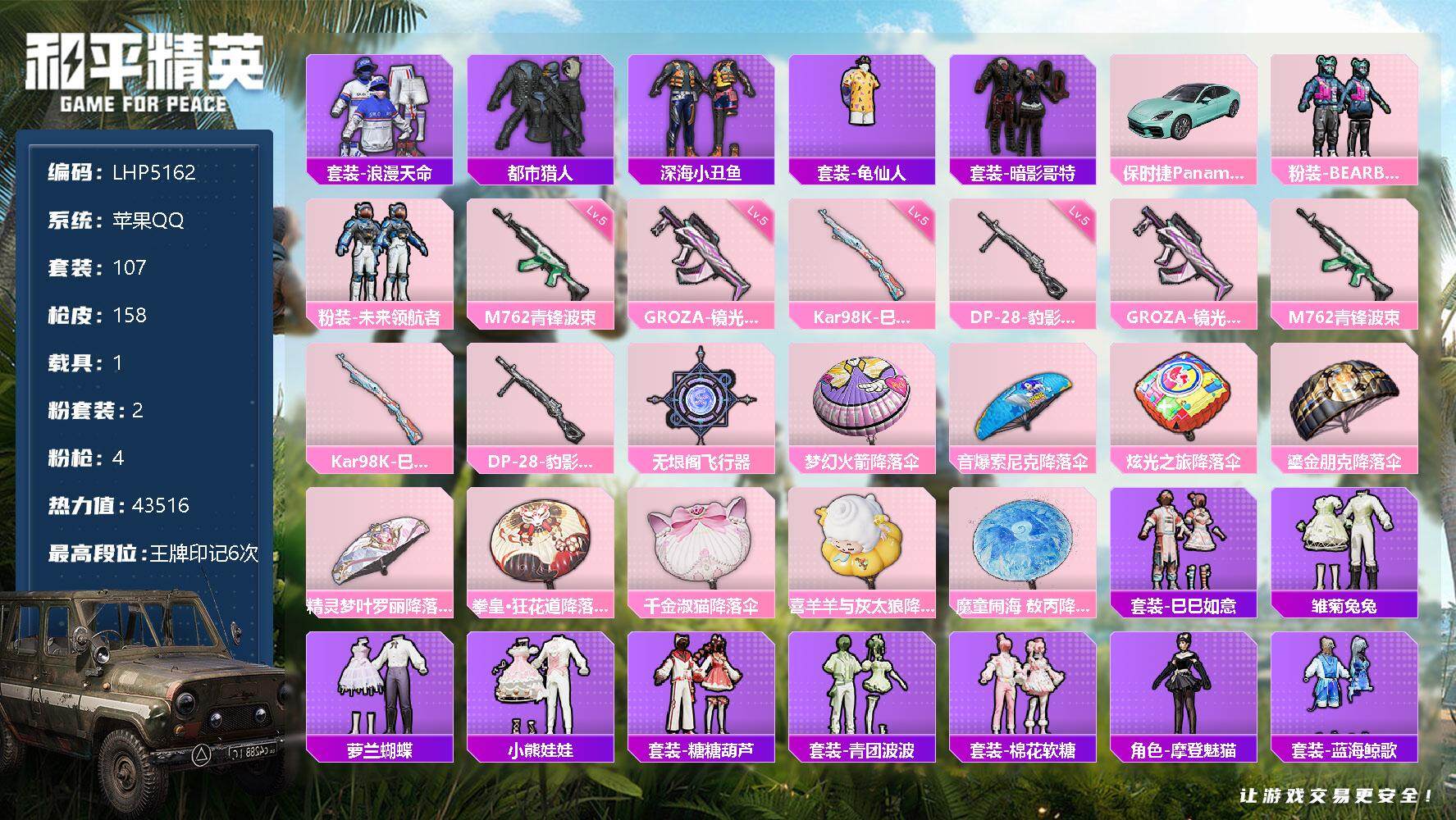 [12433208]【特价急出/详情看图】:苹果 手Q-2粉装-4特效枪-1载具-1粉色飞行器-4.3w热力值-6王牌印记-107套装-158枪皮【热门品类】:套装-浪漫天命,套装-都市猎人,套装-深海小丑鱼,套装-龟仙人,套装-暗影哥特【粉色载具】:保时捷Panamera(梦幻青)【粉色套装】:粉装-BEARBRICK,粉装-未来领航者【粉色枪皮等级】:GROZA-镜光银凌(五级),M762-青锋波束(五级),Kar98K-巳巳如意(五级),DP-28-豹影疾电(五级)【粉色飞行器】:无垠阁飞行器