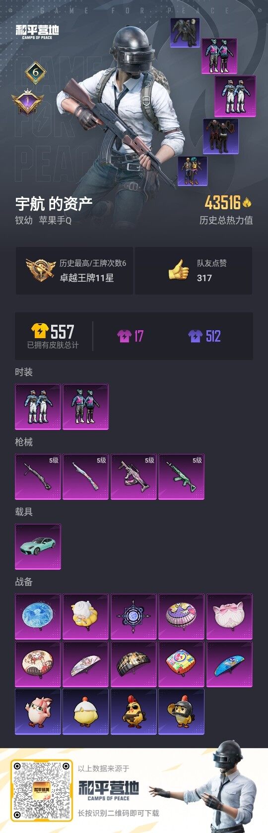 - [11970459]1红装 15粉装 14特效枪 2载具 11印记 可二次 可修改实名 身法装备:暗影哥特(红眼罩) 优质装备:圣域龙灵-瑞拉,二级圣域龙灵-瑞拉(2级瑞拉),星河领航(磐石银),僚机-圣域龙宝,M24星之信仰,梦幻火箭(新101)(新火箭少女101粉色套装),汤姆逊怪笑疯兔,M24莲影清波,AKM绿萝繁花,SCAR-L-锦绣绵绵,七级汤姆逊-怪笑疯兔,七级M24-星之信仰,破片手榴弹粉粉猫爪,AKM魔法神域,时空协奏·火花,AKM-幽焰骑士,DP-28-千金淑猫,千金淑猫,GROZA-镜光银凌,女娲灵识,AUG-暖羊咩咩,Kar98K-圣域龙灵,圣辉之星,GROZA-圣辉之星,Kar98K-巳巳如意 热门装扮:齐天大圣,恐龙拽拽,橘柚倾心,憨憨奶龙,镜光幻境,烟云彩露,美雪,美琪,小蓝,光极星,奇迹天团,潮萌小黄鸭,暗夜魅影 载具:拉轰奶龙龙 六级特效枪:六级M24-莲影清波 五级特效枪:五级GROZA-镜光银凌,五级破片手榴弹粉粉猫爪,五级SCAR-L-锦绣绵绵,五级AKM-绿萝繁花 四级特效枪:四级Kar98K-巳巳如意 三级特效枪:三级AKM-魔法神域,三级AKM-幽焰骑士,三级DP-28-千金淑猫,三级Kar98K-圣域龙灵 二级特效枪:二级GROZA-圣辉之星 一级特效枪:一级AUG-暖羊咩咩 紫色装扮:田园牧歌,轻风白浪,SS22特训,飞狐塔尔斯,SS23特训,幻彩翩翩,香榭午后,白兰地假日,娇憨猪猪,萌趣咩咩,SS21特训,绚烂繁星,SS31特训套装,人气偶像,冰川特警,冷焰舞者,北国孤狼,千禧之恋,SS30特训套装,SS33特训套装,SS20特训,潮流游乐家,SS15特训,时空追击者,暴风机械师,SS16特训,冰爽海盐,银白舞王,SS13特训,浪漫樱花,治愈之星,科技之星,SS14特训,萌趣颜团子,微雨春柳,飞驰魅影,音速流光,SS19特训,竞技角斗士,甜心亚梦,虚音幻奏,瑞龙福将,团圆交子,醒狮腾龙,SS17特训,极乐追光,异彩先驱,SS18特训,酷潮明星,野性战魂,长空猛禽,雨林探路者,雪山精英,霓虹极客,霓虹街区,缤纷果语,荣耀,蓝彩潮人,蓝色守护者,虎虎生威吉莉,街头潮人,跃动心情,风行保卫者,无面战甲,飞行日记,龙腾端午,骑行爱好者,魅力单车,鹤鸣,麻辣教官,黄色名流,龙的传人,龟仙人,和平特警,朋克治安官,柠萌假日,派对绅士,涂山之恋