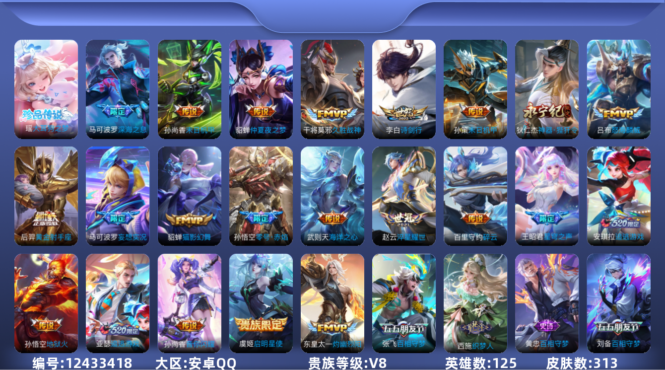 [12433418]【商品标题】:安卓Q-V8-最强王者段位-125英雄-313皮肤-0典藏-0珍品无双-0无双-1珍品传说-23传说-89史诗