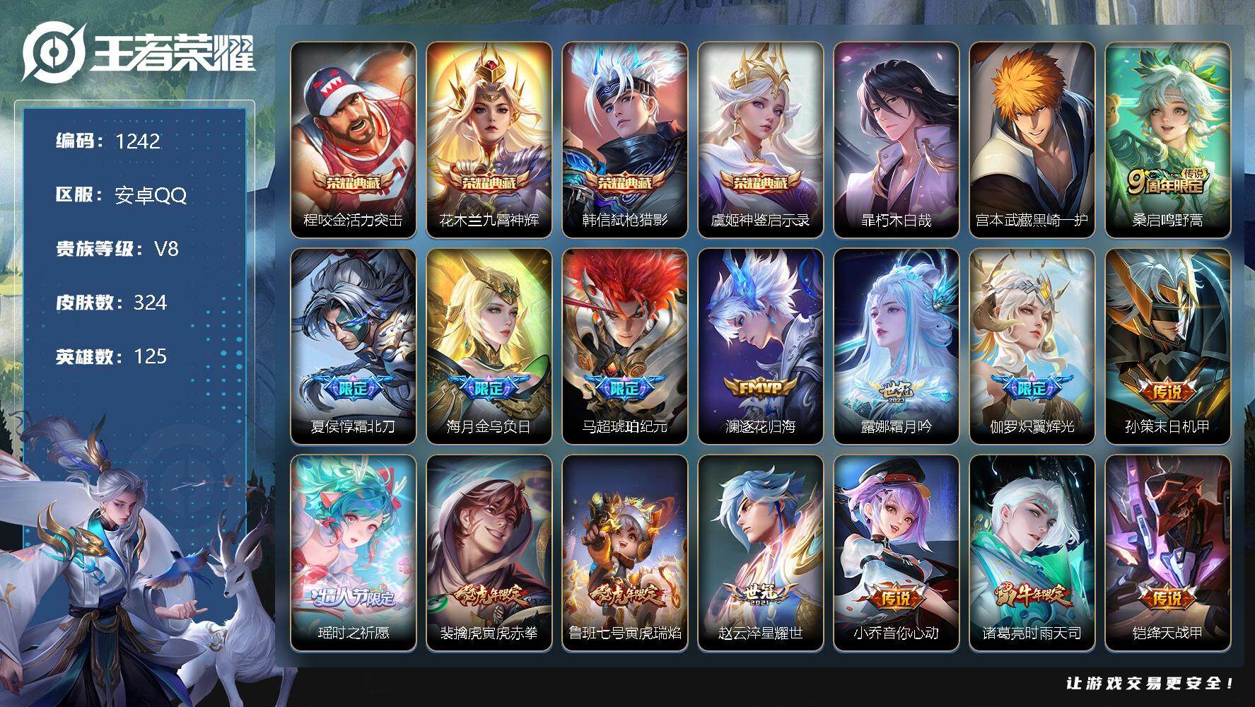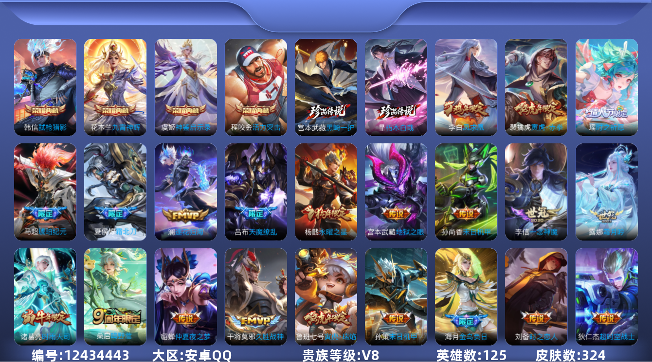 [12434443]【商品标题】:安卓Q-V8-至尊星耀IV段位-125英雄-324皮肤-4典藏-0珍品无双-0无双-2珍品传说-27传说-76史诗