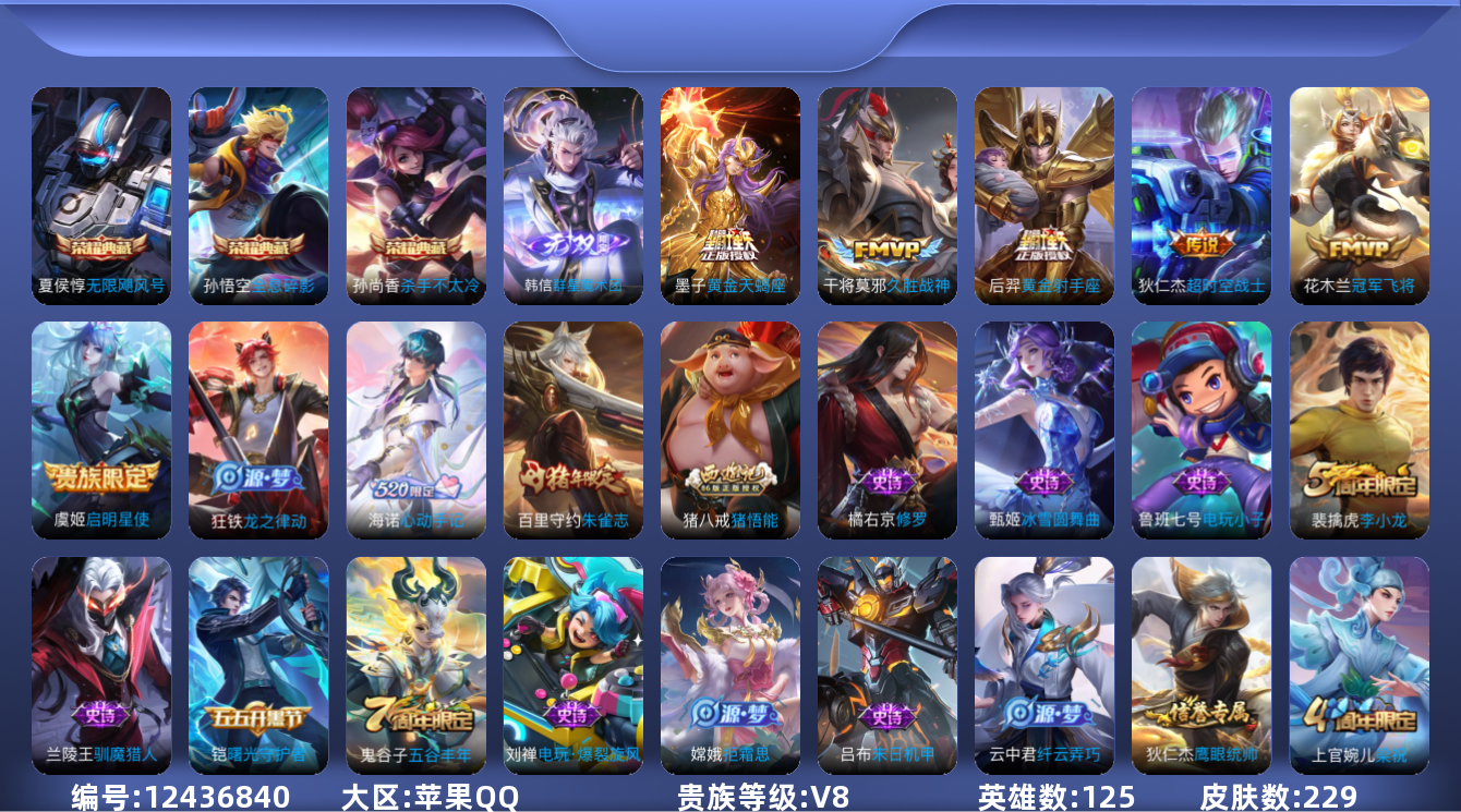 [12436840]【商品标题】:苹果Q-V6-尊贵铂金I段位-125英雄-229皮肤-3典藏-0珍品无双-1无双-0珍品传说-6传说-51史诗