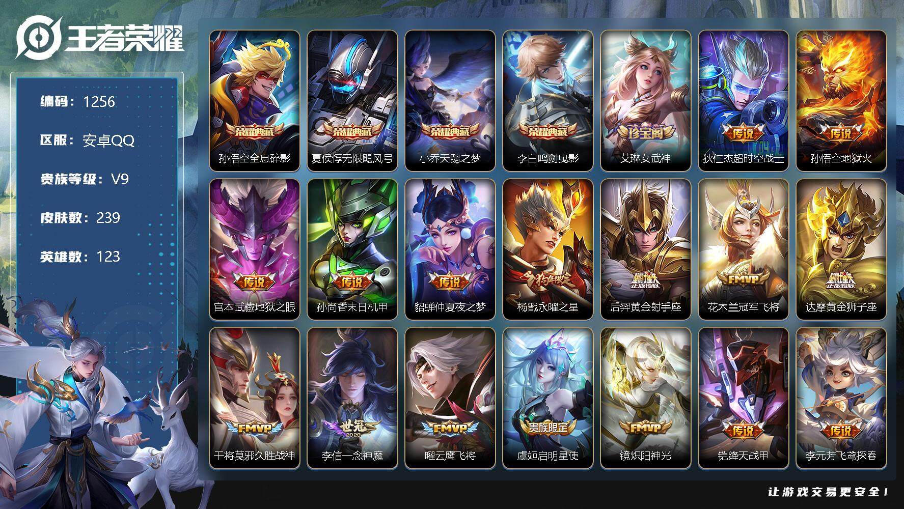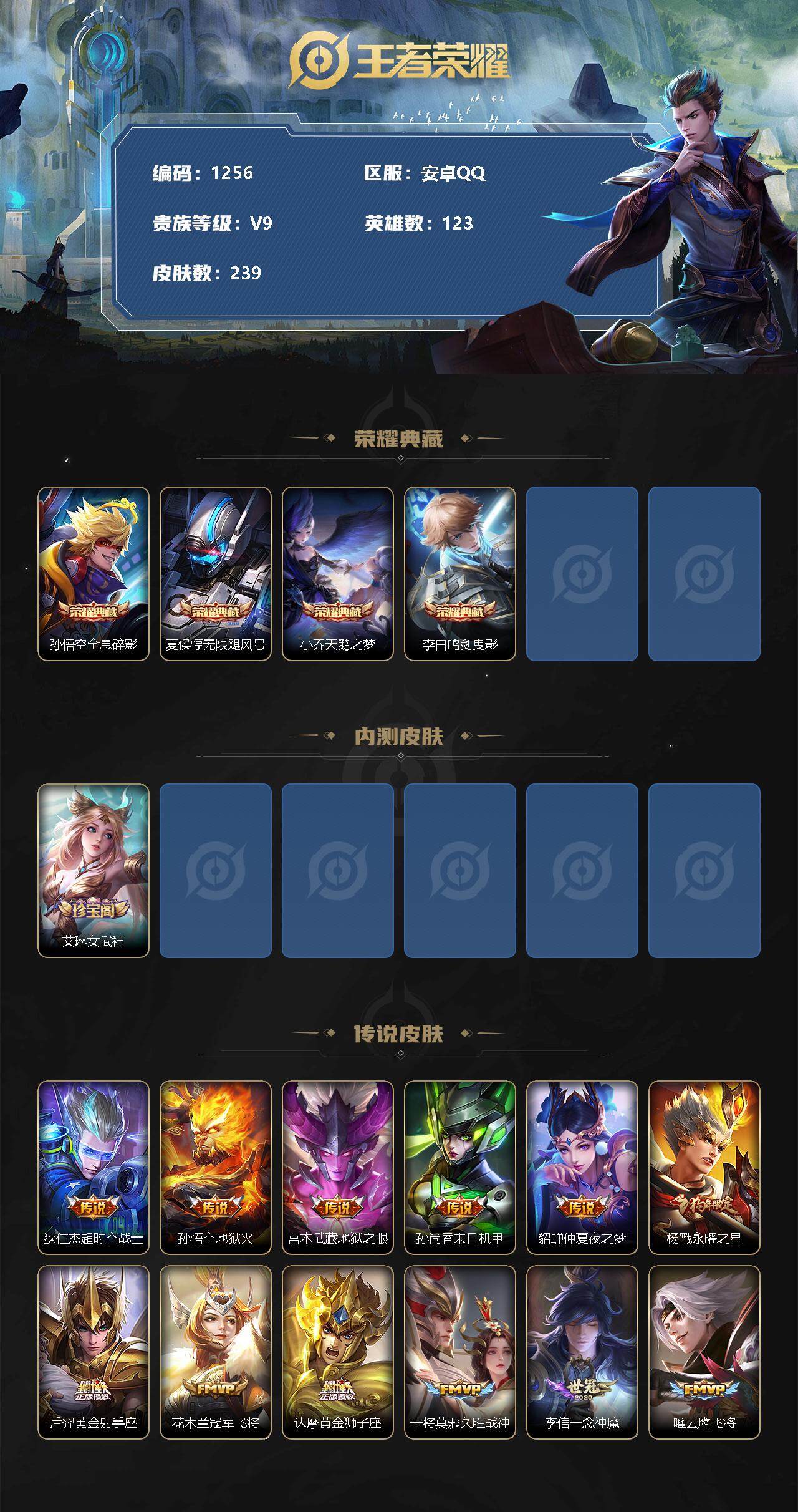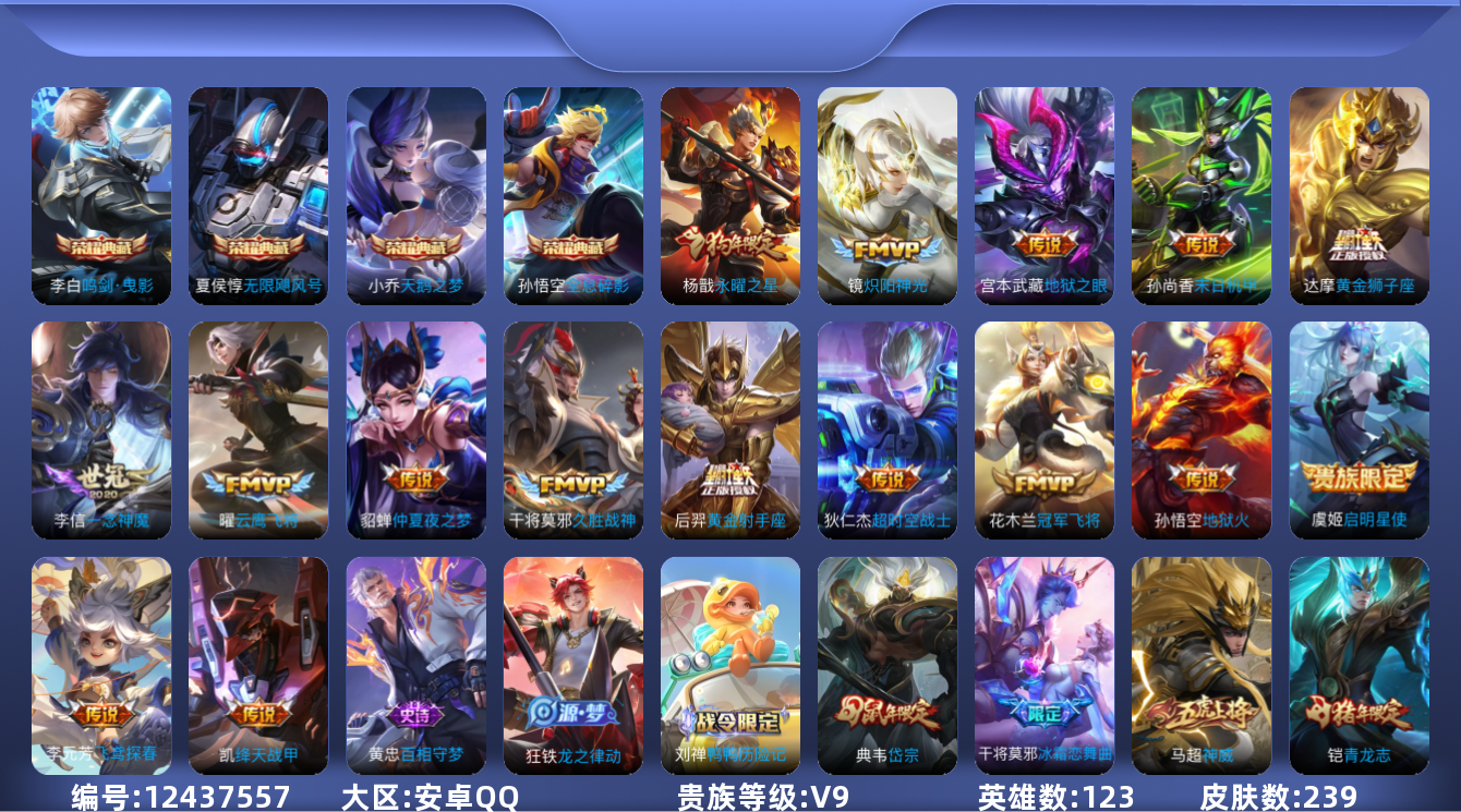 [12437557]【商品标题】:安卓Q-V9-至尊星耀IV段位-123英雄-239皮肤-4典藏-0珍品无双-0无双-0珍品传说-16传说-68史诗