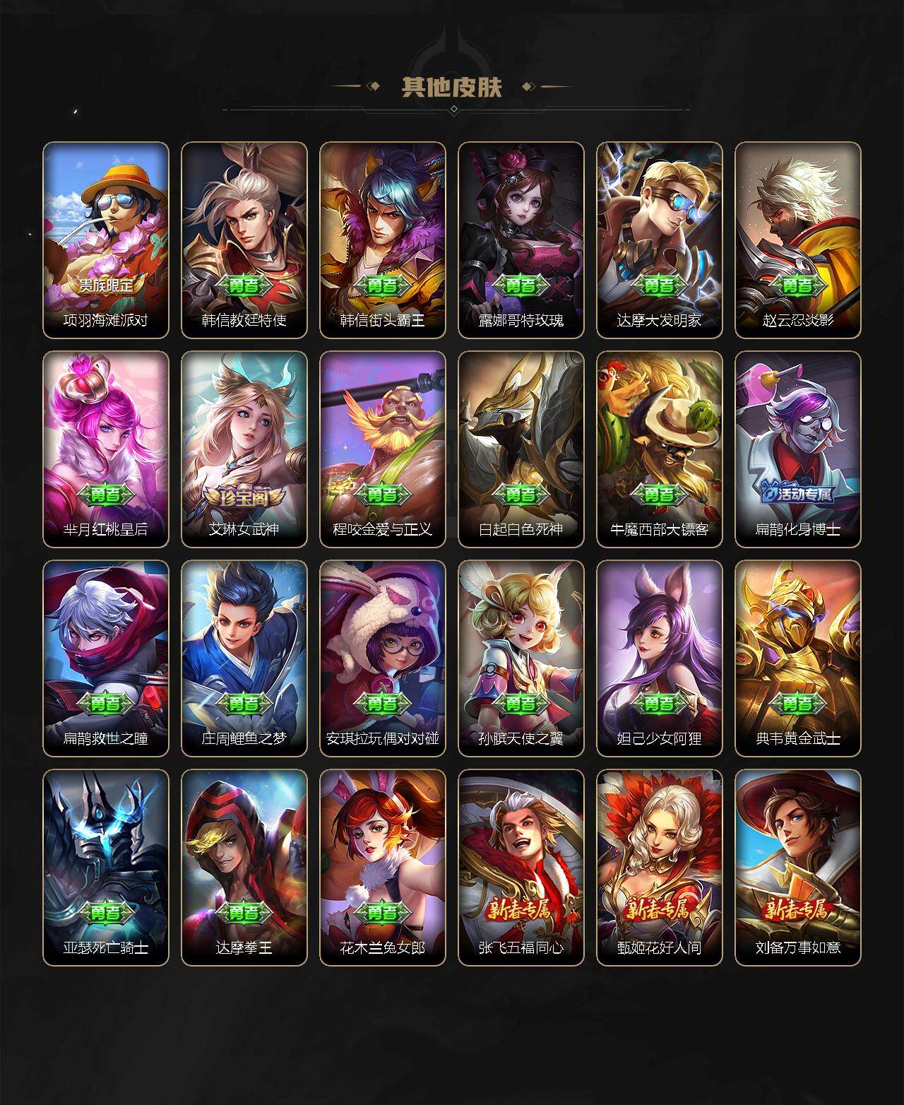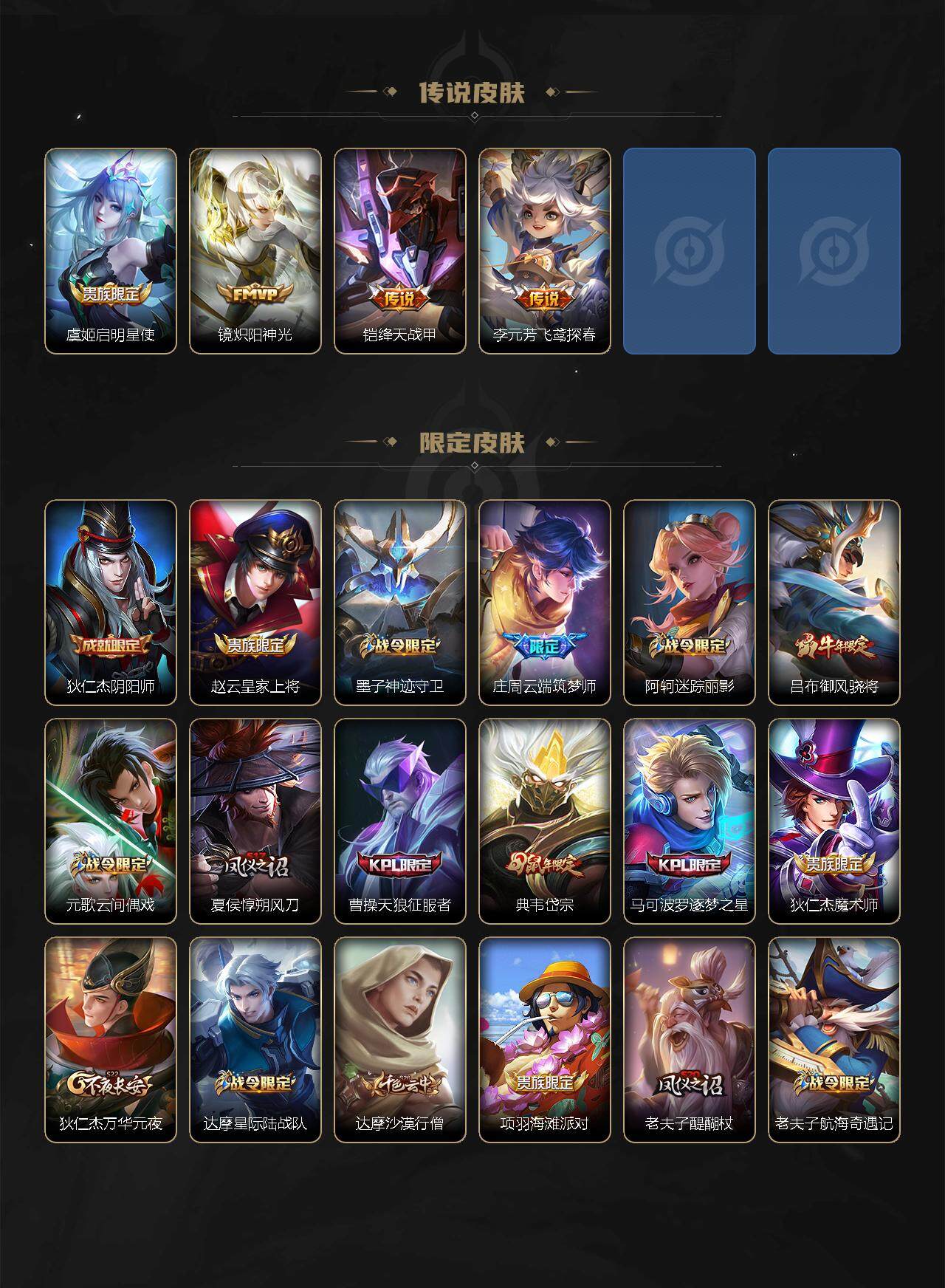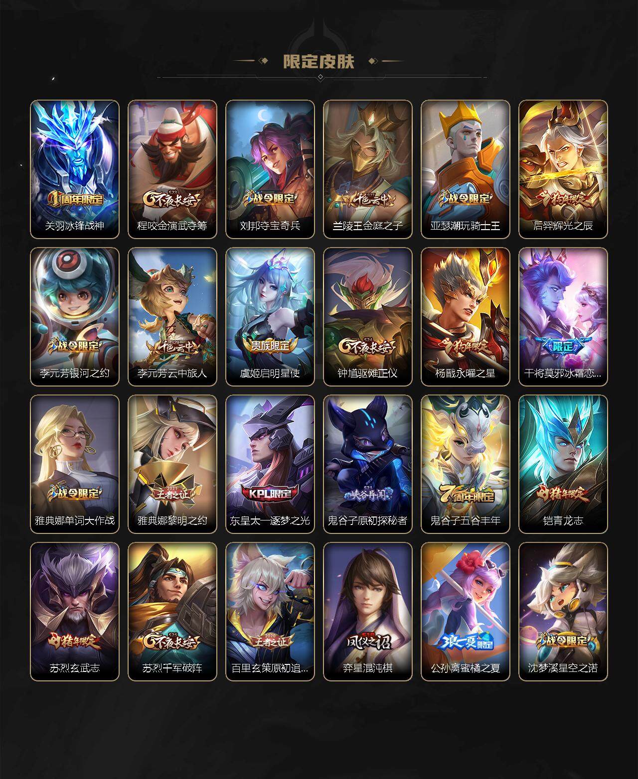 【限定皮肤】:狄仁杰阴阳师,赵云皇家上将,墨子神迹守卫,庄周云端筑梦师,阿轲迷踪丽影,吕布御风骁将,元歌云间偶戏,夏侯惇朔风刀,曹操天狼征服者,典韦岱宗,马可波罗逐梦之星,狄仁杰魔术师,狄仁杰万华元夜,达摩星际陆战队,达摩沙漠行僧,项羽海滩派对,老夫子醍醐杖,老夫子航海奇遇记,关羽冰锋战神,程咬金演武夺筹,刘邦夺宝奇兵,兰陵王金庭之子,亚瑟潮玩骑士王,后羿辉光之辰,李元芳银河之约,李元芳云中旅人,虞姬启明星使,钟馗驱傩正仪,杨戬永曜之星,干将莫邪冰霜恋舞曲,雅典娜单词大作战,雅典娜黎明之约,东皇太一逐梦之光,鬼谷子原初探秘者,鬼谷子五谷丰年,铠青龙志,苏烈玄武志,苏烈千军破阵,百里玄策原初追逐者,弈星混沌棋,公孙离蜜橘之夏,沈梦溪星空之诺,沈梦溪大漠名商,明世隐疑决卦,裴擒虎李小龙,裴擒虎擒涛扼浪,米莱狄胡桃异想国,云中君纤云弄巧,上官婉儿天狼绘梦者,嫦娥拒霜思,蒙犽狂想玩偶喵,鲁班大师探海日志,桑启海盐诗旅,艾琳女武神,张良古海寻踪,鬼谷子天穹祈灯,鲁班七号蔬乡物语,李元芳蔬乡物语