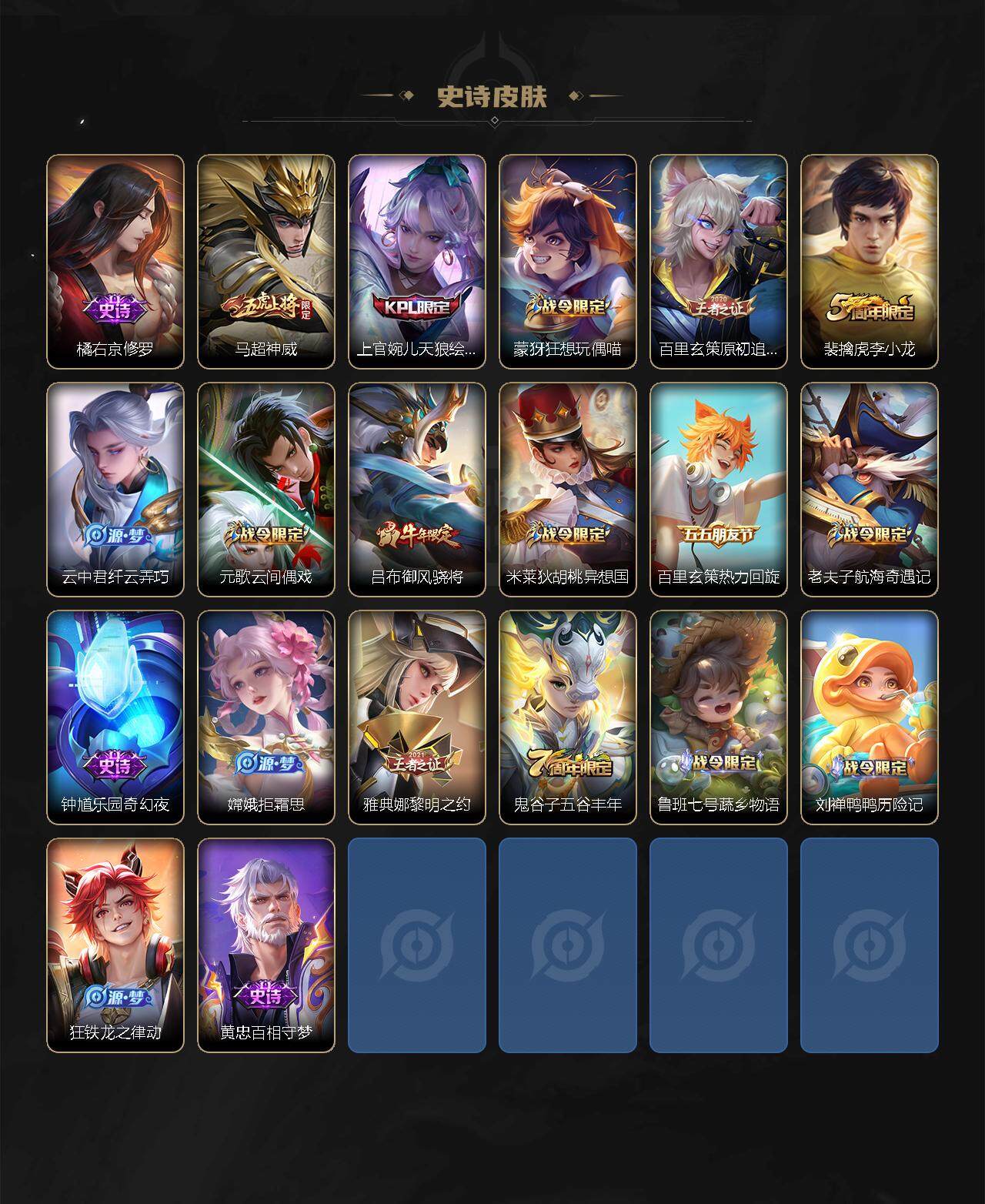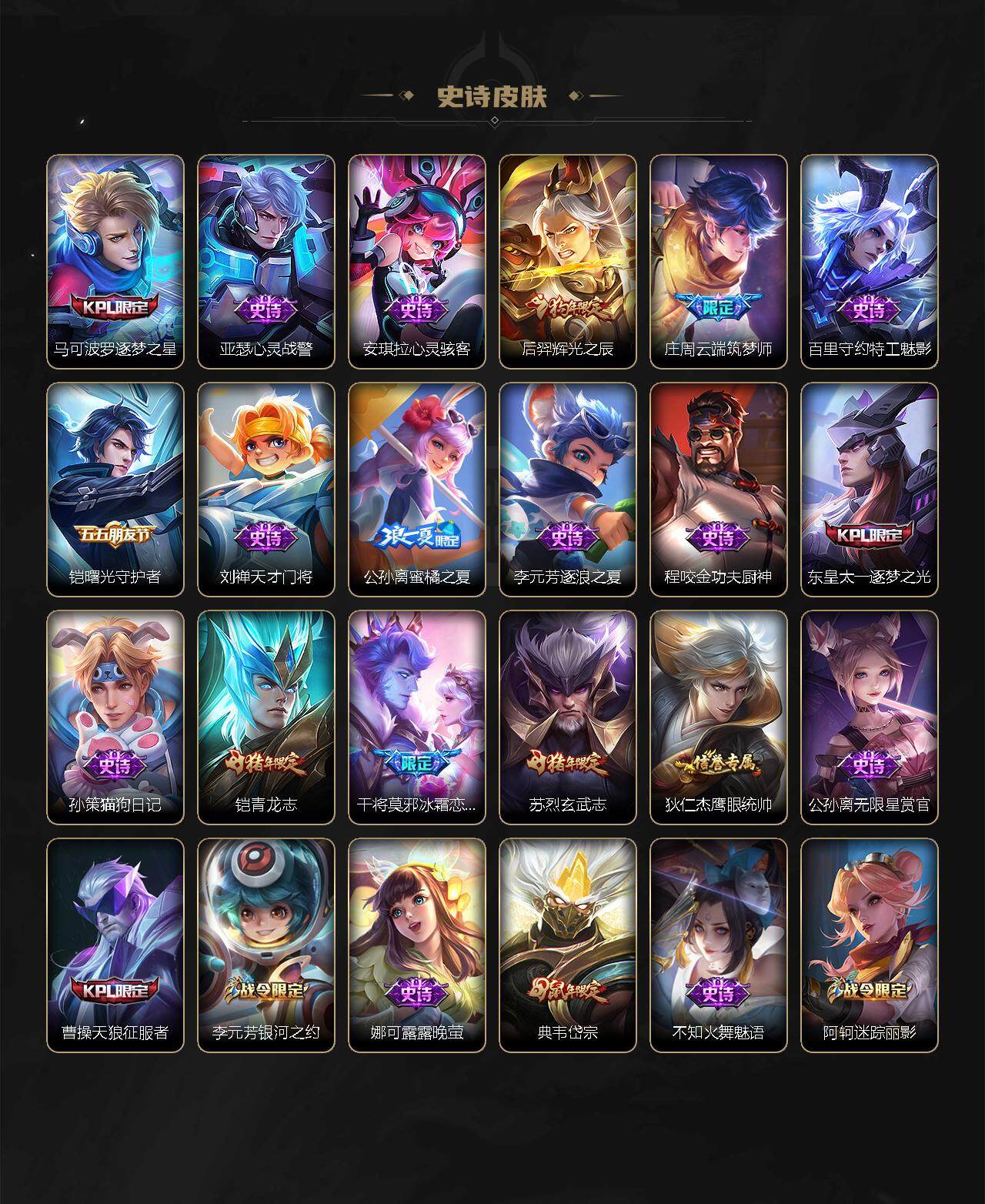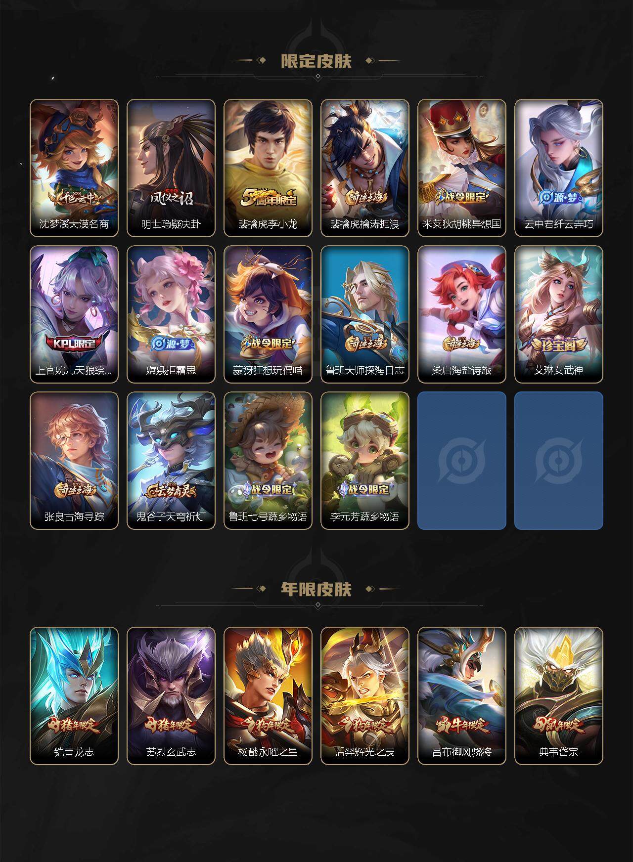 【限定皮肤】:狄仁杰阴阳师,赵云皇家上将,墨子神迹守卫,庄周云端筑梦师,阿轲迷踪丽影,吕布御风骁将,元歌云间偶戏,夏侯惇朔风刀,曹操天狼征服者,典韦岱宗,马可波罗逐梦之星,狄仁杰魔术师,狄仁杰万华元夜,达摩星际陆战队,达摩沙漠行僧,项羽海滩派对,老夫子醍醐杖,老夫子航海奇遇记,关羽冰锋战神,程咬金演武夺筹,刘邦夺宝奇兵,兰陵王金庭之子,亚瑟潮玩骑士王,后羿辉光之辰,李元芳银河之约,李元芳云中旅人,虞姬启明星使,钟馗驱傩正仪,杨戬永曜之星,干将莫邪冰霜恋舞曲,雅典娜单词大作战,雅典娜黎明之约,东皇太一逐梦之光,鬼谷子原初探秘者,鬼谷子五谷丰年,铠青龙志,苏烈玄武志,苏烈千军破阵,百里玄策原初追逐者,弈星混沌棋,公孙离蜜橘之夏,沈梦溪星空之诺,沈梦溪大漠名商,明世隐疑决卦,裴擒虎李小龙,裴擒虎擒涛扼浪,米莱狄胡桃异想国,云中君纤云弄巧,上官婉儿天狼绘梦者,嫦娥拒霜思,蒙犽狂想玩偶喵,鲁班大师探海日志,桑启海盐诗旅,艾琳女武神,张良古海寻踪,鬼谷子天穹祈灯,鲁班七号蔬乡物语,李元芳蔬乡物语