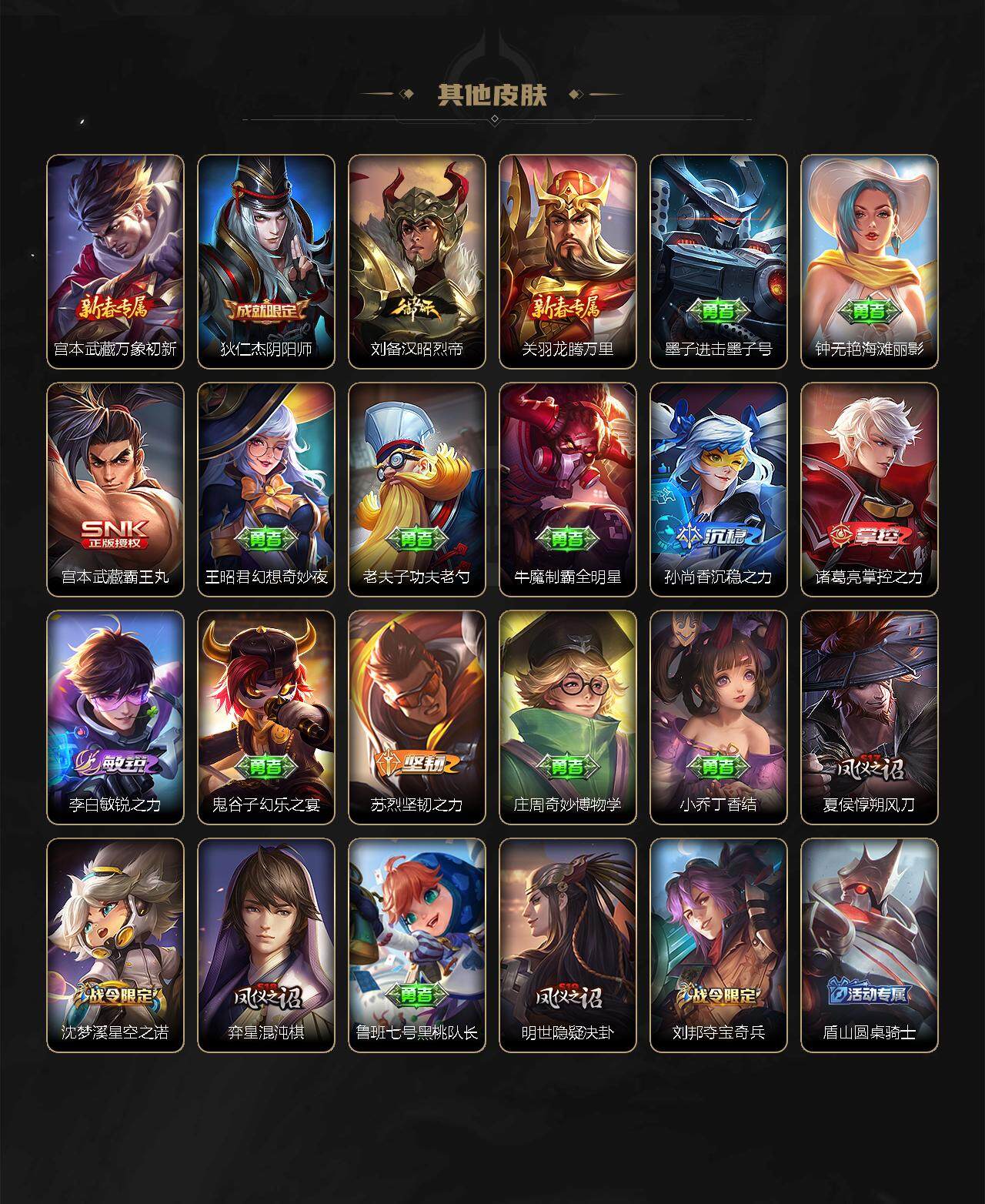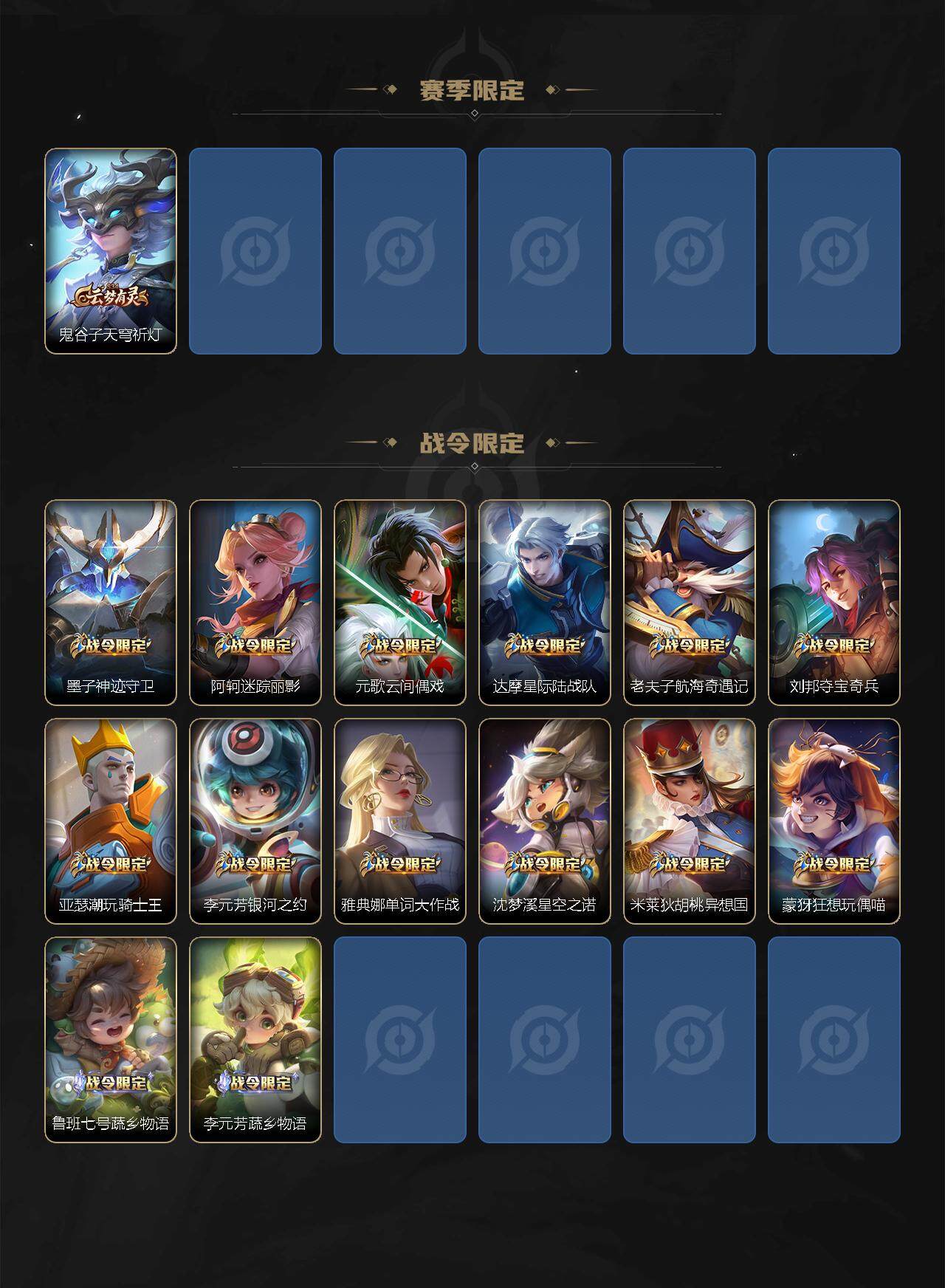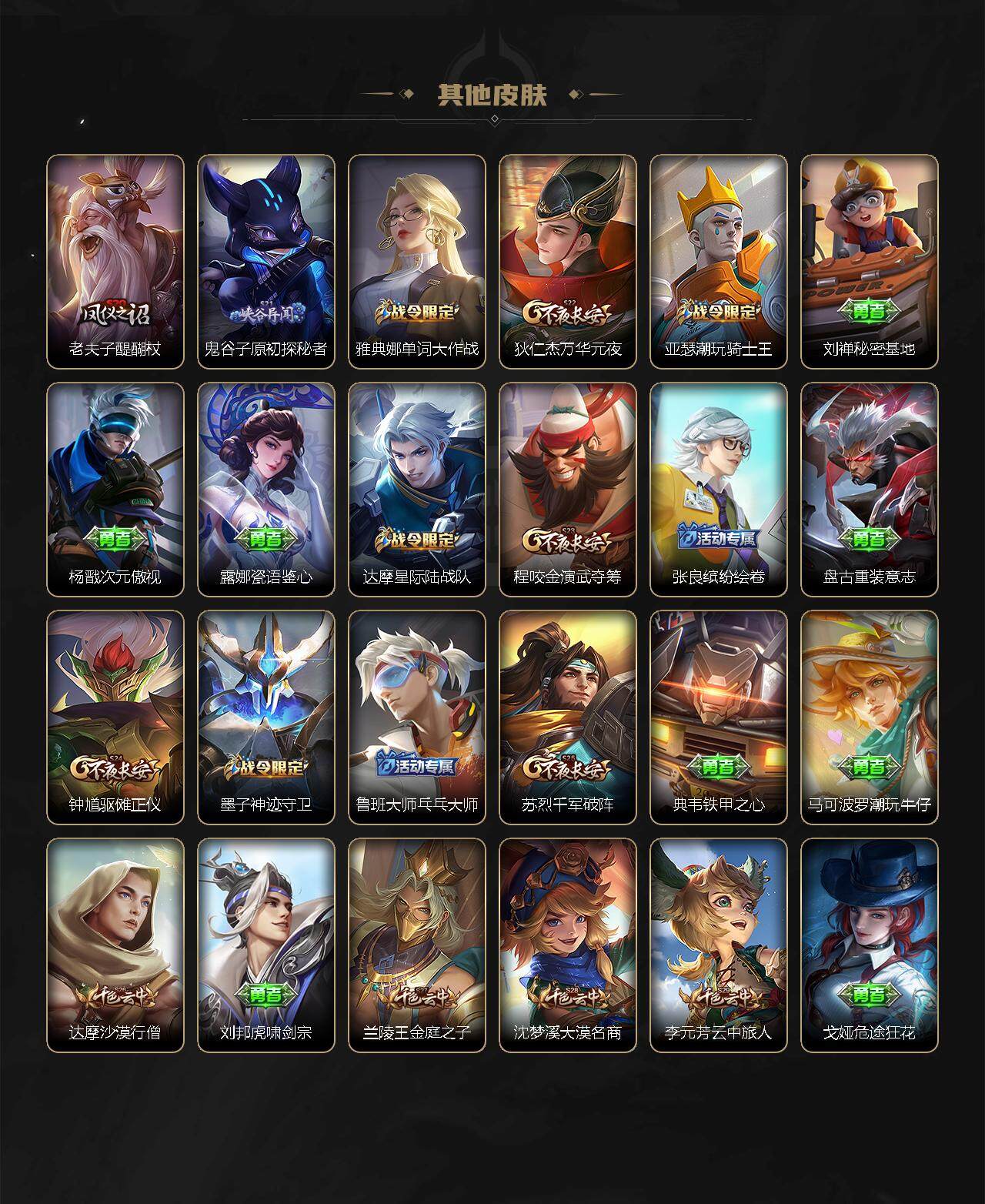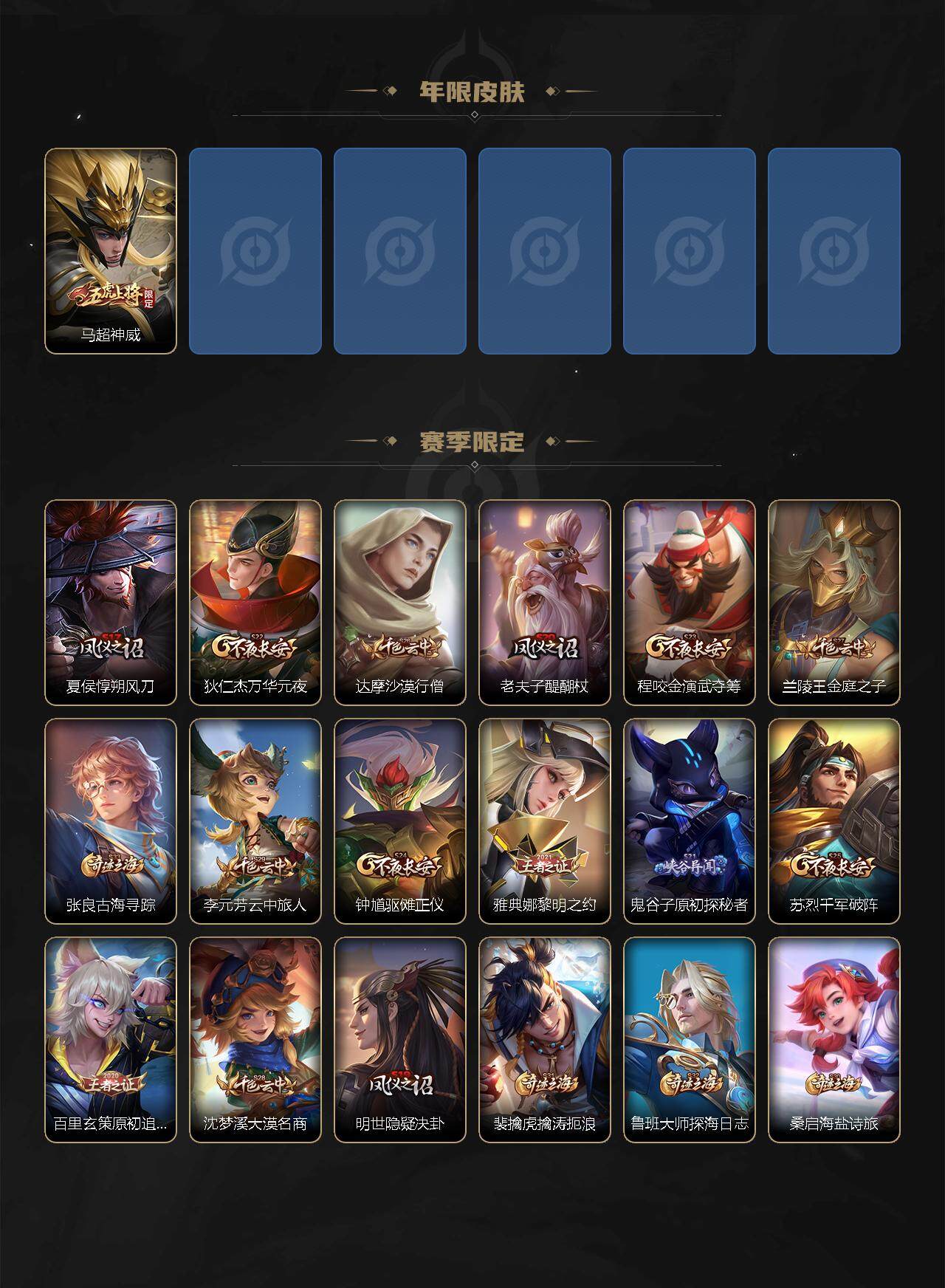 【赛季限定】:夏侯惇朔风刀,狄仁杰万华元夜,达摩沙漠行僧,老夫子醍醐杖,程咬金演武夺筹,兰陵王金庭之子,张良古海寻踪,李元芳云中旅人,钟馗驱傩正仪,雅典娜黎明之约,鬼谷子原初探秘者,苏烈千军破阵,百里玄策原初追逐者,弈星混沌棋,沈梦溪大漠名商,明世隐疑决卦,裴擒虎擒涛扼浪,鲁班大师探海日志,桑启海盐诗旅,鬼谷子天穹祈灯