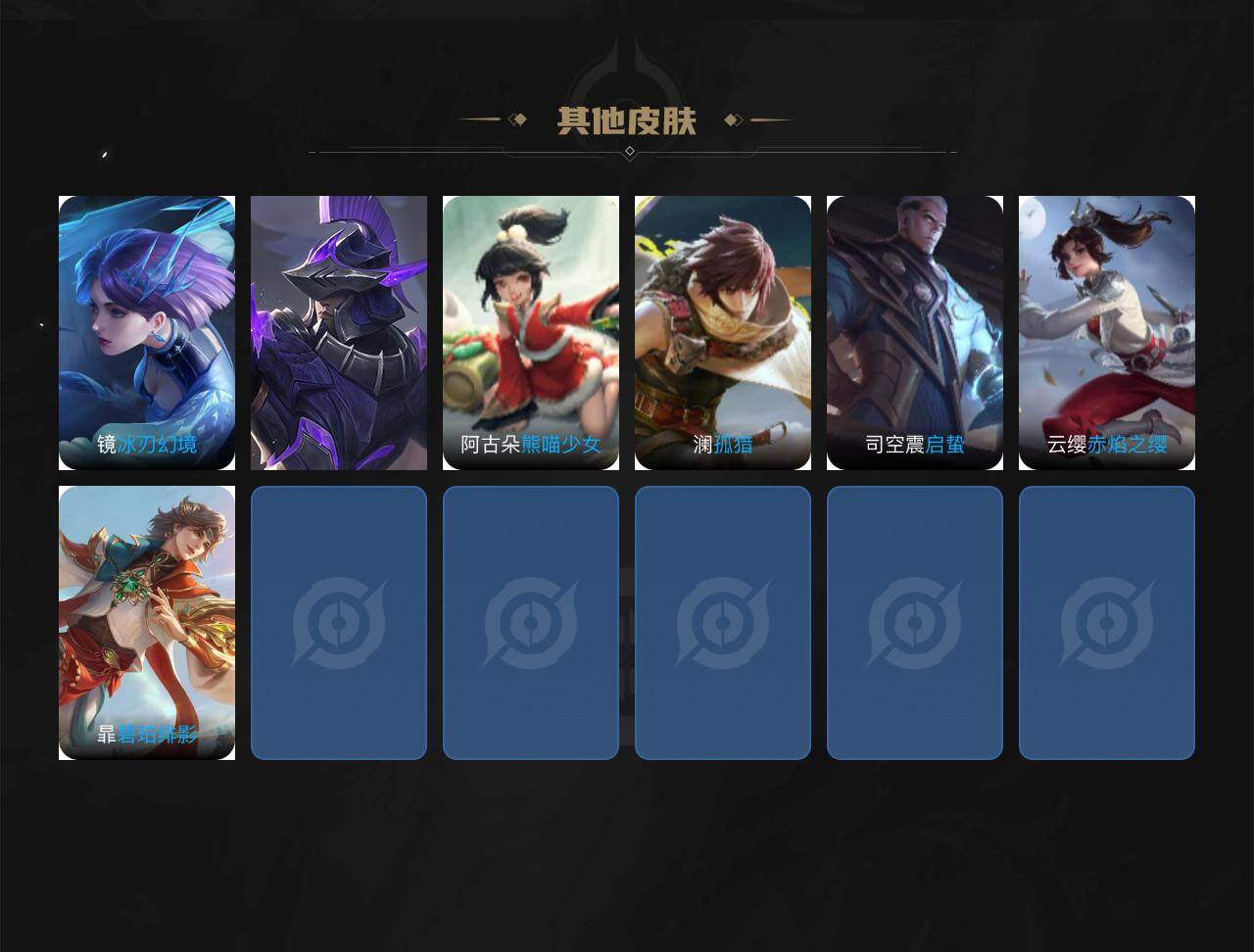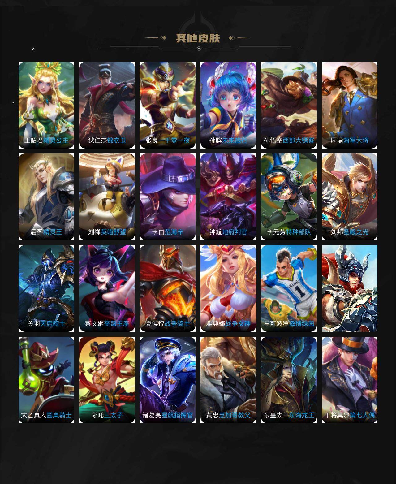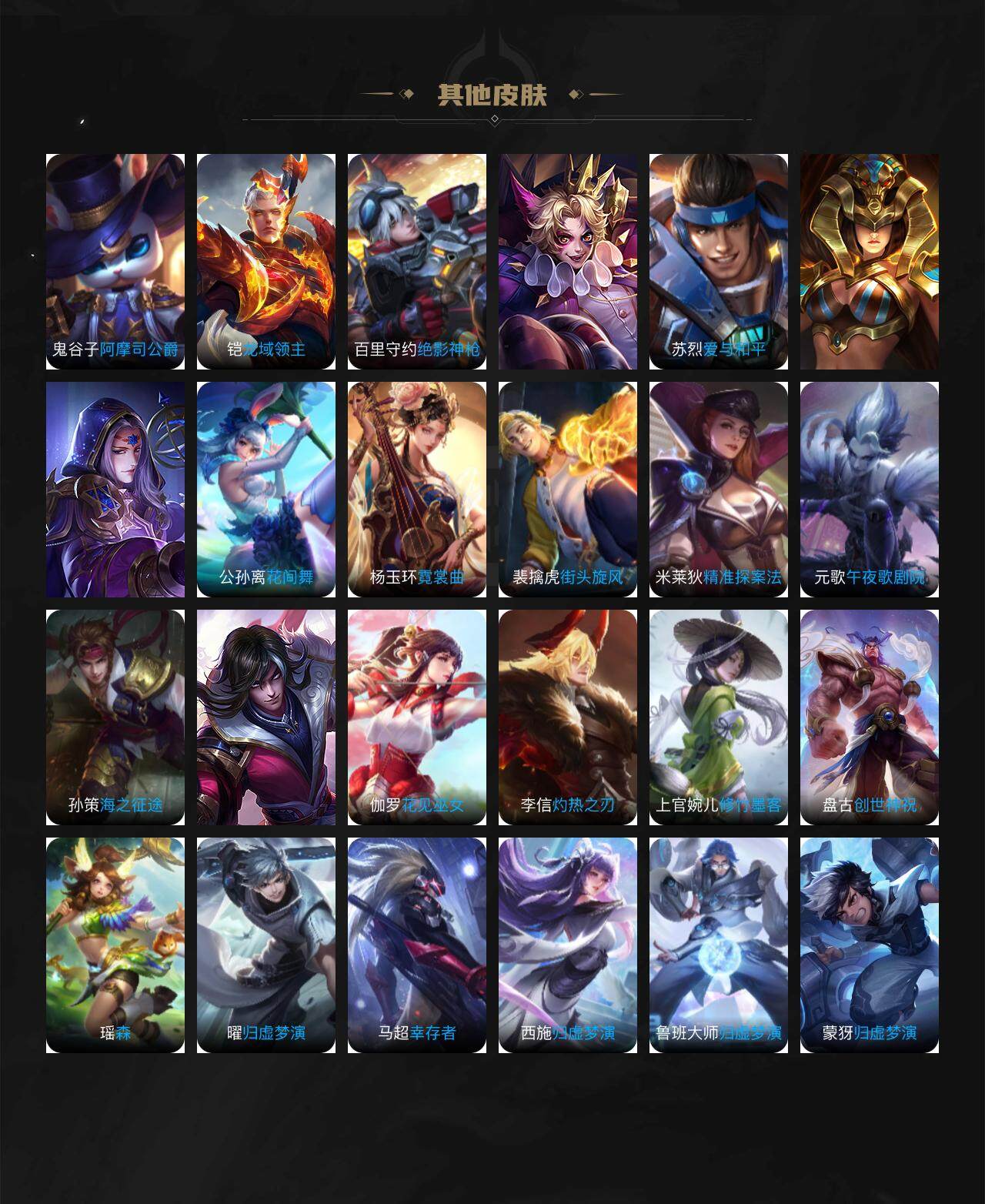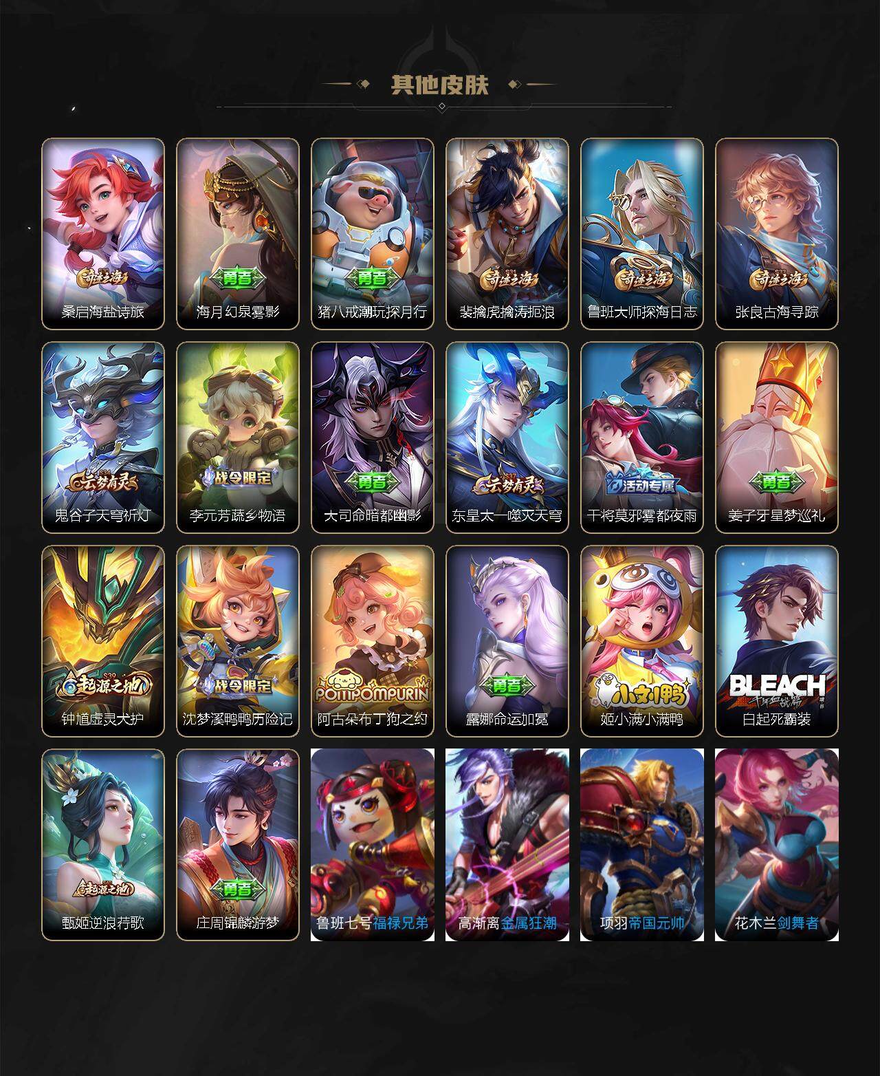【赛季限定】:夏侯惇朔风刀,狄仁杰万华元夜,达摩沙漠行僧,老夫子醍醐杖,程咬金演武夺筹,兰陵王金庭之子,张良古海寻踪,李元芳云中旅人,钟馗驱傩正仪,雅典娜黎明之约,鬼谷子原初探秘者,苏烈千军破阵,百里玄策原初追逐者,弈星混沌棋,沈梦溪大漠名商,明世隐疑决卦,裴擒虎擒涛扼浪,鲁班大师探海日志,桑启海盐诗旅,鬼谷子天穹祈灯