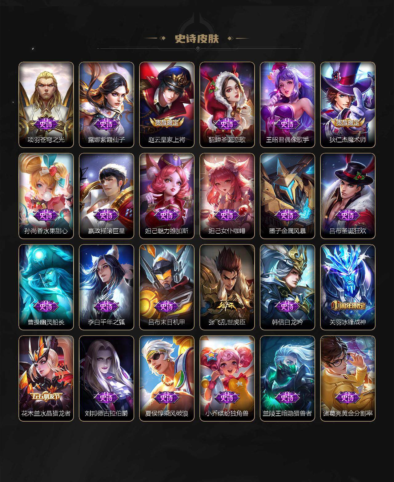 娜可露露晚萤,李元芳逐浪之夏,不知火舞魅语,公孙离无限星赏官,孙策猫狗日记,露娜紫霞仙子,诸葛亮黄金分割率,王昭君偶像歌手,韩信白龙吟,项羽苍穹之光,吕布末日机甲,橘右京修罗,嬴政摇滚巨星,刘禅天才门将,安琪拉心灵骇客,程咬金功夫厨神,刘邦德古拉伯爵,兰陵王暗隐猎兽者,曹操幽灵船长,亚瑟心灵战警,钟馗乐园奇幻夜,小乔缤纷独角兽,夏侯惇乘风破浪,花木兰水晶猎龙者,铠曙光守护者,百里玄策热力回旋,墨子金属风暴,百里玄策原初追逐者,吕布圣诞狂欢,貂蝉圣诞恋歌,百里守约特工魅影,嫦娥拒霜思,雅典娜黎明之约,李白千年之狐