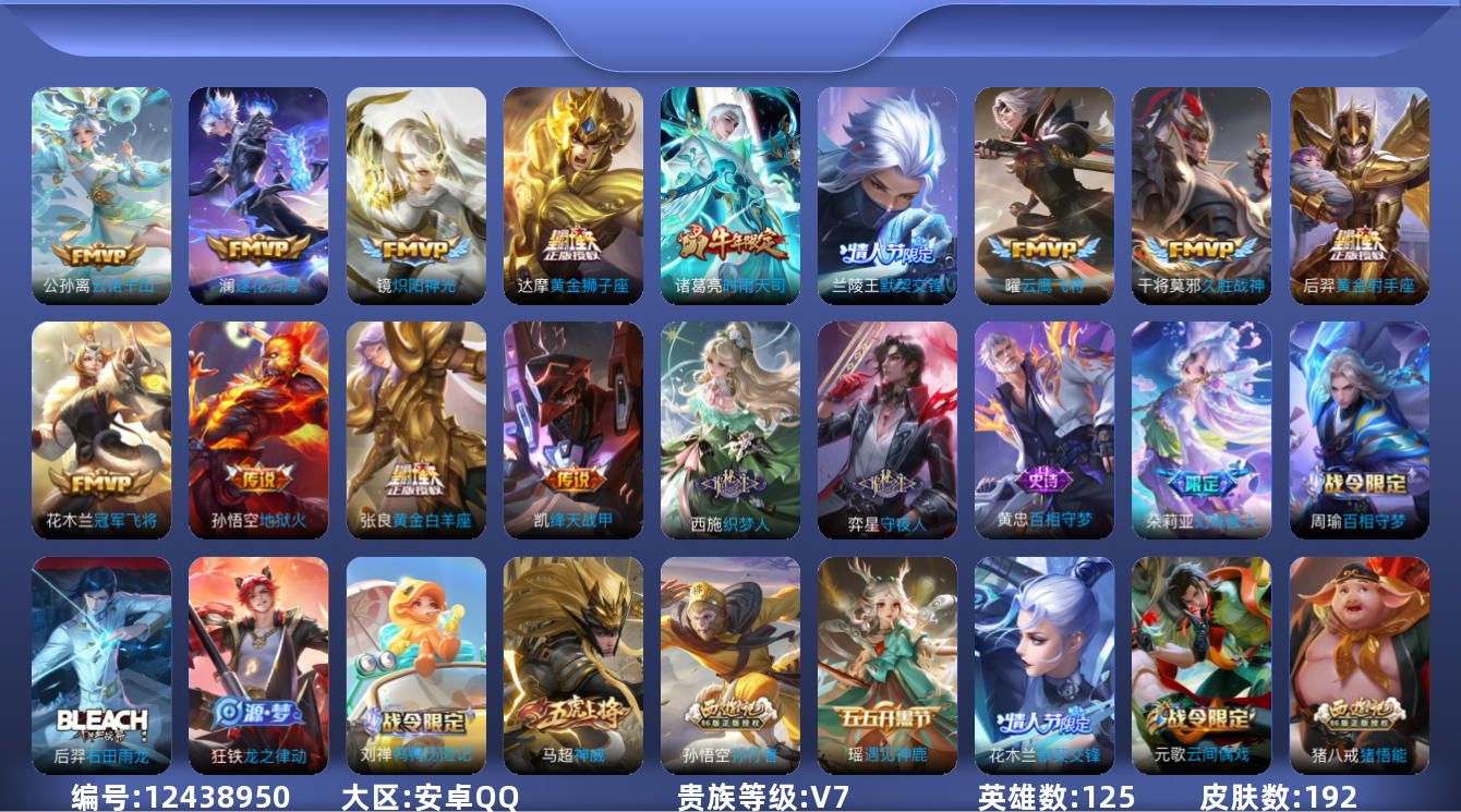 [12438950]【商品标题】:安卓Q-V7-最强王者段位-125英雄-192皮肤-0典藏-0珍品无双-0无双-0珍品传说-13传说-50史诗