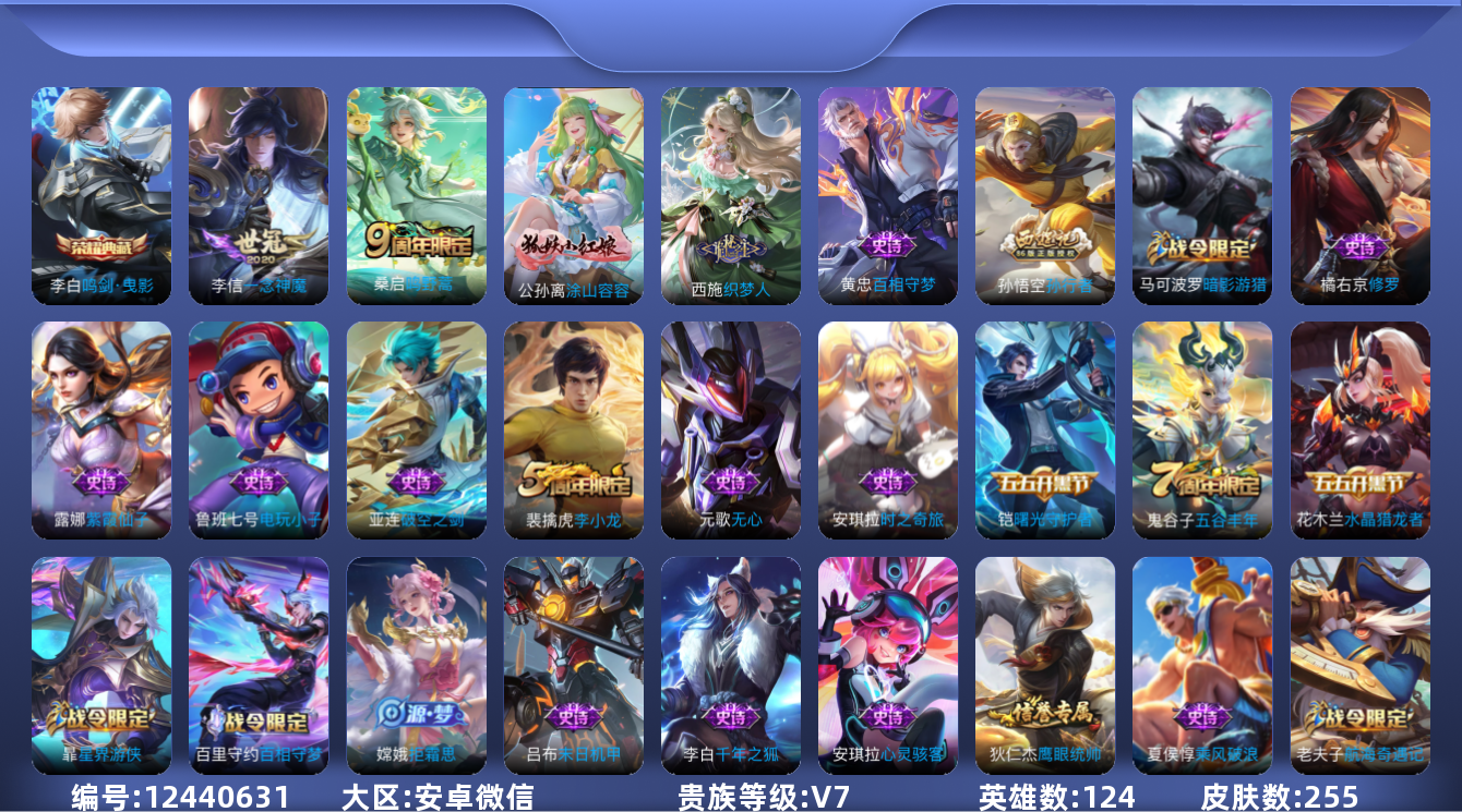 [12440631]发育路36段-安卓WX-V7-永恒钻石II段位-124英雄-255皮肤-1典藏-0珍品无双-0无双-0珍品传说-2传说-67史诗 【英雄全皮】:蒙恬全皮 【荣耀典藏】:李白鸣剑曳影 【传说皮肤】:桑启鸣野蒿,李信一念神魔 【限定皮肤】:白起狰,蔡文姬夏日便利店,虞姬夏日便利店,姜子牙天穹之誓,狄仁杰阴阳师,虞姬凯尔特女王,赵云皇家上将,墨子神迹守卫,嬴政优雅恋人,孙尚香蔷薇恋人,庄周高山流水,高渐离死亡摇滚,阿轲迷踪丽影,钟无艳超时空战士,扁鹊炼金王,扁鹊奇幻香踪,芈月重明,芈月幻夜卜梦,元歌无心,甄姬落雪兰心,曹操烛龙,典韦穷奇,马可波罗暗影游猎,狄仁杰魔术师,狄仁杰万华元夜,达摩沙漠行僧,项羽海滩派对,老夫子醍醐杖,老夫子航海奇遇记,程咬金演武夺筹,刘邦夺宝奇兵,兰陵王金庭之子,孙悟空孙行者,牛魔御旌,后羿圣弓游侠,李元芳银河之约,李元芳云中旅人,钟馗驱傩正仪,杨戬潮玩骑兵,干将莫邪真爱魔法,雅典娜单词大作战,雅典娜黎明之约,蔡文姬繁星吟游,太乙真人饕餮,鬼谷子原初探秘者,鬼谷子五谷丰年,黄忠火炮绅士,苏烈千军破阵,百里玄策原初追逐者,弈星混沌棋,梦奇顽趣,沈梦溪大漠名商,明世隐疑决卦,裴擒虎李小龙,裴擒虎擒涛扼浪,狂铁御狮,米莱狄御霄,盾山御銮,猪八戒西部大镖客,上官婉儿梁祝,嫦娥拒霜思,嫦娥暖冬兔眠,蒙犽狂想玩偶喵,鲁班大师探海日志,桑启海盐诗旅,暃星界游侠,艾琳女武神,张良古海寻踪,蒙恬荣光圣徽,妲己灵卜魔法,鬼谷子天穹祈灯,刘邦剑破天穹,程咬金群星魔术团,刘备异域游侠 【赛季限定】:扁鹊炼金王,白起狰,芈月重明,曹操烛龙,典韦穷奇,狄仁杰万华元夜,达摩沙漠行僧,老夫子醍醐杖,程咬金演武夺筹,兰陵王金庭之子,张良古海寻踪,牛魔御旌,李元芳云中旅人,虞姬凯尔特女王,钟馗驱傩正仪,雅典娜黎明之约,太乙真人饕餮,鬼谷子原初探秘者,苏烈千军破阵,百里玄策原初追逐者,弈星混沌棋,梦奇顽趣,沈梦溪大漠名商,明世隐疑决卦,裴擒虎擒涛扼浪,狂铁御狮,米莱狄御霄,盾山御銮,鲁班大师探海日志,桑启海盐诗旅,鬼谷子天穹祈灯,蒙恬荣光圣徽,刘邦剑破天穹,姜子牙天穹之誓 【战令限定】:墨子神迹守卫,蔡文姬夏日便利店,虞姬夏日便利店,阿轲迷踪丽影,钟无艳超时空战士,扁鹊奇幻香踪,芈月幻夜卜梦,甄姬落雪兰心,马可波罗暗影游猎,老夫子航海奇遇记,刘邦夺宝奇兵,后羿圣弓游侠,李元芳银河之