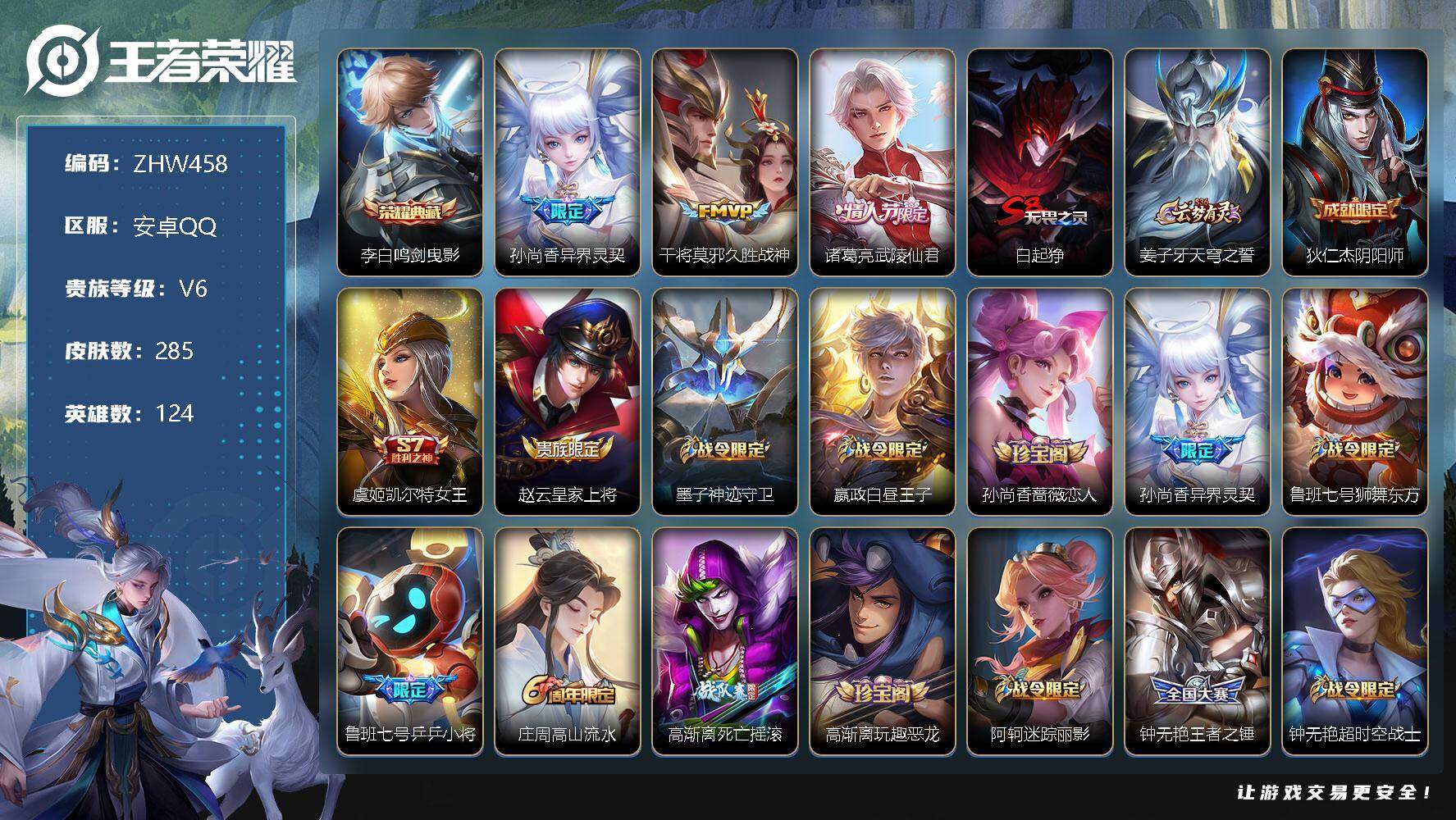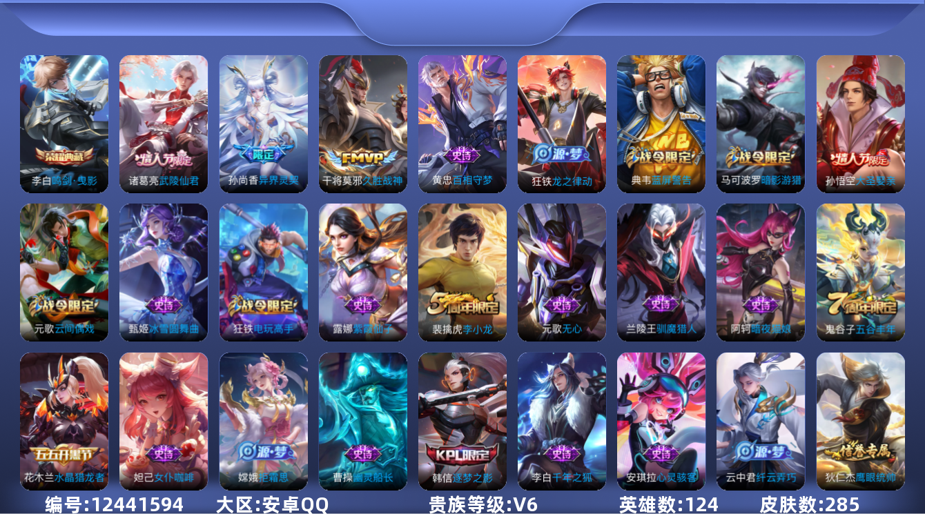 [12441594]【特价急出/详情看图】:安卓Q-V6-至尊星耀II段位-124英雄-285皮肤-1典藏-3传说-74史诗