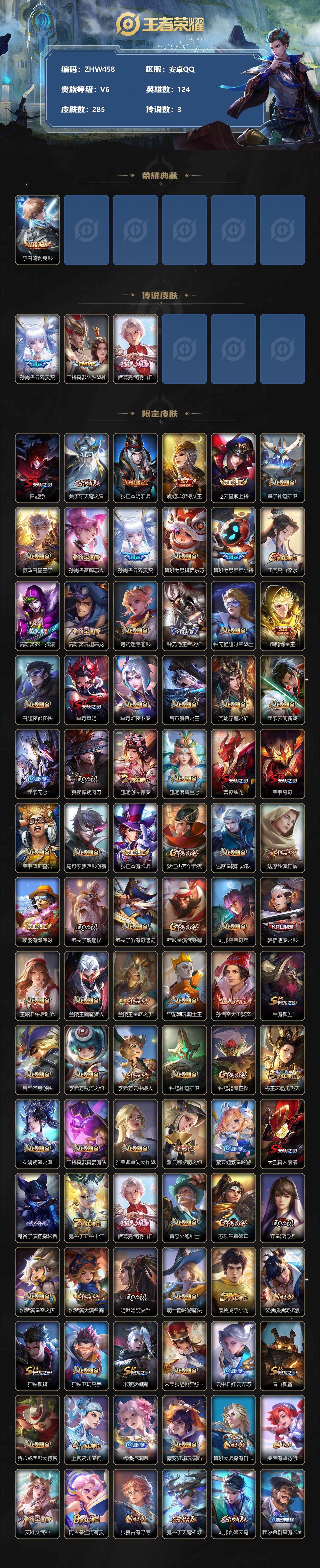 [12441594]【特价急出/详情看图】:安卓Q-V6-至尊星耀II段位-124英雄-285皮肤-1典藏-3传说-74史诗 【英雄全皮】:鬼谷子全皮,狂铁全皮,空空儿全皮 【荣耀典藏】:李白鸣剑曳影 【传说皮肤】:孙尚香异界灵契,干将莫邪久胜战神,诸葛亮武陵仙君 【限定皮肤】:白起狰,姜子牙天穹之誓,狄仁杰阴阳师,虞姬凯尔特女王,赵云皇家上将,墨子神迹守卫,嬴政白昼王子,孙尚香蔷薇恋人,孙尚香异界灵契,鲁班七号狮舞东方,鲁班七号乒乒小将,庄周高山流水,高渐离死亡摇滚,高渐离玩趣恶龙,阿轲迷踪丽影,钟无艳王者之锤,钟无艳超时空战士,扁鹊炼金王,白起夜都怪侠,芈月重明,芈月幻夜卜梦,吕布猎兽之王,周瑜赤莲之焰,元歌云间偶戏,元歌无心,夏侯惇朔风刀,甄姬游园惊梦,甄姬落雪兰心,曹操烛龙,典韦穷奇,典韦蓝屏警告,马可波罗暗影游猎,狄仁杰魔术师,狄仁杰万华元夜,达摩星际陆战队,达摩沙漠行僧,项羽海滩派对,老夫子醍醐杖,老夫子航海奇遇记,程咬金演武夺筹,刘邦夺宝奇兵,韩信逐梦之影,王昭君午后时光,兰陵王驯魔猎人,兰陵王金庭之子,亚瑟潮玩骑士王,孙悟空大圣娶亲,牛魔御旌,后羿圣弓游侠,李元芳银河之约,李元芳云中旅人,钟馗神迹守卫,钟馗驱傩正仪,杨玉环遇见飞天,女娲朔望之晖,干将莫邪真爱魔法,雅典娜单词大作战,雅典娜黎明之约,蔡文姬繁星吟游,太乙真人饕餮,鬼谷子原初探秘者,鬼谷子五谷丰年,诸葛亮武陵仙君,黄忠火炮绅士,苏烈千军破阵,弈星混沌棋,沈梦溪星空之诺,沈梦溪大漠名商,明世隐疑决卦,明世隐吟游魔法,裴擒虎李小龙,裴擒虎擒涛扼浪,狂铁御狮,狂铁电玩高手,米莱狄御霄,米莱狄胡桃异想国,云中君纤云弄巧,盾山御銮,猪八戒西部大镖客,上官婉儿梁祝,嫦娥拒霜思,蒙犽狂想玩偶喵,鲁班大师探海日志,桑启海盐诗旅,艾琳女武神,阿古朵江河有灵,张良古海寻踪,鬼谷子天穹祈灯,刘邦剑破天穹,程咬金群星魔术团,周瑜熔金海岸 【赛季限定】:扁鹊炼金王,白起狰,芈月重明,夏侯惇朔风刀,曹操烛龙,典韦穷奇,狄仁杰万华元夜,达摩沙漠行僧,老夫子醍醐杖,程咬金演武夺筹,兰陵王金庭之子,张良古海寻踪,牛魔御旌,李元芳云中旅人,虞姬凯尔特女王,钟馗驱傩正仪,雅典娜黎明之约,太乙真人饕餮,鬼谷子原初探秘者,苏烈千军破阵,弈星混沌棋,沈梦溪大漠名商,明世隐疑决卦,裴擒虎擒涛扼浪,狂铁御狮,米莱狄御霄,盾山御銮,鲁班大师探海日志,桑启海