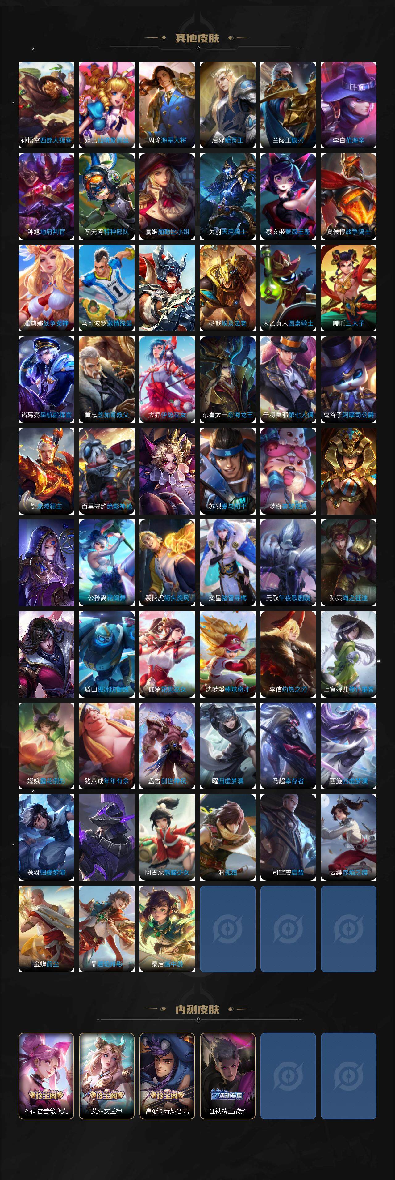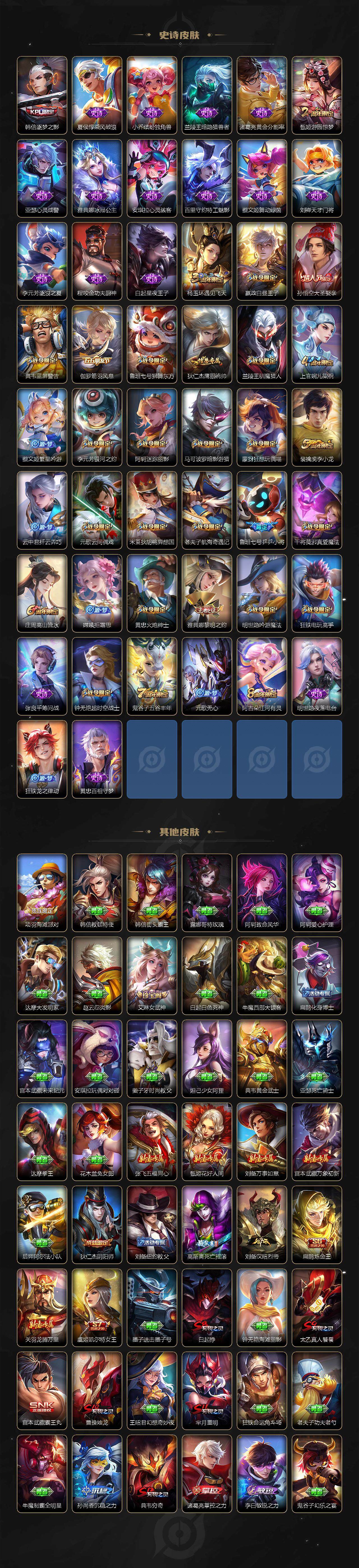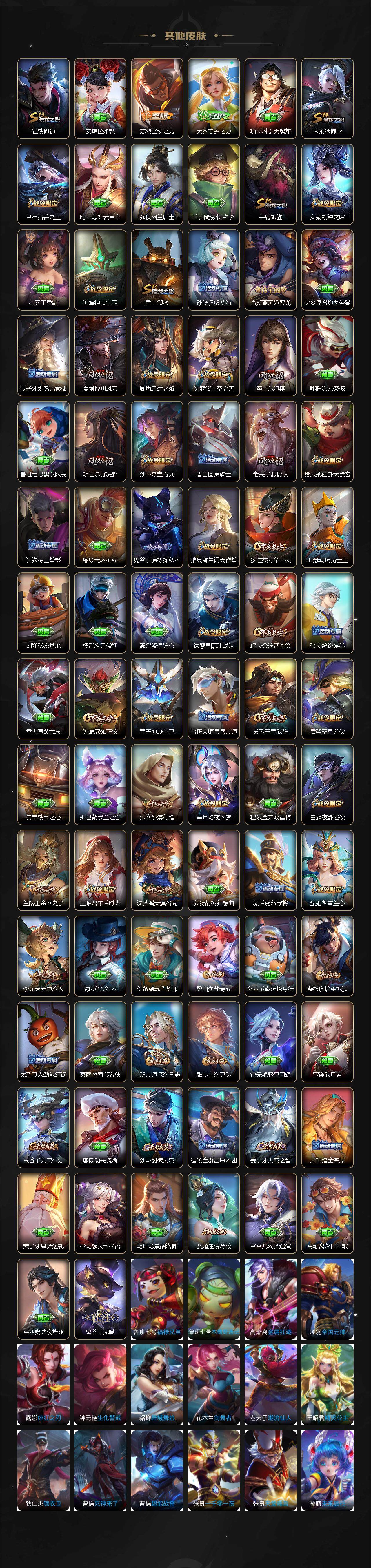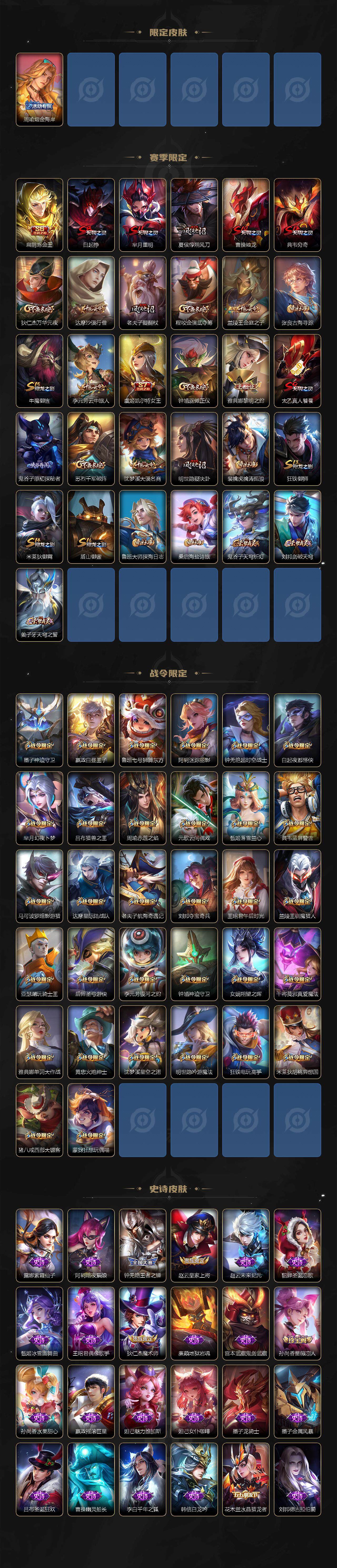 【限定皮肤】:白起狰,姜子牙天穹之誓,狄仁杰阴阳师,虞姬凯尔特女王,赵云皇家上将,墨子神迹守卫,嬴政白昼王子,孙尚香蔷薇恋人,孙尚香异界灵契,鲁班七号狮舞东方,鲁班七号乒乒小将,庄周高山流水,高渐离死亡摇滚,高渐离玩趣恶龙,阿轲迷踪丽影,钟无艳王者之锤,钟无艳超时空战士,扁鹊炼金王,白起夜都怪侠,芈月重明,芈月幻夜卜梦,吕布猎兽之王,周瑜赤莲之焰,元歌云间偶戏,元歌无心,夏侯惇朔风刀,甄姬游园惊梦,甄姬落雪兰心,曹操烛龙,典韦穷奇,典韦蓝屏警告,马可波罗暗影游猎,狄仁杰魔术师,狄仁杰万华元夜,达摩星际陆战队,达摩沙漠行僧,项羽海滩派对,老夫子醍醐杖,老夫子航海奇遇记,程咬金演武夺筹,刘邦夺宝奇兵,韩信逐梦之影,王昭君午后时光,兰陵王驯魔猎人,兰陵王金庭之子,亚瑟潮玩骑士王,孙悟空大圣娶亲,牛魔御旌,后羿圣弓游侠,李元芳银河之约,李元芳云中旅人,钟馗神迹守卫,钟馗驱傩正仪,杨玉环遇见飞天,女娲朔望之晖,干将莫邪真爱魔法,雅典娜单词大作战,雅典娜黎明之约,蔡文姬繁星吟游,太乙真人饕餮,鬼谷子原初探秘者,鬼谷子五谷丰年,诸葛亮武陵仙君,黄忠火炮绅士,苏烈千军破阵,弈星混沌棋,沈梦溪星空之诺,沈梦溪大漠名商,明世隐疑决卦,明世隐吟游魔法,裴擒虎李小龙,裴擒虎擒涛扼浪,狂铁御狮,狂铁电玩高手,米莱狄御霄,米莱狄胡桃异想国,云中君纤云弄巧,盾山御銮,猪八戒西部大镖客,上官婉儿梁祝,嫦娥拒霜思,蒙犽狂想玩偶喵,鲁班大师探海日志,桑启海盐诗旅,艾琳女武神,阿古朵江河有灵,张良古海寻踪,鬼谷子天穹祈灯,刘邦剑破天穹,程咬金群星魔术团,周瑜熔金海岸