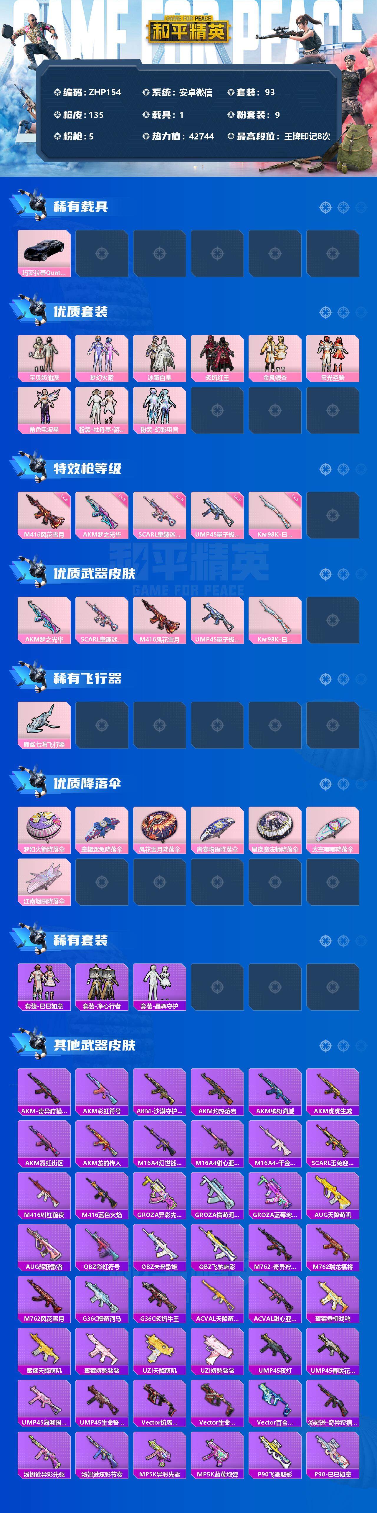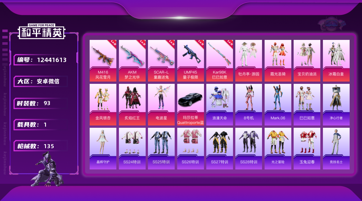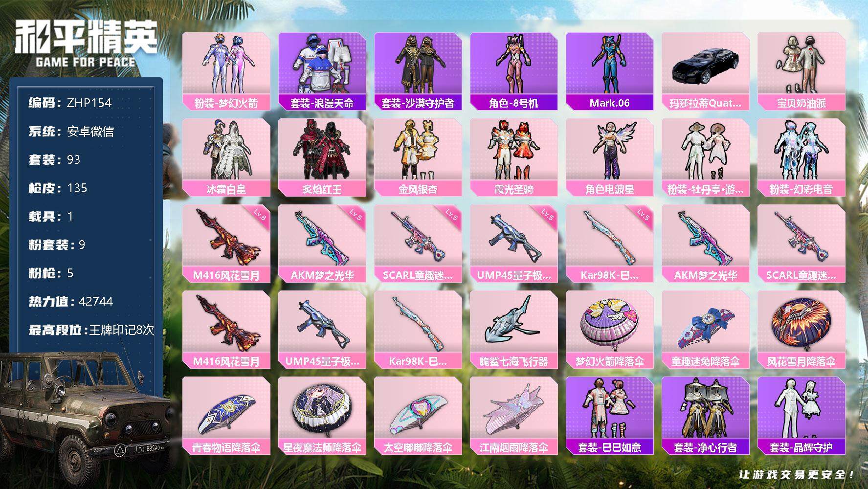 [12441613]【商品标题】:安卓沙漠守护者! 微信-9粉装-5特效枪-1载具-1粉色飞行器-42744热力值-8王牌印记-93套装-135枪皮
