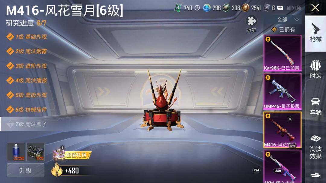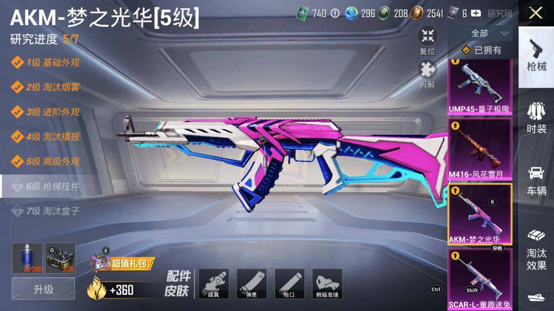 【粉色枪皮等级】:AKM-梦之光华(五级),SCAR-L-童趣迷兔(五级),M416-风花雪月(六级),UMP45-量子极限(五级),Kar98K-巳巳如意(五级)