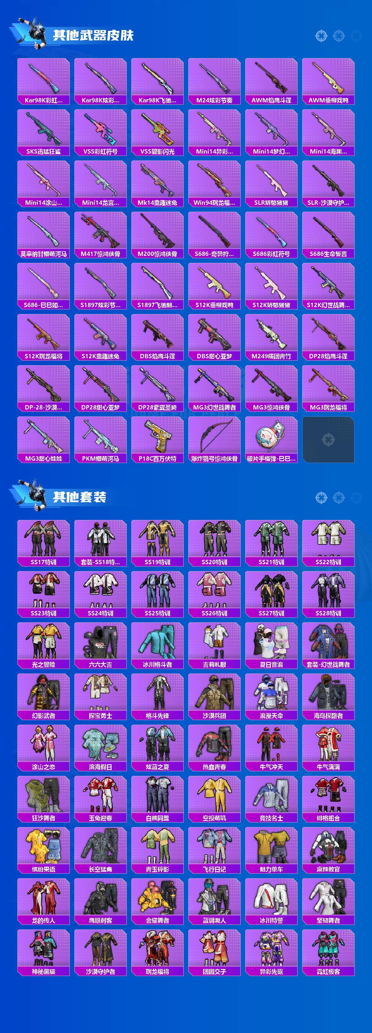 - [11247695]3粉装 3特效枪 6印记 可二次 可修改实名 优质装备:SCAR-L梦幻火箭,洛天依,荧海星豚 热门装扮:音爆索尼克 稀有枪皮:MG-36-沧焰双生,DP-28-豹影疾电 五级特效枪:五级SCAR-L-梦幻火箭,五级DP-28-豹影疾电,五级MG-36-沧焰双生 紫色装扮:田园牧歌,轻风白浪,和煦暖阳,SS22特训,莱茵河畔,白啸长虹,飞狐塔尔斯,SS23特训,幻彩翩翩,妙红点点,摩登艾咪,香榭午后,白兰地假日,娇憨猪猪,梦幻奶油,暖心橘喵,萌趣咩咩,暖心熊熊,SS21特训,绚烂繁星,熠彩粉晶,冰川特警,冷焰舞者,云朵鹅,雪绒豹,SS33特训套装,乐音,SS20特训,猎梦纪元,SS19特训,甜心亚梦,虚音幻奏,都市漫游者,都市魅力,长空猛禽,雪鹰学院,风暴特警,荷畔雨呱,耀眼新星,蓝彩潮人,街头潮人,飞行日记,黑色伏地魔,柠萌假日,夏日倾情,夏日音浪,幻世战舞者,绮丽涂鸦,疯狂小兔子,白熊同盟,空岛之星,甜蜜熊情侣,王牌教练,牛气冲天,炫蓝之夏,牛气满满,玉兔迎春,竞技名士,果汁能量,萌黄之夏,光之冒险 优质战备:全功率超战飞行器,彩虹甜喵降落伞,垂柳戏鸭降落伞,暗夜鎏金降落伞,音爆索尼克降落伞,仲夏莫吉托降落伞,梦幻火箭降落伞,梦幻火箭飞行器