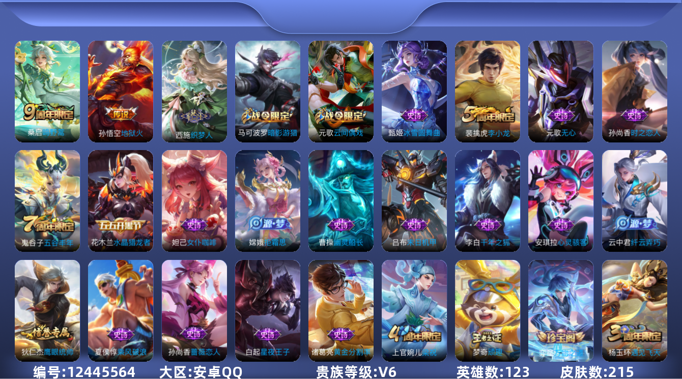 [12445564]【商品标题】:安卓Q-V6-尊贵铂金II段位-123英雄-215皮肤-0典藏-0珍品无双-0无双-0珍品传说-2传说-54史诗