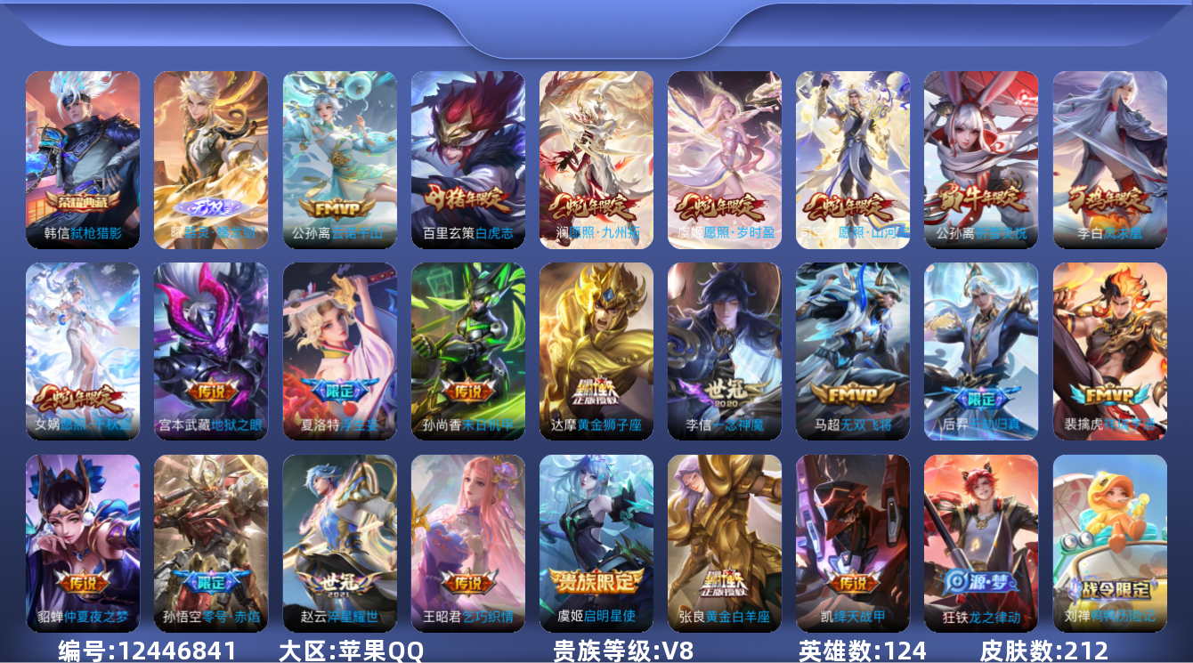 [12446841]【商品标题】:苹果Q-V8-最强王者段位-124英雄-212皮肤-1典藏-0珍品无双-1无双-0珍品传说-23传说-49史诗