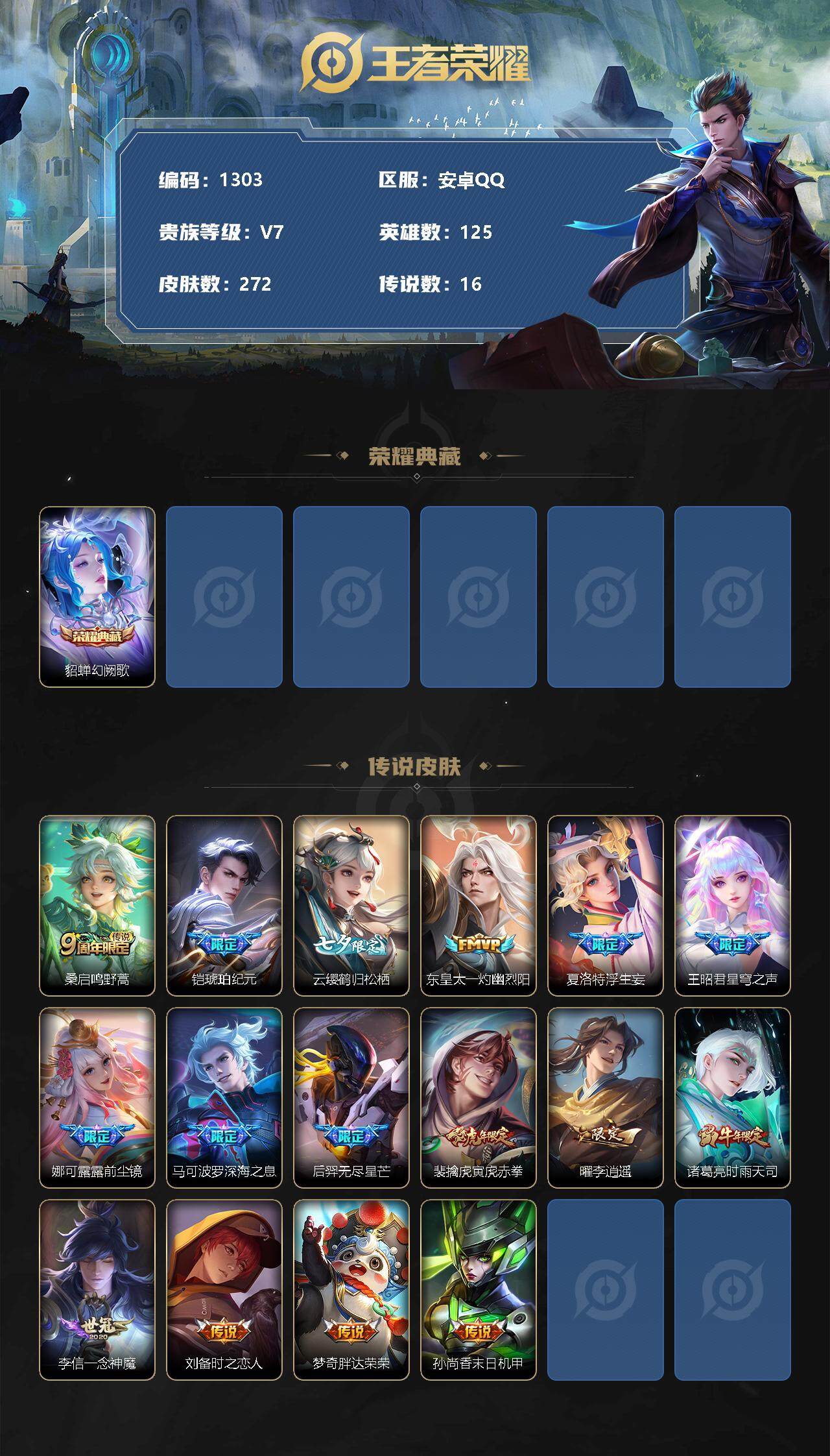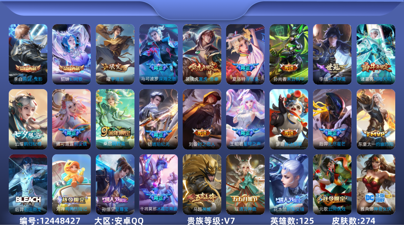 [12448427]【商品标题】:安卓Q-V5-至尊星耀IV段位-125英雄-272皮肤-1典藏-0珍品无双-0无双-0珍品传说-16传说-96史诗