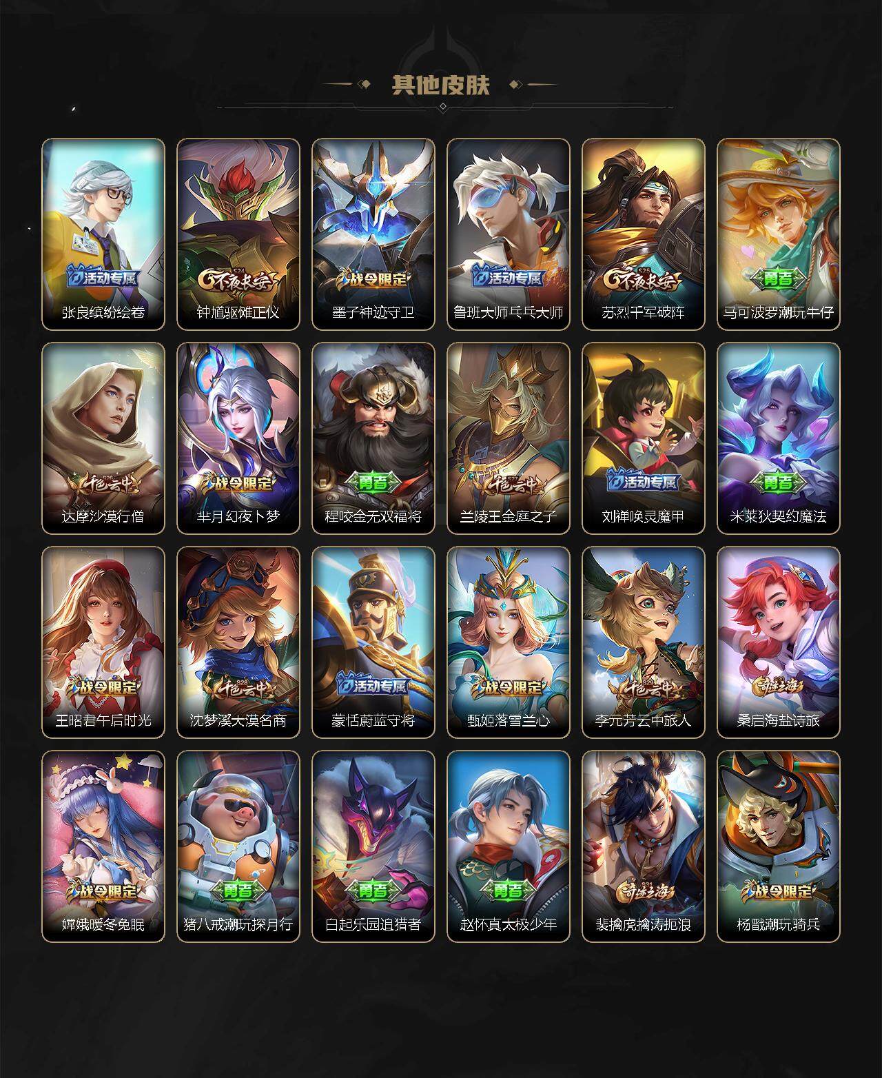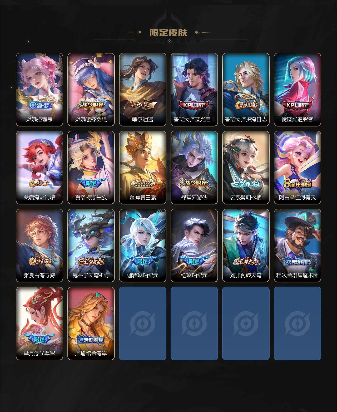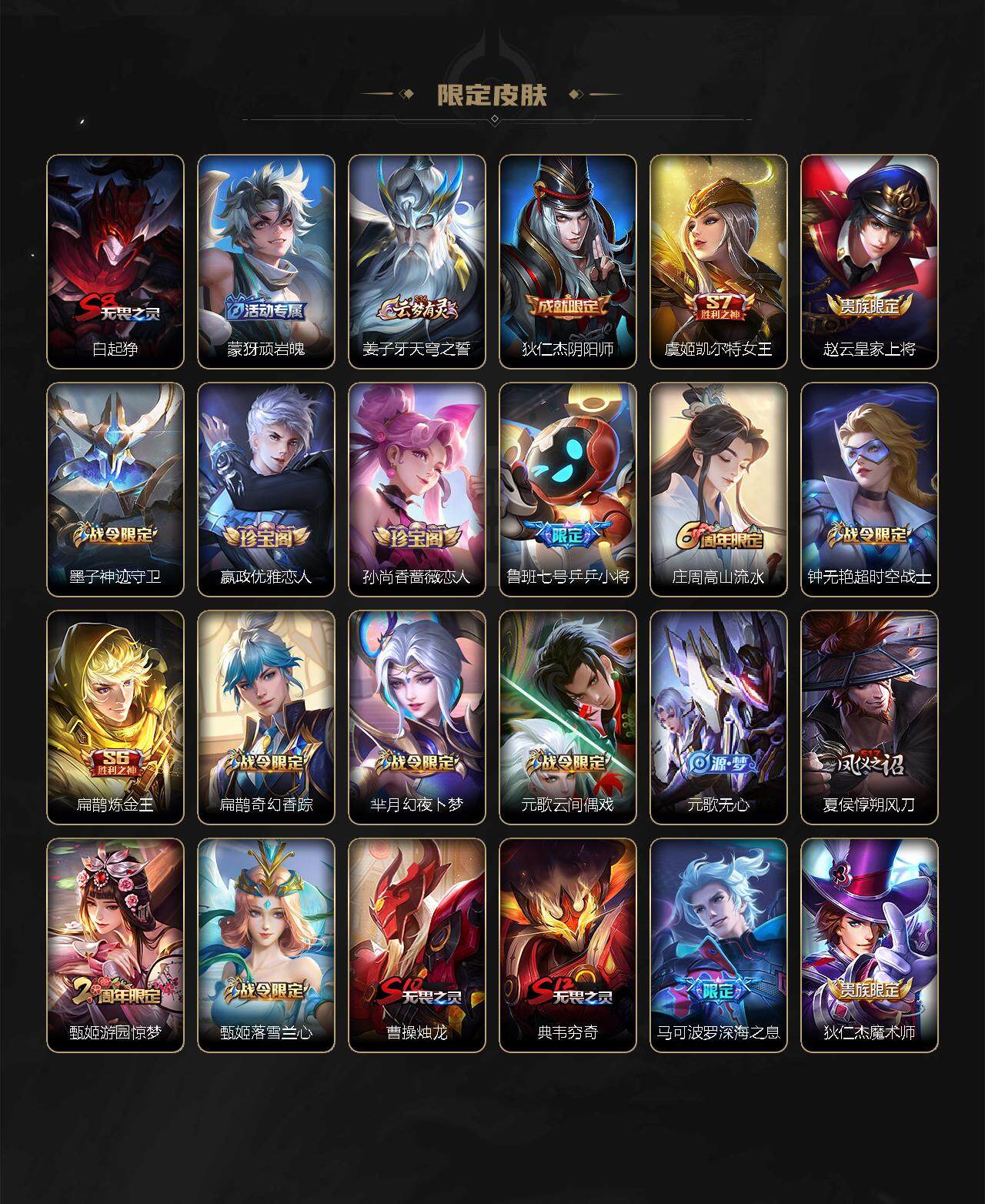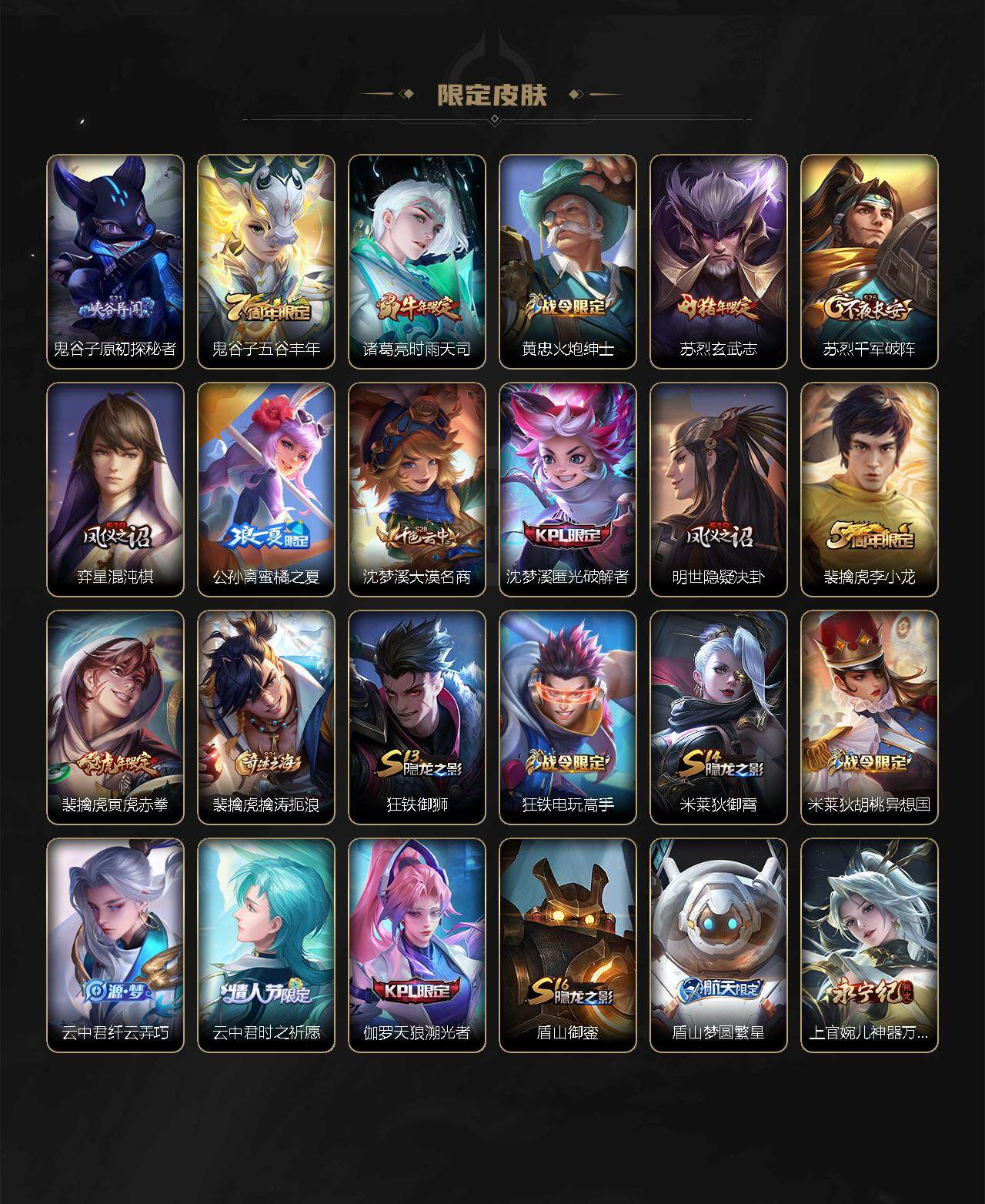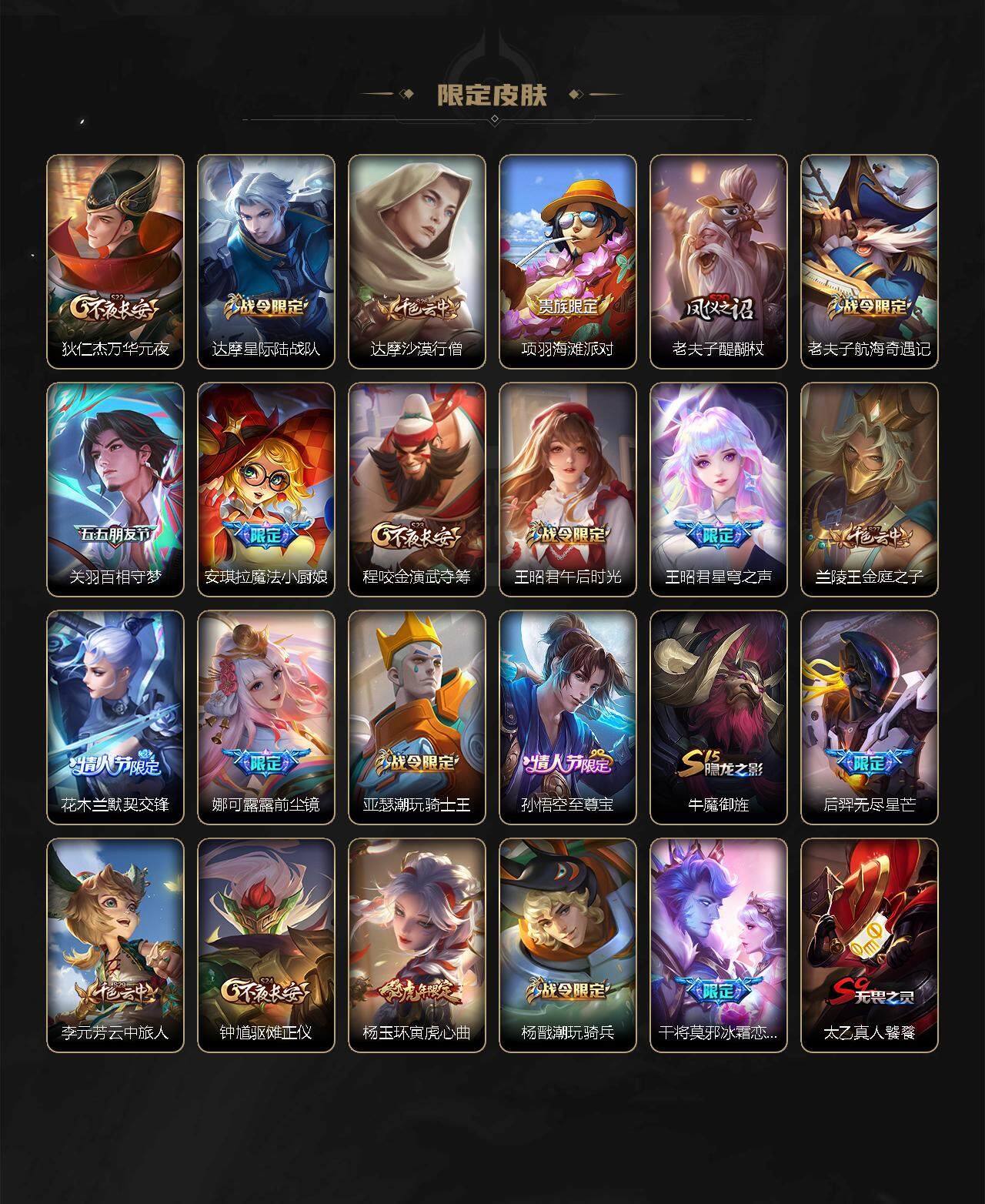 【限定皮肤】:白起狰,蒙犽顽岩魄,姜子牙天穹之誓,狄仁杰阴阳师,虞姬凯尔特女王,赵云皇家上将,墨子神迹守卫,嬴政优雅恋人,孙尚香蔷薇恋人,鲁班七号乒乒小将,庄周高山流水,钟无艳超时空战士,扁鹊炼金王,扁鹊奇幻香踪,芈月幻夜卜梦,元歌云间偶戏,元歌无心,夏侯惇朔风刀,甄姬游园惊梦,甄姬落雪兰心,曹操烛龙,典韦穷奇,马可波罗深海之息,狄仁杰魔术师,狄仁杰万华元夜,达摩星际陆战队,达摩沙漠行僧,项羽海滩派对,老夫子醍醐杖,老夫子航海奇遇记,关羽百相守梦,安琪拉魔法小厨娘,程咬金演武夺筹,王昭君午后时光,王昭君星穹之声,兰陵王金庭之子,花木兰默契交锋,娜可露露前尘镜,亚瑟潮玩骑士王,孙悟空至尊宝,牛魔御旌,后羿无尽星芒,李元芳云中旅人,钟馗驱傩正仪,杨玉环寅虎心曲,杨戬潮玩骑兵,干将莫邪冰霜恋舞曲,太乙真人饕餮,鬼谷子原初探秘者,鬼谷子五谷丰年,诸葛亮时雨天司,黄忠火炮绅士,苏烈玄武志,苏烈千军破阵,弈星混沌棋,公孙离蜜橘之夏,沈梦溪大漠名商,沈梦溪匿光破解者,明世隐疑决卦,裴擒虎李小龙,裴擒虎寅虎赤拳,裴擒虎擒涛扼浪,狂铁御狮,狂铁电玩高手,米莱狄御霄,米莱狄胡桃异想国,云中君纤云弄巧,云中君时之祈愿,伽罗天狼溯光者,盾山御銮,盾山梦圆繁星,上官婉儿神器万象笔,嫦娥拒霜思,嫦娥暖冬兔眠,曜李逍遥 ,鲁班大师匿光启智者,鲁班大师探海日志,镜匿光追影者,桑启海盐诗旅,夏洛特浮生妄,金蝉唐三藏,暃星界游侠,云缨鹤归松栖,阿古朵江河有灵,张良古海寻踪,鬼谷子天穹祈灯,伽罗琥珀纪元,铠琥珀纪元,刘邦剑破天穹,程咬金群星魔术团,芈月浮光幕影,周瑜熔金海岸