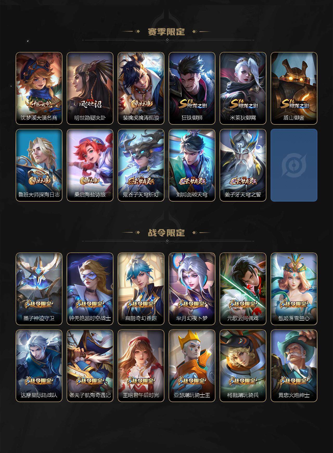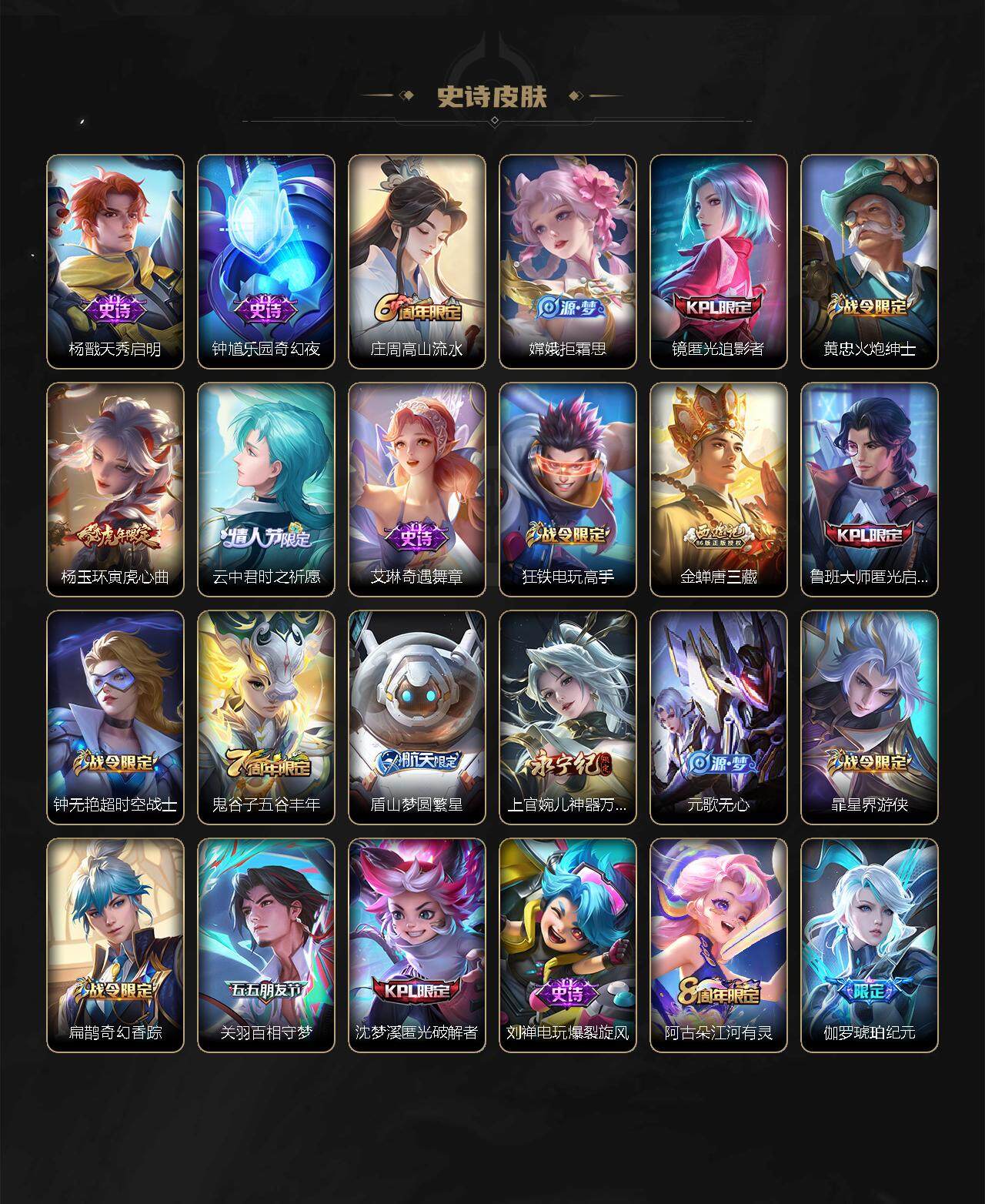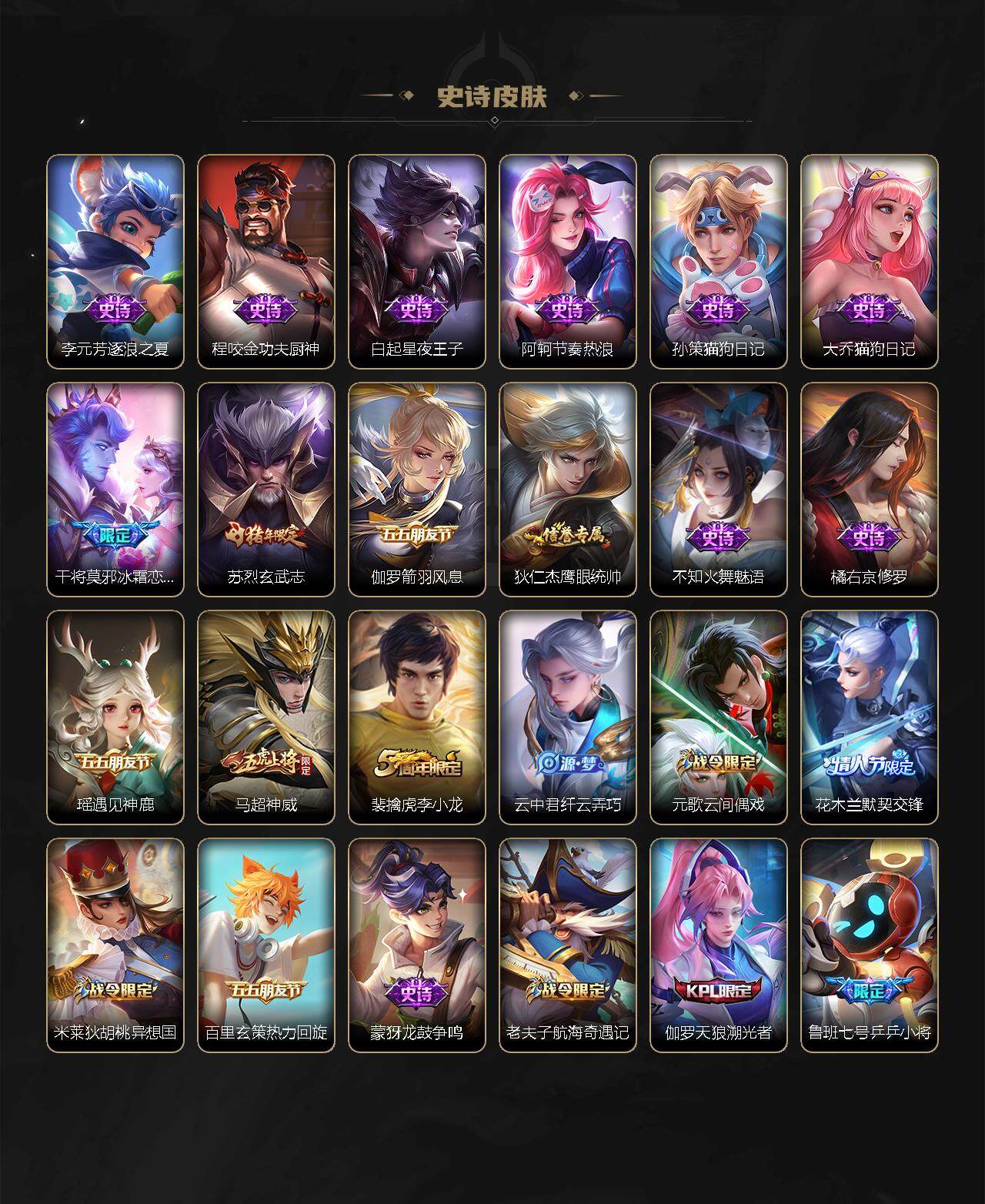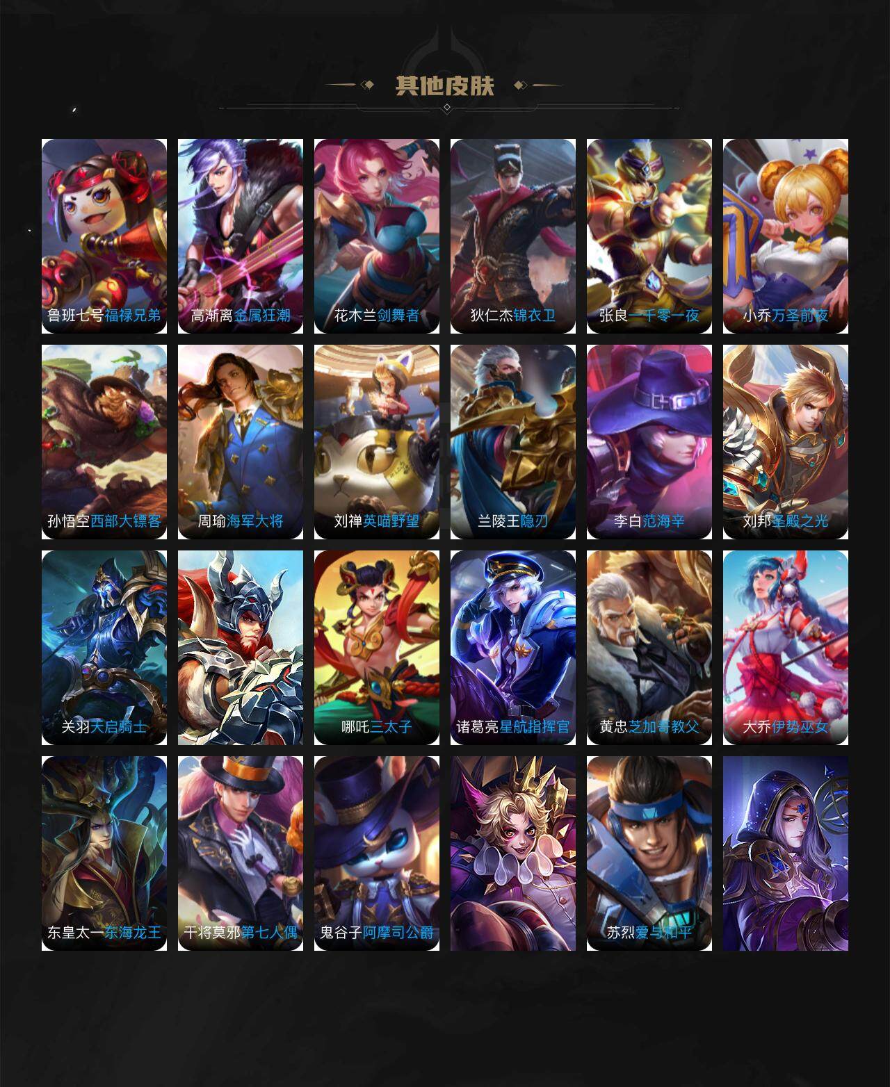 【限定皮肤】:白起狰,蒙犽顽岩魄,姜子牙天穹之誓,狄仁杰阴阳师,虞姬凯尔特女王,赵云皇家上将,墨子神迹守卫,嬴政优雅恋人,孙尚香蔷薇恋人,鲁班七号乒乒小将,庄周高山流水,钟无艳超时空战士,扁鹊炼金王,扁鹊奇幻香踪,芈月幻夜卜梦,元歌云间偶戏,元歌无心,夏侯惇朔风刀,甄姬游园惊梦,甄姬落雪兰心,曹操烛龙,典韦穷奇,马可波罗深海之息,狄仁杰魔术师,狄仁杰万华元夜,达摩星际陆战队,达摩沙漠行僧,项羽海滩派对,老夫子醍醐杖,老夫子航海奇遇记,关羽百相守梦,安琪拉魔法小厨娘,程咬金演武夺筹,王昭君午后时光,王昭君星穹之声,兰陵王金庭之子,花木兰默契交锋,娜可露露前尘镜,亚瑟潮玩骑士王,孙悟空至尊宝,牛魔御旌,后羿无尽星芒,李元芳云中旅人,钟馗驱傩正仪,杨玉环寅虎心曲,杨戬潮玩骑兵,干将莫邪冰霜恋舞曲,太乙真人饕餮,鬼谷子原初探秘者,鬼谷子五谷丰年,诸葛亮时雨天司,黄忠火炮绅士,苏烈玄武志,苏烈千军破阵,弈星混沌棋,公孙离蜜橘之夏,沈梦溪大漠名商,沈梦溪匿光破解者,明世隐疑决卦,裴擒虎李小龙,裴擒虎寅虎赤拳,裴擒虎擒涛扼浪,狂铁御狮,狂铁电玩高手,米莱狄御霄,米莱狄胡桃异想国,云中君纤云弄巧,云中君时之祈愿,伽罗天狼溯光者,盾山御銮,盾山梦圆繁星,上官婉儿神器万象笔,嫦娥拒霜思,嫦娥暖冬兔眠,曜李逍遥 ,鲁班大师匿光启智者,鲁班大师探海日志,镜匿光追影者,桑启海盐诗旅,夏洛特浮生妄,金蝉唐三藏,暃星界游侠,云缨鹤归松栖,阿古朵江河有灵,张良古海寻踪,鬼谷子天穹祈灯,伽罗琥珀纪元,铠琥珀纪元,刘邦剑破天穹,程咬金群星魔术团,芈月浮光幕影,周瑜熔金海岸