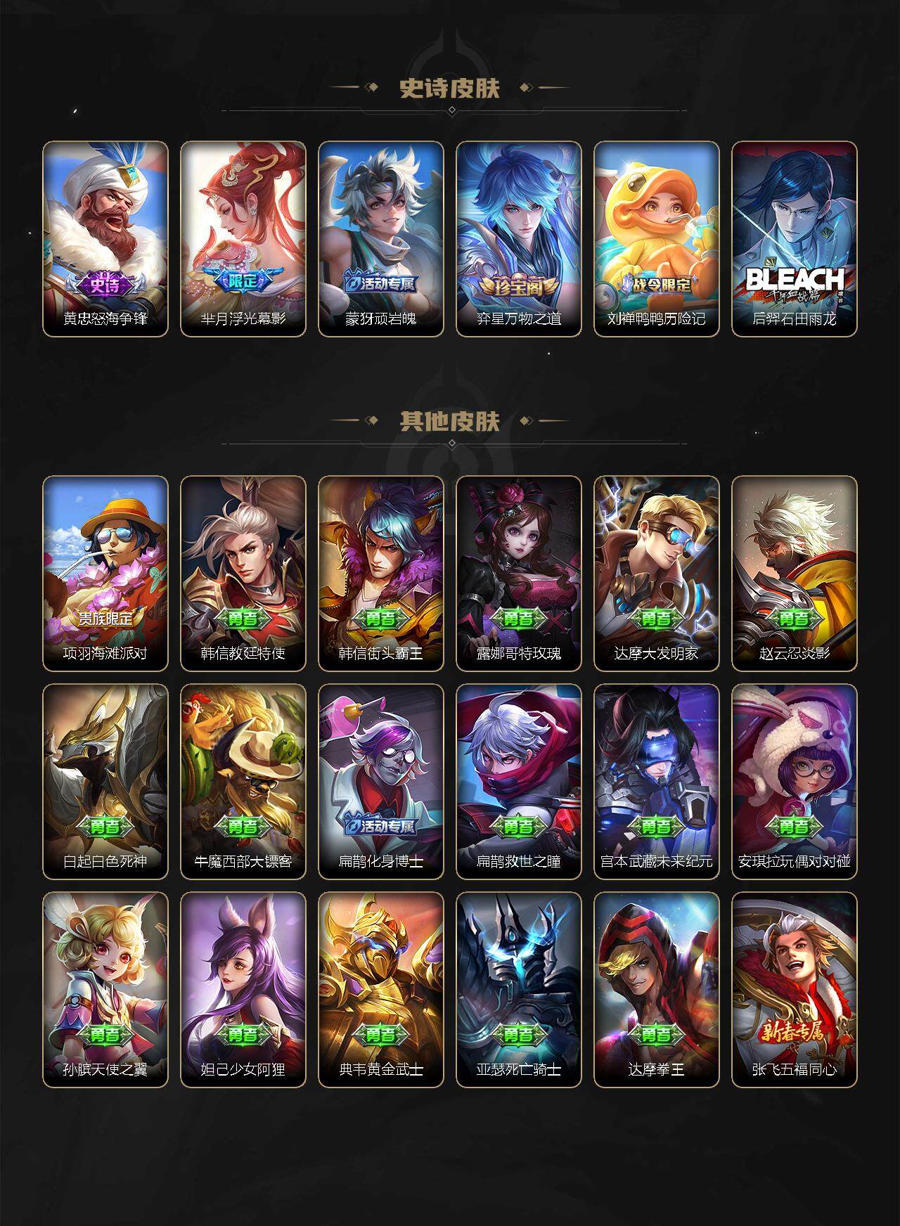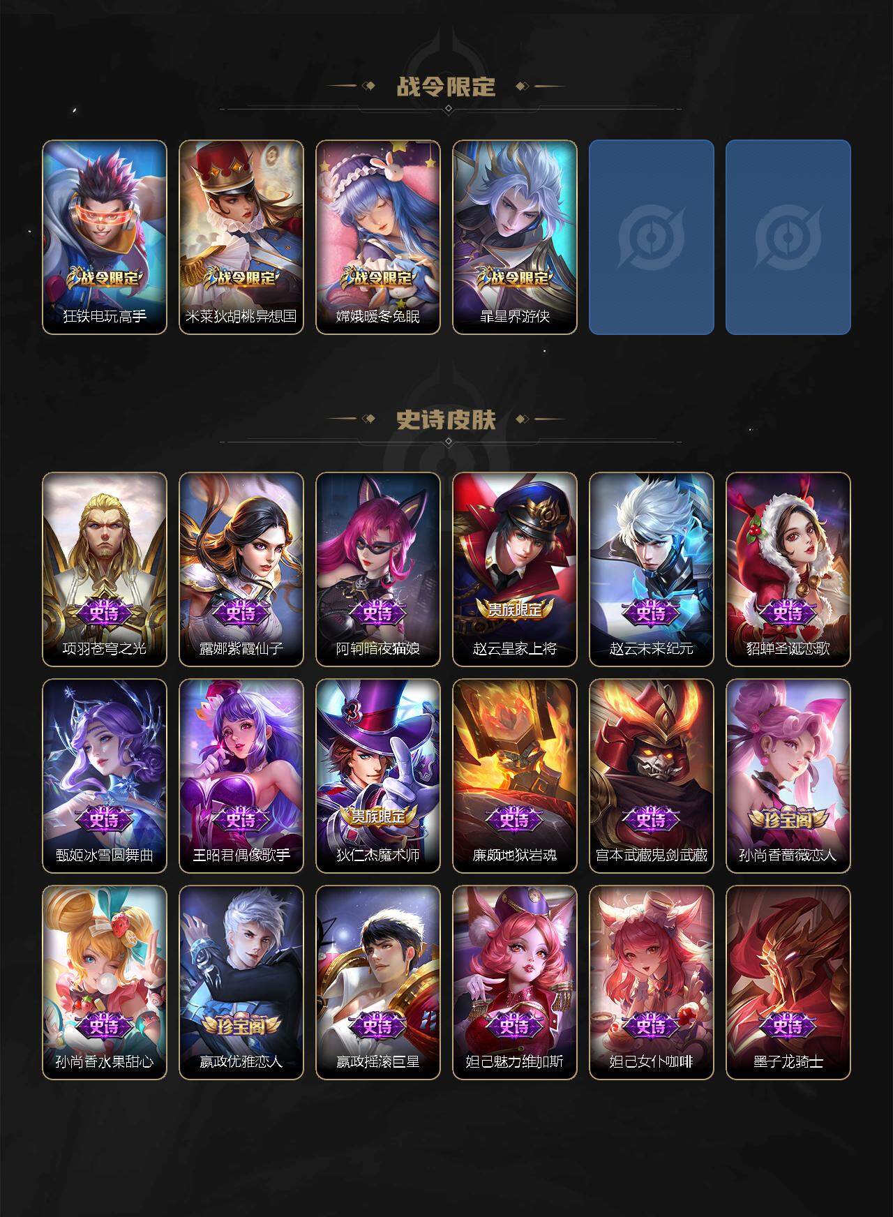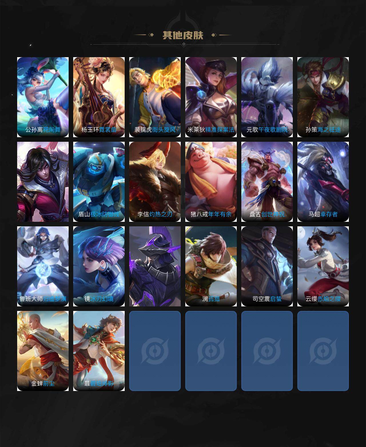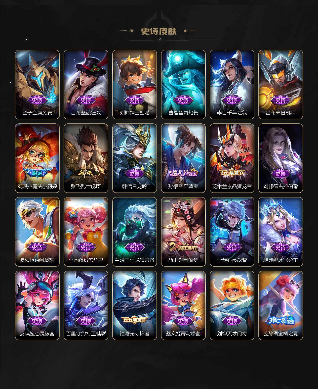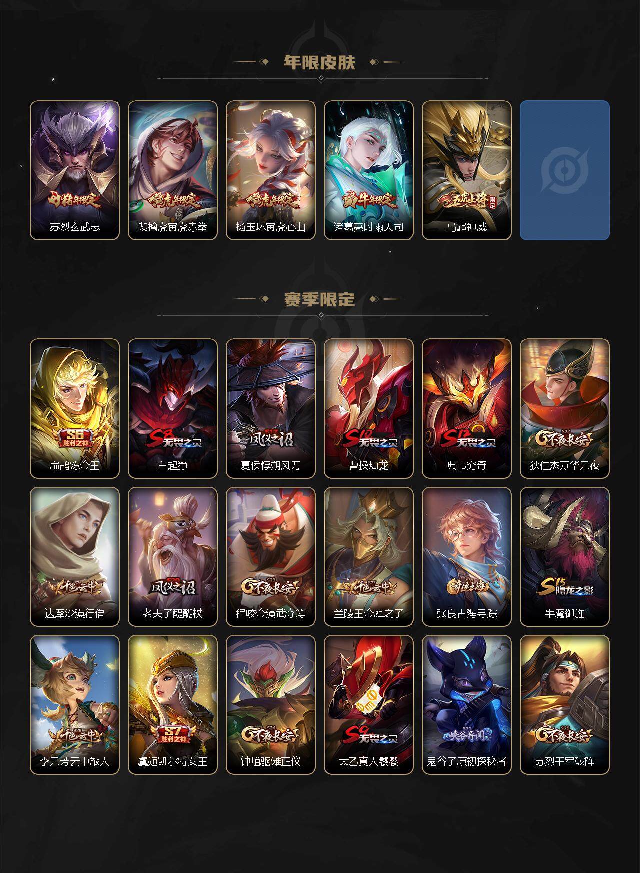 【限定皮肤】:白起狰,蒙犽顽岩魄,姜子牙天穹之誓,狄仁杰阴阳师,虞姬凯尔特女王,赵云皇家上将,墨子神迹守卫,嬴政优雅恋人,孙尚香蔷薇恋人,鲁班七号乒乒小将,庄周高山流水,钟无艳超时空战士,扁鹊炼金王,扁鹊奇幻香踪,芈月幻夜卜梦,元歌云间偶戏,元歌无心,夏侯惇朔风刀,甄姬游园惊梦,甄姬落雪兰心,曹操烛龙,典韦穷奇,马可波罗深海之息,狄仁杰魔术师,狄仁杰万华元夜,达摩星际陆战队,达摩沙漠行僧,项羽海滩派对,老夫子醍醐杖,老夫子航海奇遇记,关羽百相守梦,安琪拉魔法小厨娘,程咬金演武夺筹,王昭君午后时光,王昭君星穹之声,兰陵王金庭之子,花木兰默契交锋,娜可露露前尘镜,亚瑟潮玩骑士王,孙悟空至尊宝,牛魔御旌,后羿无尽星芒,李元芳云中旅人,钟馗驱傩正仪,杨玉环寅虎心曲,杨戬潮玩骑兵,干将莫邪冰霜恋舞曲,太乙真人饕餮,鬼谷子原初探秘者,鬼谷子五谷丰年,诸葛亮时雨天司,黄忠火炮绅士,苏烈玄武志,苏烈千军破阵,弈星混沌棋,公孙离蜜橘之夏,沈梦溪大漠名商,沈梦溪匿光破解者,明世隐疑决卦,裴擒虎李小龙,裴擒虎寅虎赤拳,裴擒虎擒涛扼浪,狂铁御狮,狂铁电玩高手,米莱狄御霄,米莱狄胡桃异想国,云中君纤云弄巧,云中君时之祈愿,伽罗天狼溯光者,盾山御銮,盾山梦圆繁星,上官婉儿神器万象笔,嫦娥拒霜思,嫦娥暖冬兔眠,曜李逍遥 ,鲁班大师匿光启智者,鲁班大师探海日志,镜匿光追影者,桑启海盐诗旅,夏洛特浮生妄,金蝉唐三藏,暃星界游侠,云缨鹤归松栖,阿古朵江河有灵,张良古海寻踪,鬼谷子天穹祈灯,伽罗琥珀纪元,铠琥珀纪元,刘邦剑破天穹,程咬金群星魔术团,芈月浮光幕影,周瑜熔金海岸