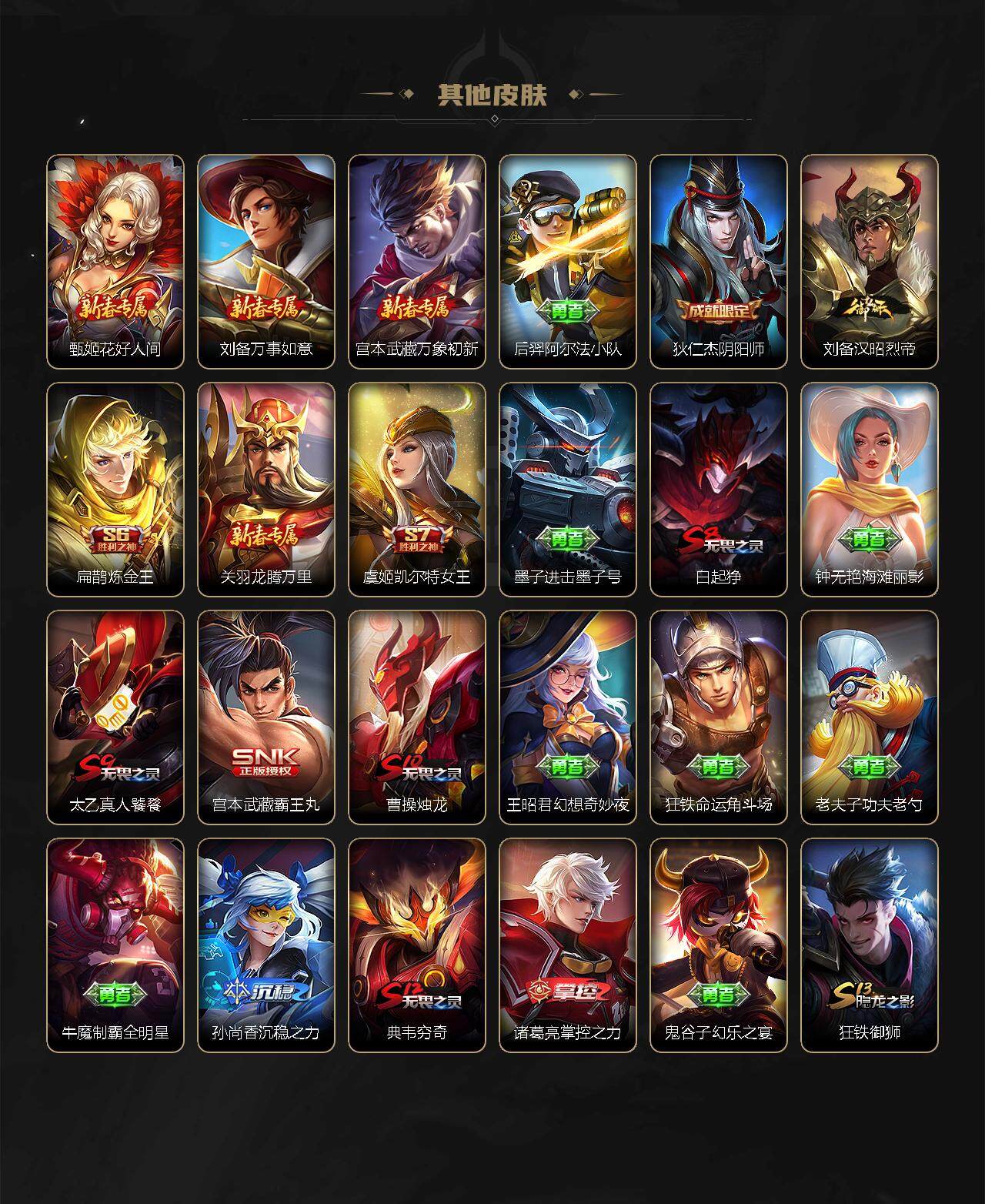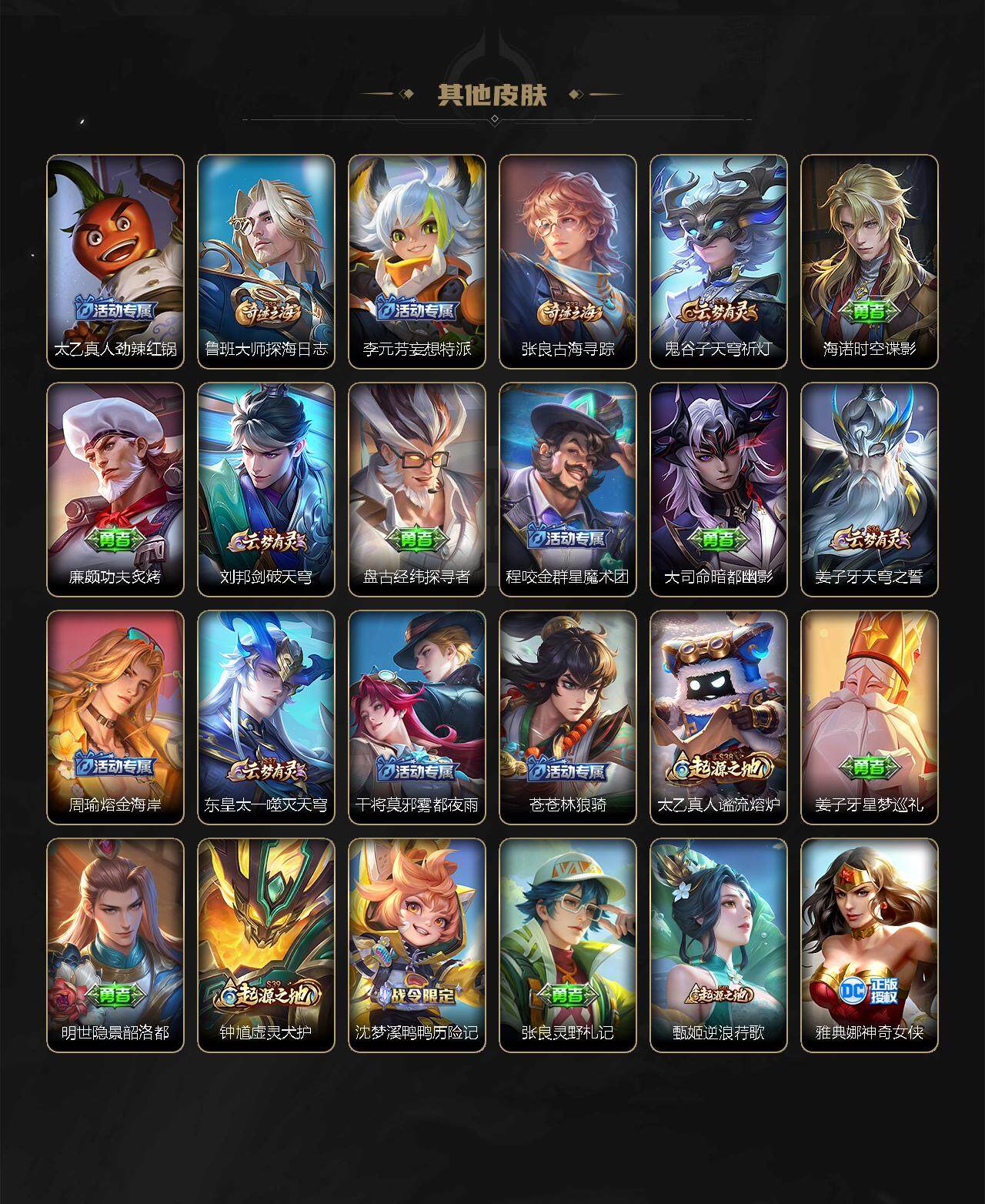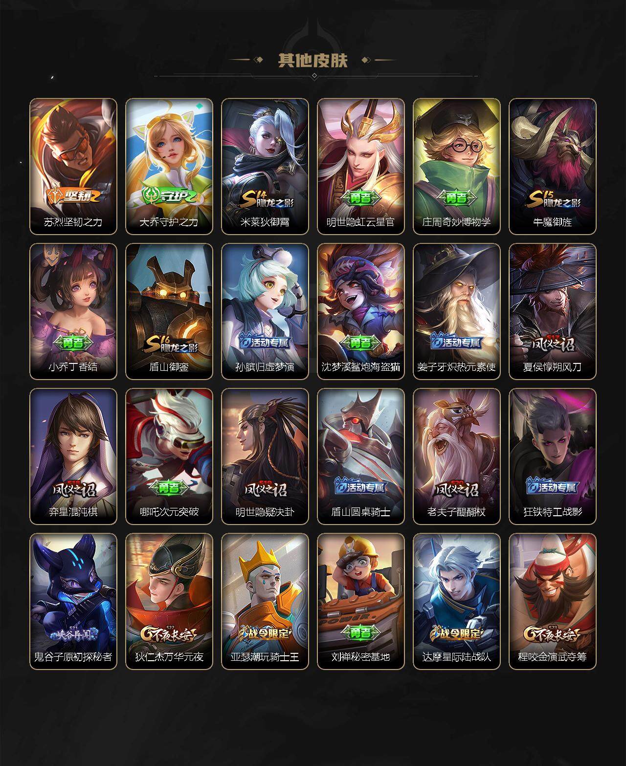 裴擒虎李小龙,诸葛亮时雨天司,马超神威,伽罗天狼溯光者,苏烈玄武志,花木兰默契交锋,孙悟空至尊宝,雅典娜神奇女侠,干将莫邪冰霜恋舞曲,公孙离蜜橘之夏,安琪拉魔法小厨娘,鲁班七号乒乒小将,镜匿光追影者,杨玉环寅虎·心曲,裴擒虎寅虎·赤拳,云中君时之祈愿,后羿无尽星芒,马可波罗深海之息,金蝉唐三藏,娜可露露前尘镜,鲁班大师匿光启智者,王昭君星穹之声,上官婉儿神器·万象笔,盾山梦圆繁星,桑启鸣野蒿