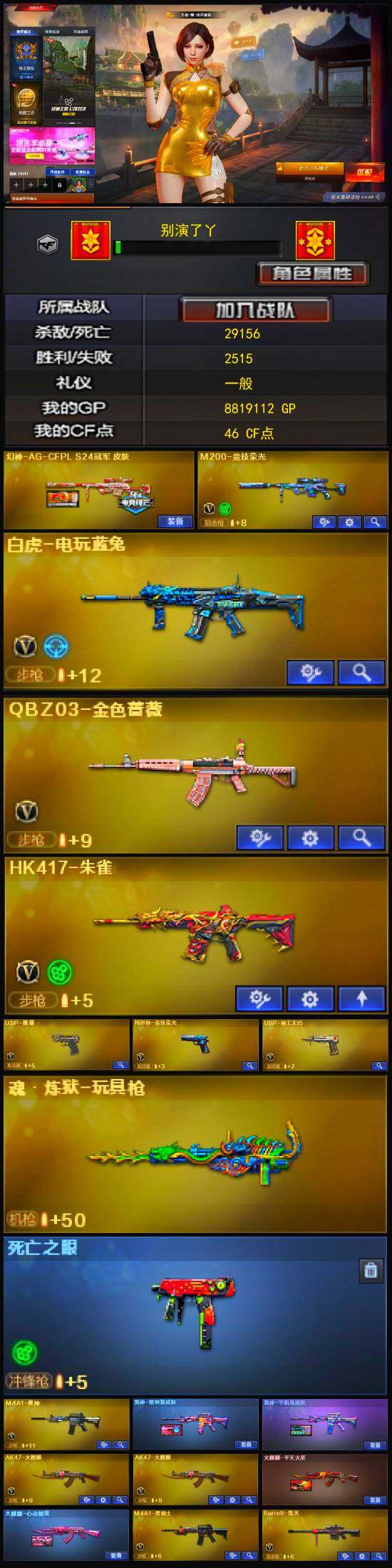 - PX_2089369-??幻神三件套+3皮肤)cf东部/江苏1区/34v/m200幻神+电流骇客+丹凤+曹操+幻神音效卡/g36c幻影/竞技荣光套装/炽芒蝶刃/cop雷霆王者觉醒版/裁决+流光秘银/毁灭/极光/雷神/黑骑士/天启/火麒麟/屠龙/王者魅影(四防)/王者凌霄(四防)/ 5皮可排