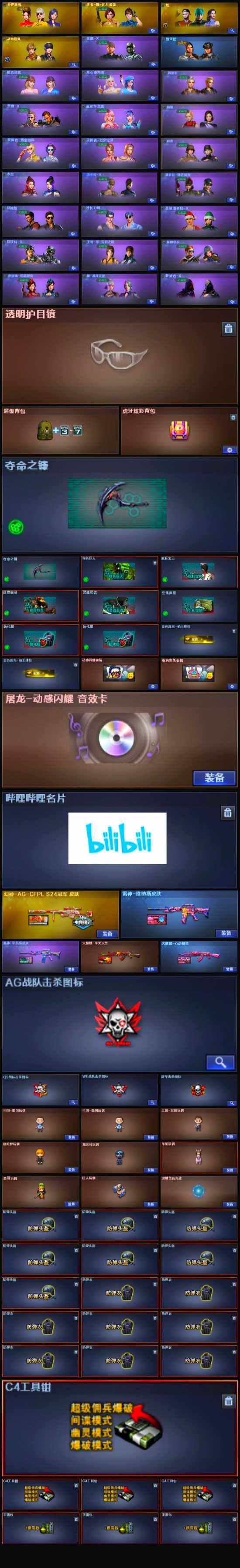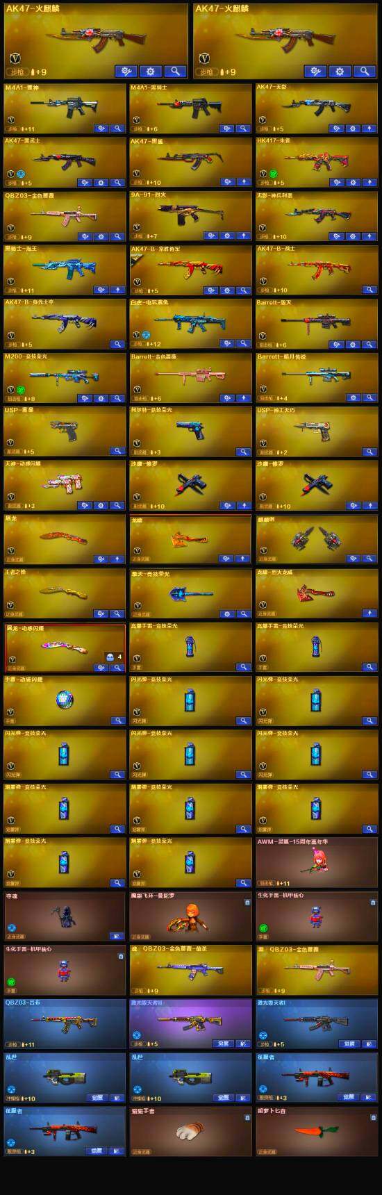 【英雄级武器】:USP-神工天巧,M200-竞技荣光,柯尔特-竞技荣光,擎天-竞技荣光,高爆手雷-竞技荣光*2,烟雾弹-竞技荣光*5,闪光弹-竞技荣光*5,USP-雷暴,天神-动感闪耀,屠龙-动感闪耀,手雷-动感闪耀,QBZ03-金色蔷薇,HK417-朱雀,白虎-电玩蓝兔,无影-神兵利器,M4A1-雷神,M4A1-黑骑士,AK47-无影,AK47-火麒麟*2,AK47-黑武士,Barrett-毁灭,AK47-黑鲨,黑骑士-海王,AK-47-猩红传说*3,AK47-B-常胜将军,沙鹰-修罗*2,麒麟刺,龙啸,屠龙