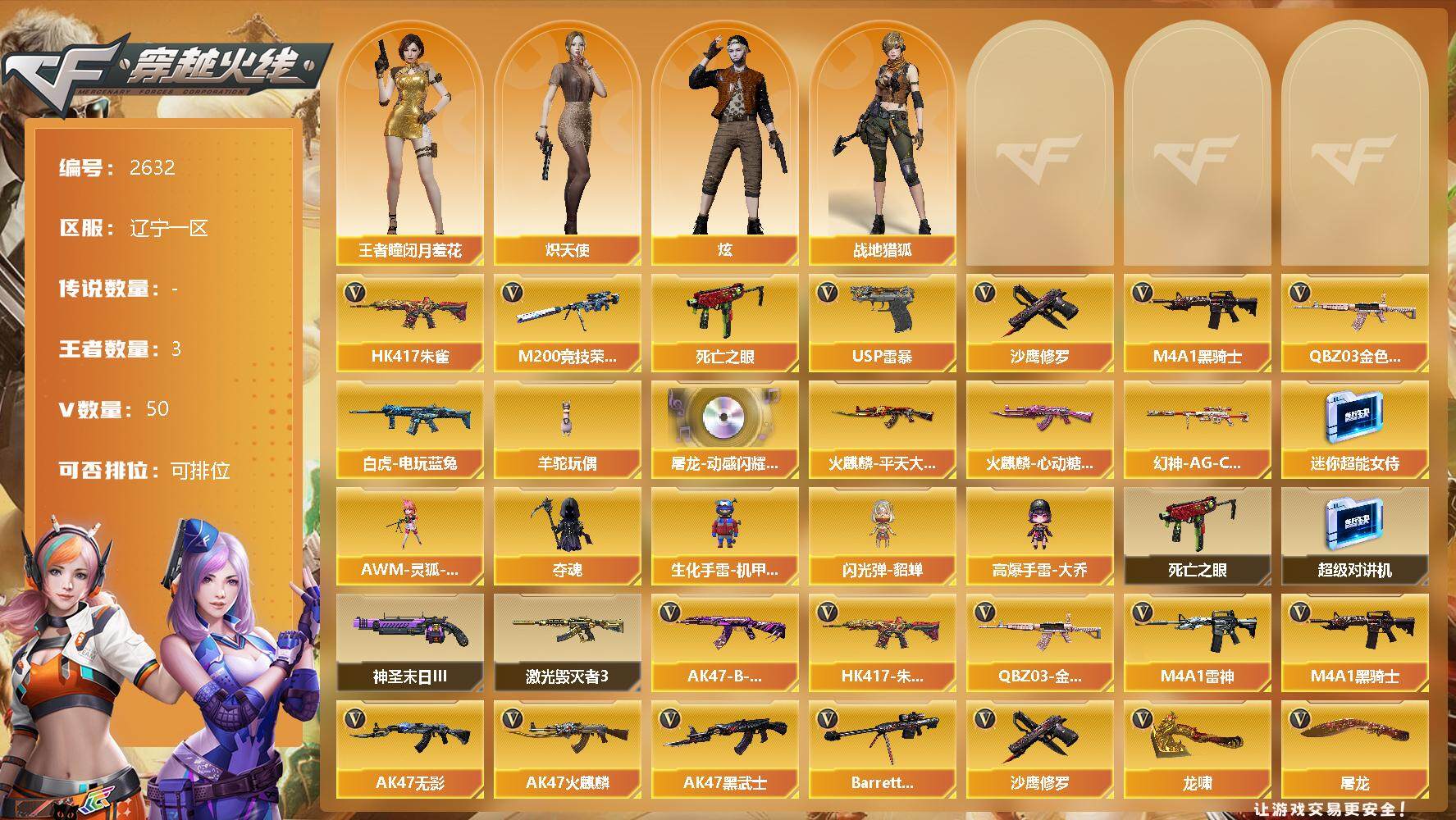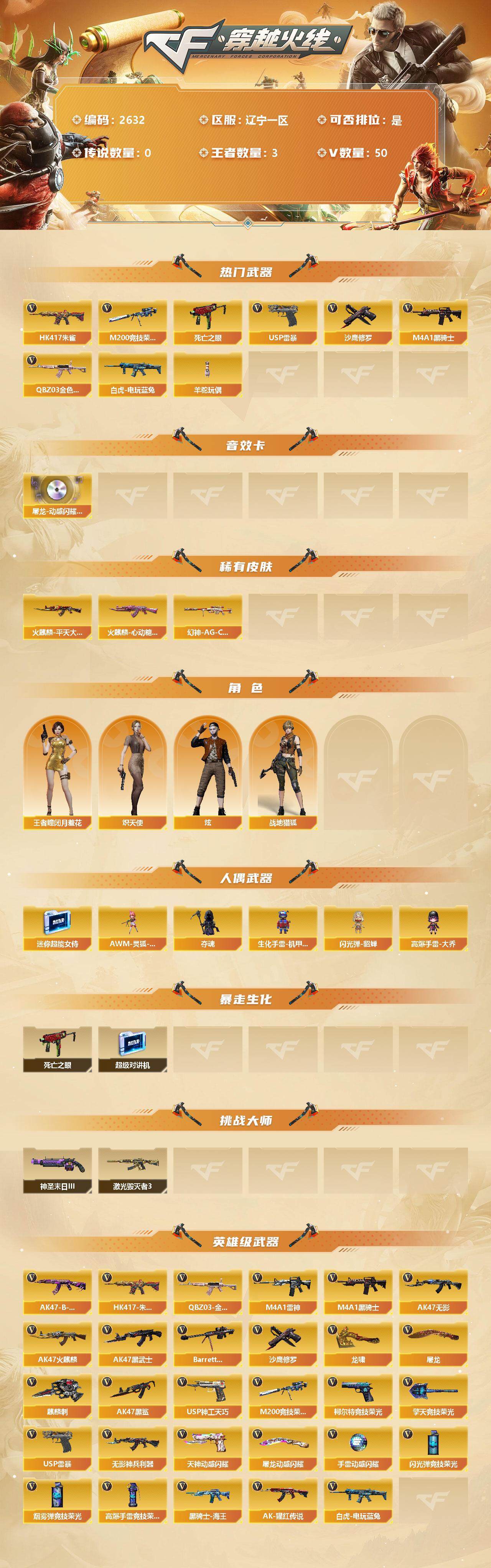 [12449228]【商品标题】:辽宁一区-50V-3王者-0炫金 【热门武器】:QBZ03-金色蔷薇,HK417-朱雀,M200-竞技荣光,死亡之眼,白虎-电玩蓝兔,M4A1-黑骑士,羊驼玩偶,USP-雷暴,沙鹰-修罗*2 【音效卡】:屠龙-动感闪耀 音效卡 【稀有皮肤】:幻神-AG-CFPL S24冠军 皮肤,火麒麟-平天大圣,火麒麟-心动糖果 【角色】:王者-瞳-闭月羞花,炫,战地猎狐,炽天使 【人偶武器】:AWM-灵狐-15周年嘉年华,迷你超能女侍,夺魂,生化手雷-机甲核心*2,闪光弹-貂蝉,高爆手雷-大乔 【暴走生化】:死亡之眼,超级对讲机 【挑战大师】:神圣爆裂者-末日III,激光毁灭者III 【英雄级武器】:USP-神工天巧,M200-竞技荣光,柯尔特-竞技荣光,擎天-竞技荣光,高爆手雷-竞技荣光*2,烟雾弹-竞技荣光*5,闪光弹-竞技荣光*5,USP-雷暴,天神-动感闪耀,屠龙-动感闪耀,手雷-动感闪耀,QBZ03-金色蔷薇,HK417-朱雀,白虎-电玩蓝兔,无影-神兵利器,M4A1-雷神,M4A1-黑骑士,AK47-无影,AK47-火麒麟*2,AK47-黑武士,Barrett-毁灭,AK47-黑鲨,黑骑士-海王,AK-47-猩红传说*3,AK47-B-常胜将军,沙鹰-修罗*2,麒麟刺,龙啸,屠龙 【特殊枪械】:1黑骑士