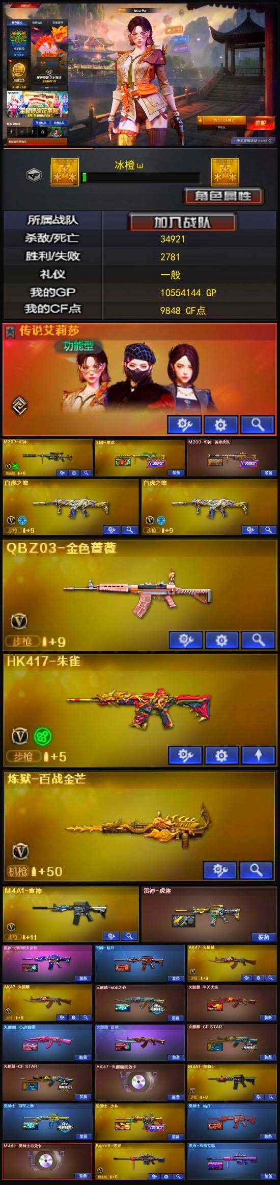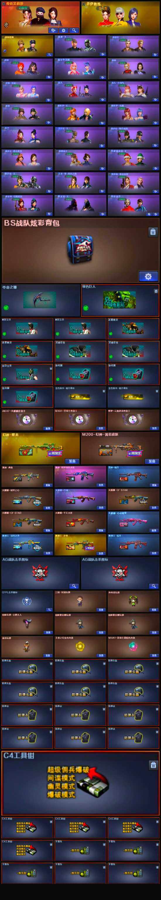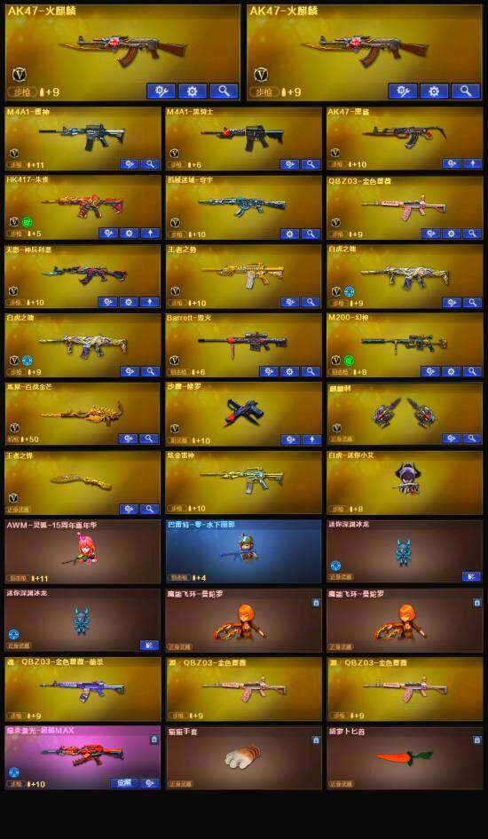 【英雄级武器】:QBZ03-金色蔷薇,HK417-朱雀,无影-神兵利器,M4A1-雷神,M4A1-黑骑士,AK47-火麒麟*2,Barrett-毁灭,M200-幻神,AK47-黑鲨,M4A1-赤狱骑士,沙鹰-修罗,麒麟刺
