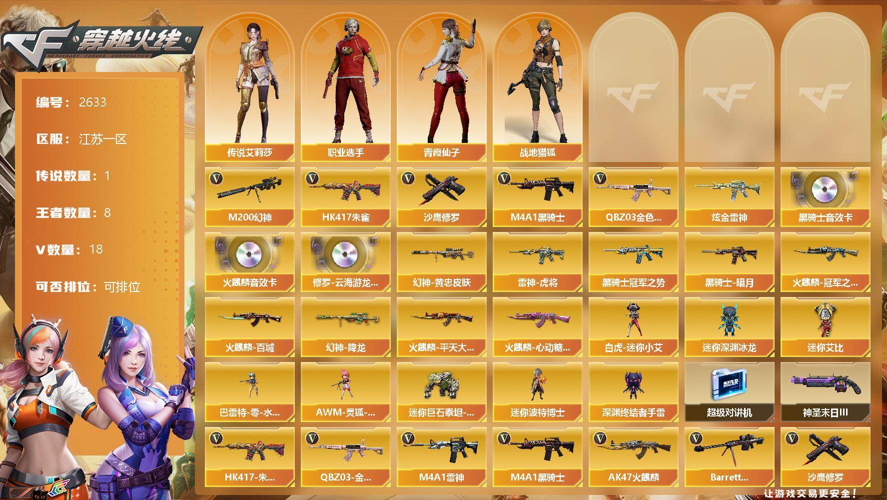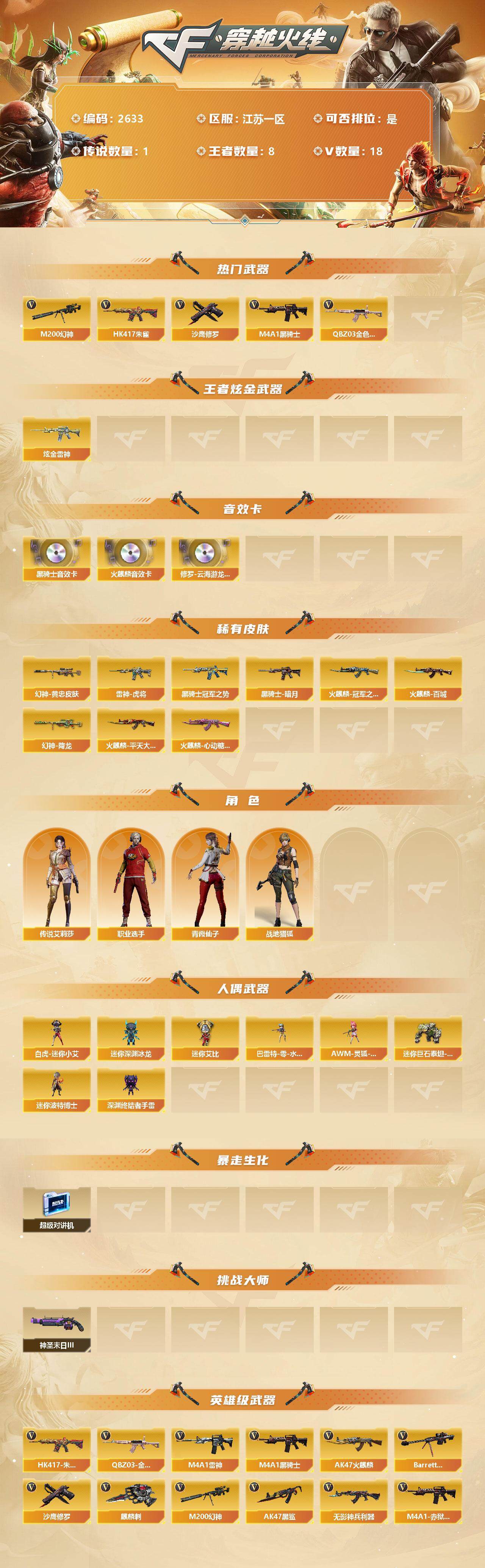 [12449333]【商品标题】:江苏一区-18V-8王者-1炫金 【传说角色】:传说艾莉莎 【热门武器】:QBZ03-金色蔷薇,HK417-朱雀,M200-幻神,M4A1-黑骑士,沙鹰-修罗 【王者炫金武器】:炫金雷神 【音效卡】:修罗-云海游龙音效卡,AK47-火麒麟音效卡,M4A1-黑骑士音效卡 【稀有皮肤】:M200-幻神-黄忠皮肤,幻神-降龙,雷神-虎将,火麒麟-冠军之心,火麒麟-平天大圣,火麒麟-百城,火麒麟-心动糖果,黑骑士-暗月,黑骑士-冠军之势 【角色】:传说艾莉莎,战地猎狐,职业选手,青霞仙子 【人偶武器】:白虎-迷你小艾,巴雷特-零-水下丽影,AWM-灵狐-15周年嘉年华,迷你深渊冰龙*2,迷你艾比,迷你巨石泰坦-魔花研究所,迷你波特博士,深渊终结者手雷 【暴走生化】:超级对讲机 【挑战大师】:神圣爆裂者-末日III 【英雄级武器】:QBZ03-金色蔷薇,HK417-朱雀,无影-神兵利器,M4A1-雷神,M4A1-黑骑士,AK47-火麒麟*2,Barrett-毁灭,M200-幻神,AK47-黑鲨,M4A1-赤狱骑士,沙鹰-修罗,麒麟刺 【特殊枪械】:1黑骑士