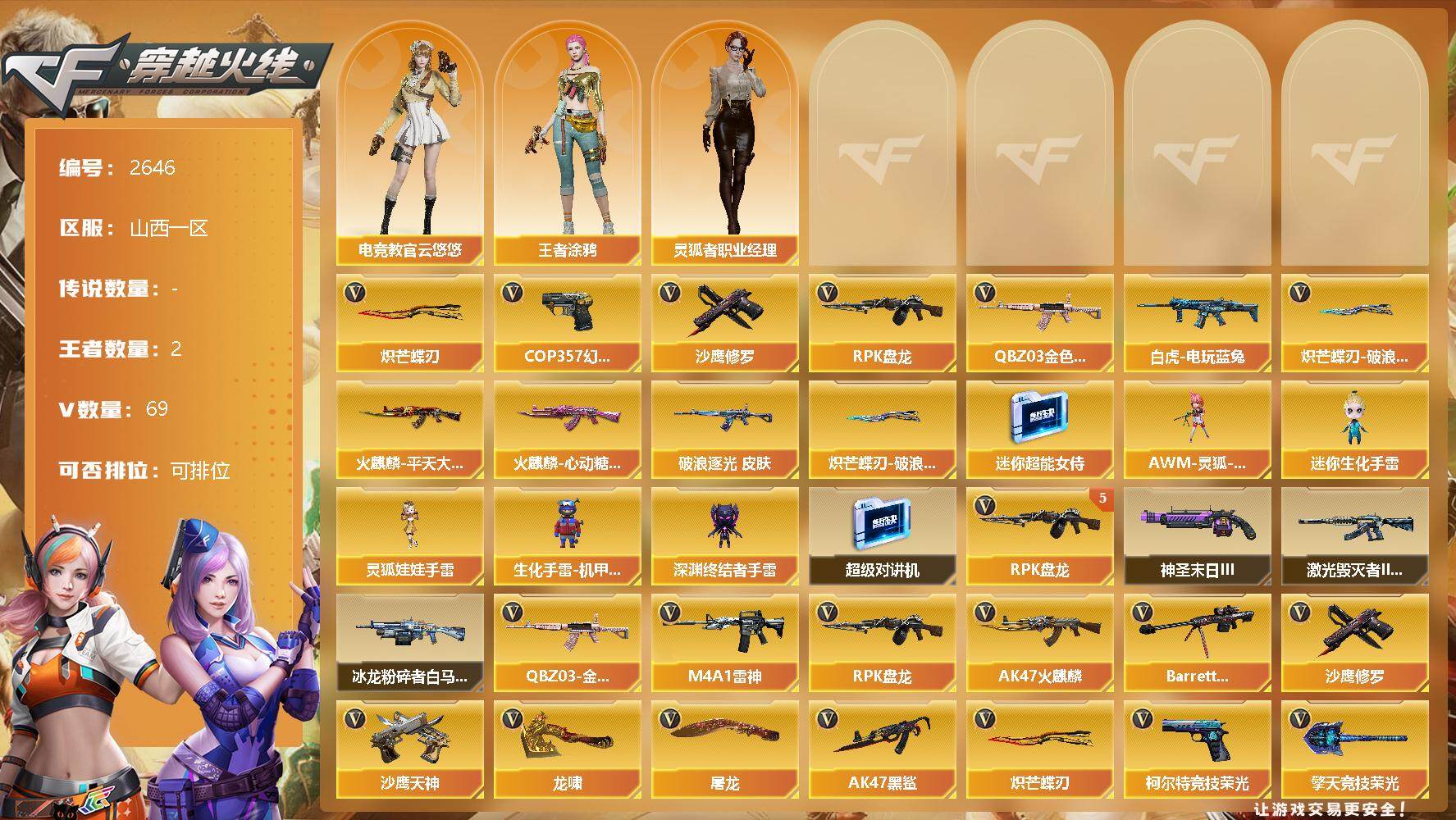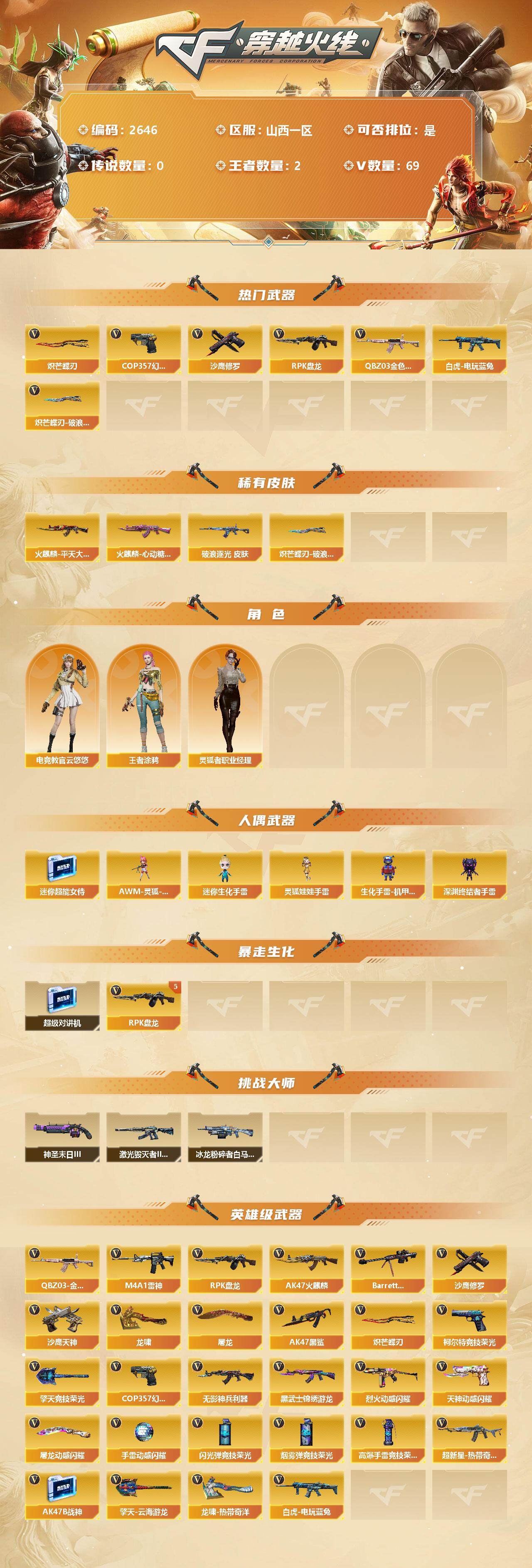 [12449787]【商品标题】:山西一区-69V-2王者-0炫金 【热门武器】:QBZ03-金色蔷薇,白虎-电玩蓝兔,RPK-盘龙*5,COP 357-幻灵,沙鹰-修罗*3,炽芒蝶刃,炽芒蝶刃-破浪逐光 皮肤 【稀有皮肤】:金色蔷薇-破浪逐光 皮肤,火麒麟-平天大圣*2,火麒麟-心动糖果,炽芒蝶刃-破浪逐光 皮肤 【角色】:王者涂鸦,灵狐者-职业经理,电竞教官-云悠悠 【人偶武器】:AWM-灵狐-15周年嘉年华,迷你超能女侍,迷你生化手雷*2,灵狐娃娃手雷,生化手雷-机甲核心,深渊终结者手雷 【暴走生化】:超级对讲机 【挑战大师】:神圣爆裂者-末日III,激光毁灭者III-白马银枪,冰龙粉碎者-白马银枪 【英雄级武器】:柯尔特-竞技荣光,擎天-竞技荣光,高爆手雷-竞技荣光,烟雾弹-竞技荣光,闪光弹-竞技荣光,COP 357-幻灵,烈火-动感闪耀,天神-动感闪耀,屠龙-动感闪耀*2,手雷-动感闪耀,QBZ03-金色蔷薇,白虎-电玩蓝兔,无影-神兵利器,M4A1-雷神*2,RPK-盘龙*5,AK47-火麒麟*2,Barrett-毁灭*2,AK47-黑鲨,黑武士-锦绣游龙,超新星-热带奇洋,AK47-B-战神,沙鹰-天神,沙鹰-修罗*3,炽芒蝶刃,龙啸*4,屠龙,擎天-云海游龙,龙啸-热带奇洋 【特殊枪械】:5盘龙