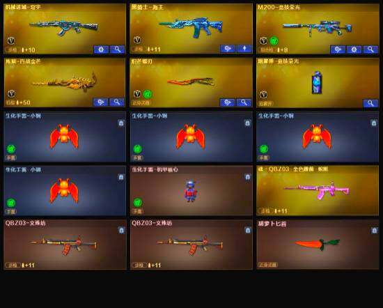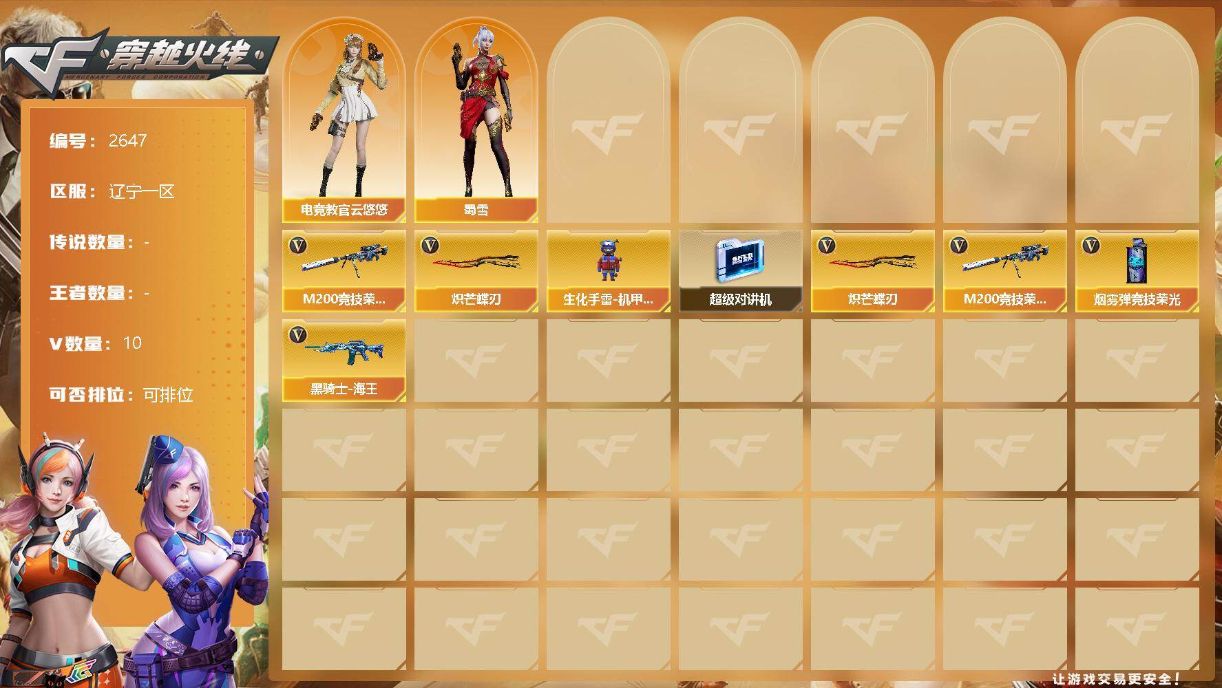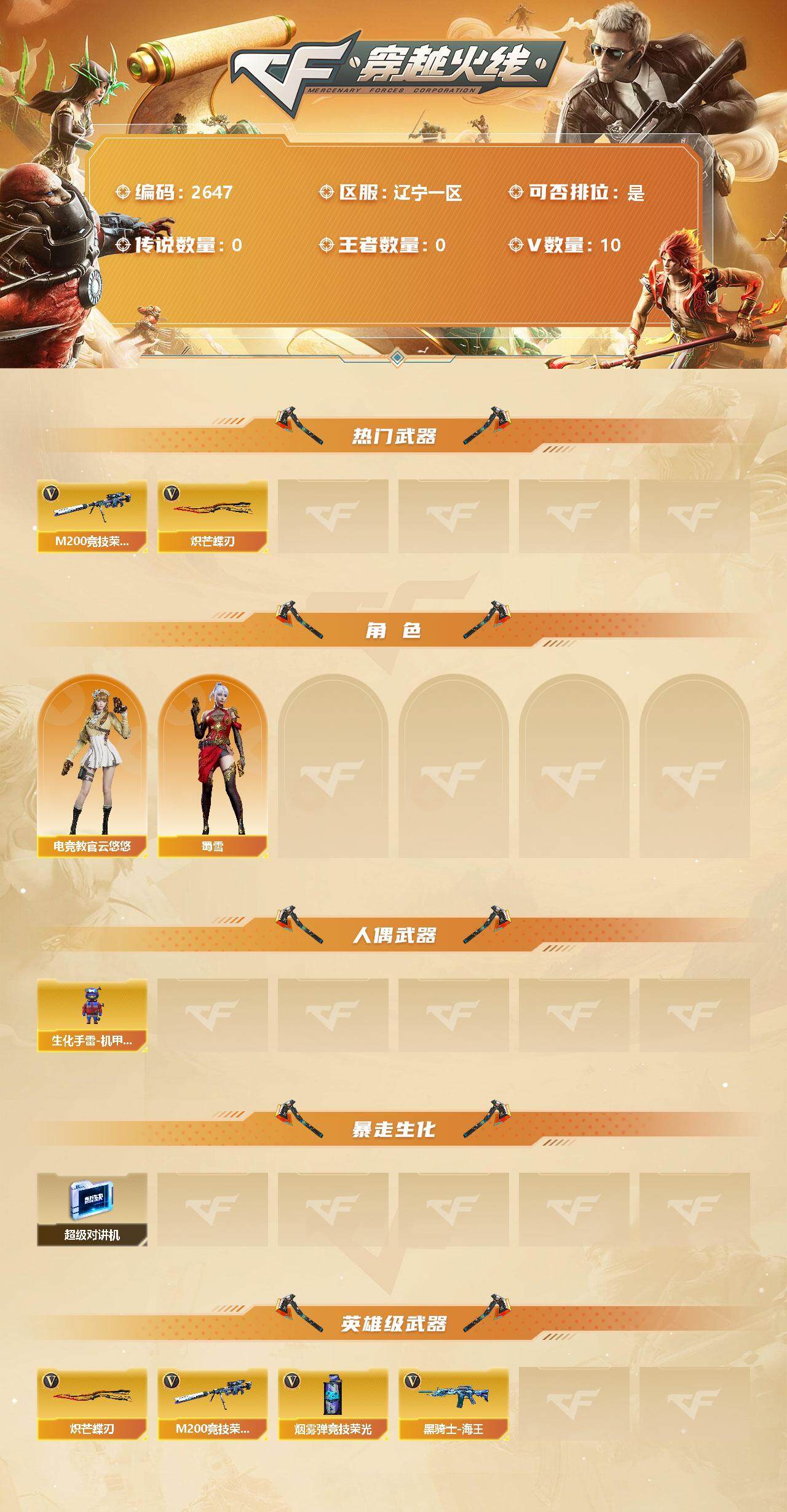 [12449840]【商品标题】:辽宁一区-10V-0王者-0炫金 【热门武器】:M200-竞技荣光,炽芒蝶刃 【角色】:电竞教官-云悠悠,蜀雪 【人偶武器】:生化手雷-机甲核心 【暴走生化】:超级对讲机 【英雄级武器】:M200-竞技荣光,烟雾弹-竞技荣光,黑骑士-海王,炽芒蝶刃 【特殊枪械】: